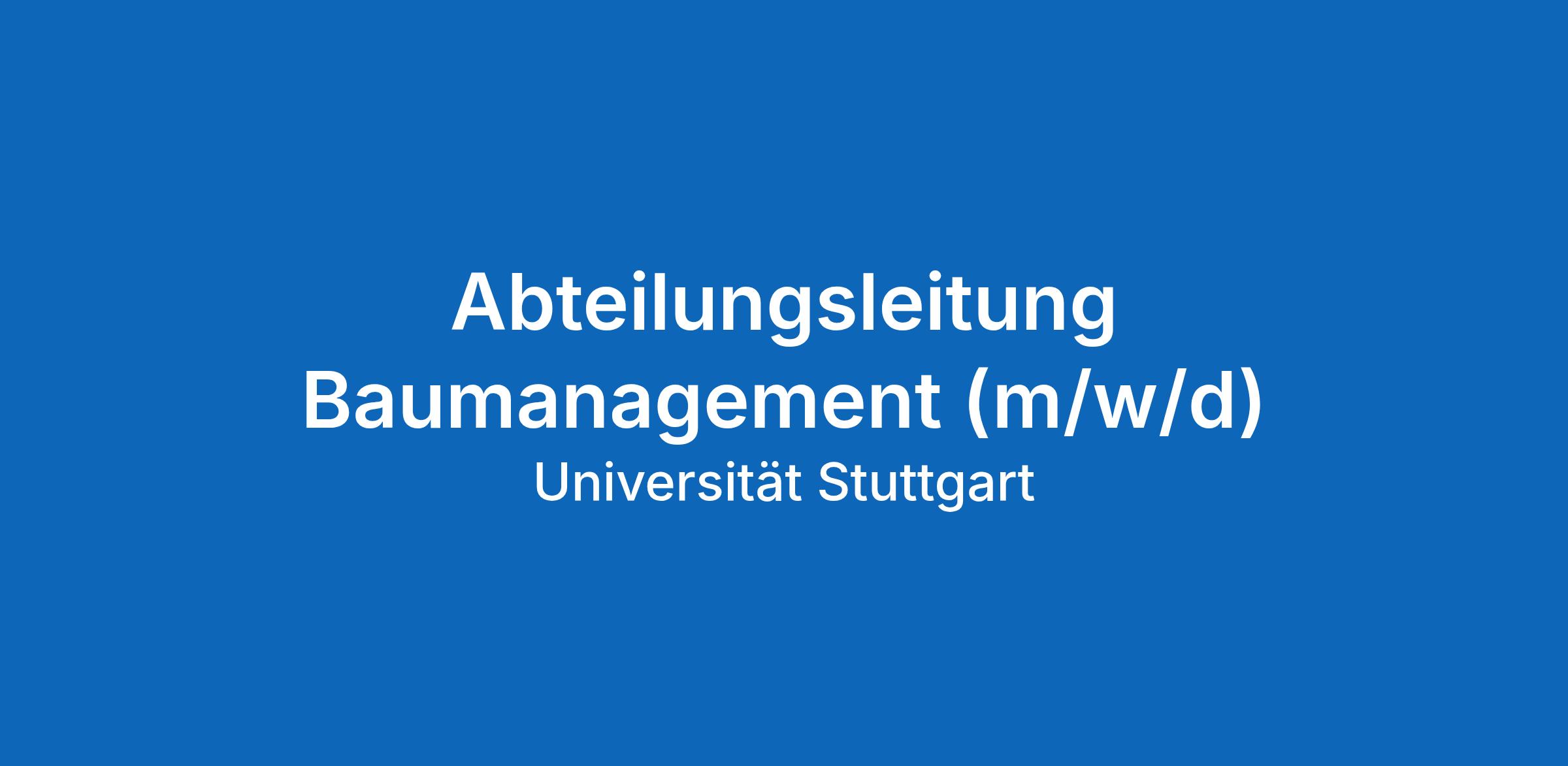 Haben wir Ihr Interesse geweckt? Dann senden Sie Ihre vollständige Bewerbung (Anschreiben, Lebenslauf, relevante Zeugnisse) in einer PDF-Datei per E-Mail an: bewerbungen-fm@verwaltung.uni-stuttgart.de. Betreff: „Abteilungsleitung Baumanagement (m/w/d)“, Bewerbungsschluss: 04. Mai 2026. Diskretion und Vertraulichkeit sind garantiert. Weitere Informationen zum Datenschutz finden Sie hier. Leider können wir keine Bewerbungs- oder Vorstellungskosten erstatten.