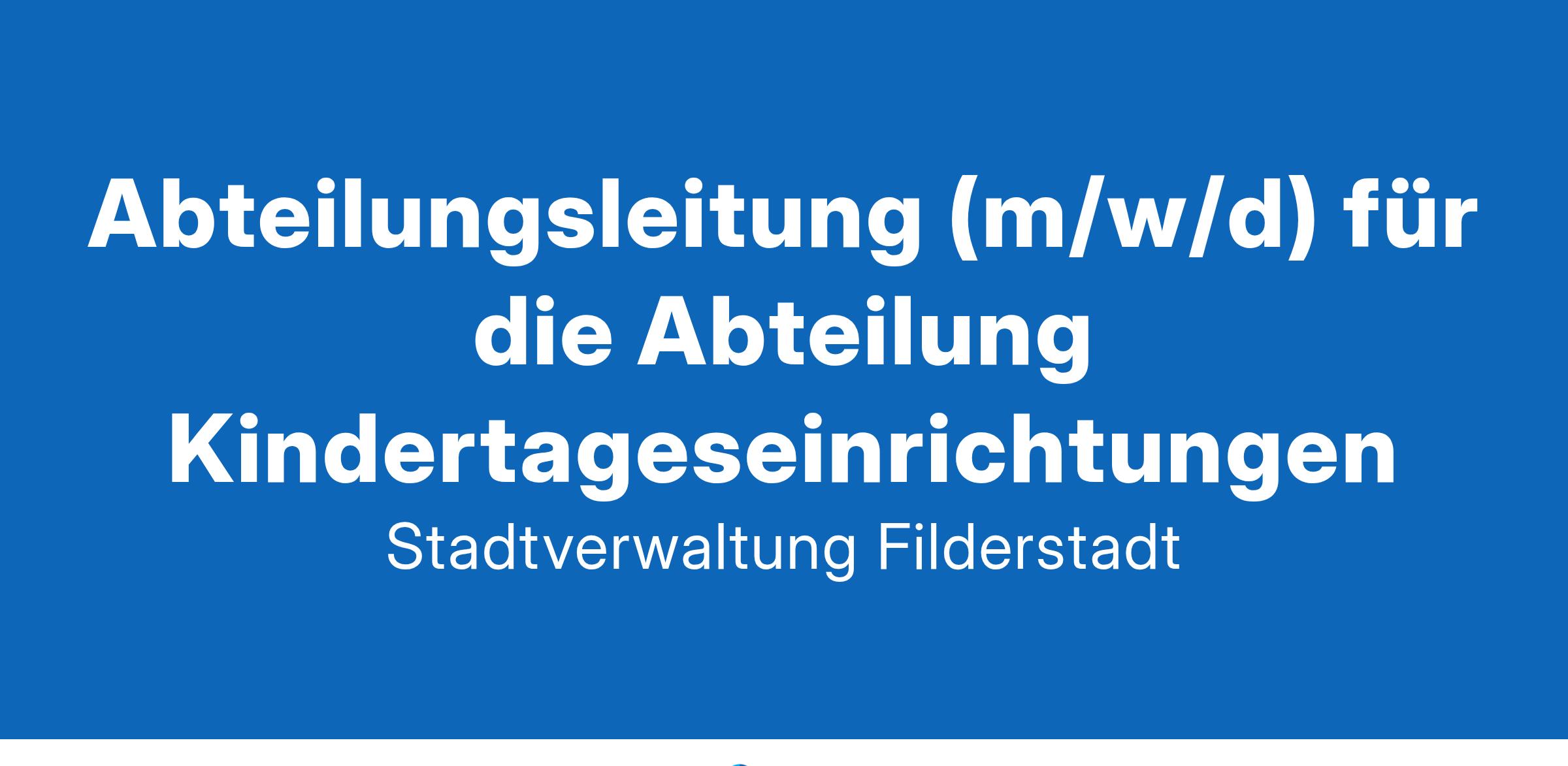 Die Stadtverwaltung Filderstadt sucht für das Amt für Kinderbetreuung und Schulen zum nächstmöglichen Zeitpunkt eine Abteilungsleitung (m/w/d) für die Abteilung Kindertageseinrichtungen Ihr Aufgabengebiet: Personalverantwortung für die Mitarbeiter*innen der Abteilung, die etwa 260 pädagogischen und hauswirtschaftlichen Mitarbeiter*innen in den Kindertageseinrichtungen sowie die 23 Mitarbeiter*innen in der Schulsprachförderung Bewerbungsauswahl im pädagogischen Bereich und Führen von Vorstellungsgesprächen Einsatzplanung der Mitarbeiter*innen in den städtischen Kindertageseinrichtungen Jährliche Bedarfsplanung Haushaltsplanung der zugeordneten Bereiche Zusammenarbeit mit den freien und kirchlichen Trägern und mit dem Tageselternverein Kreis Esslingen Umsetzung verschiedener pädagogischer Konzepte, wie der Vorurteilsbewussten Erziehung und Bildung und dem Filderstädter Sprachkonzept, in den städtischen Kindertageseinrichtungen Ihr Profil: Bachelor-, Master- oder Diplomabschluss im Bereich Public Management oder vergleichbare Studiengänge Verwaltungs- und Führungserfahrung werden vorausgesetzt Überdurchschnittliche Einsatzbereitschaft und ein hohes Maß an Kooperations-, Verhandlungs- und Sozialkompetenz Konzeptionelle und strategische Planung und Handlung Großes persönliches Engagement, Durchsetzungsvermögen und Eigeninitiative sowie die Fähigkeit, Mitarbeiter*innen kooperativ und leistungsorientiert zu führen Flexibilität in der Termingestaltung Wir bieten: Arbeitsumfang von 100 % Grundsätzliche Möglichkeit der Stellenteilung Eingruppierung bis Besoldungsgruppe A 12 bzw. bis Entgeltgruppe 12 TVöD Umfangreiche individuelle Fortbildungsangebote und betriebliches Gesundheitsmanagement Verantwortungsvolle, interessante und vielseitige Tätigkeit in einem abwechslungsreichen Aufgabengebiet Vorteilsportal mit einer Vielzahl von Angeboten für Mitarbeitende Volle Kostenübernahme des Firmentickets oder JobTickets und Fahrtkostenzuschuss bei der Benutzung des Fahrrades für den Weg zur Arbeit sowie einen Zuschuss für den Fahrradkauf bzw. das Fahrradleasing Die Stadt Filderstadt fördert die berufliche Chancengleichheit. Schwerbehinderte werden bei gleicher Eignung bevorzugt berücksichtigt. Haben wir Ihr Interesse geweckt? Dann freuen wir uns über Ihre aussagekräftige Bewerbung unter Angabe der Kennziffer 40-01/2025 bis spätestens 14. Februar 2025 über unser Online-Bewerbungsportal. Weitergehende Informationen erhalten Sie von Frau Umstadt unter der Rufnummer 0711 7003-4020. Stadtverwaltung Filderstadt Haupt- und Personalamt Aicher Straße 9 70794 Filderstadt E-Mail: personal@filderstadt.de www.filderstadt.de/Stellenangebote