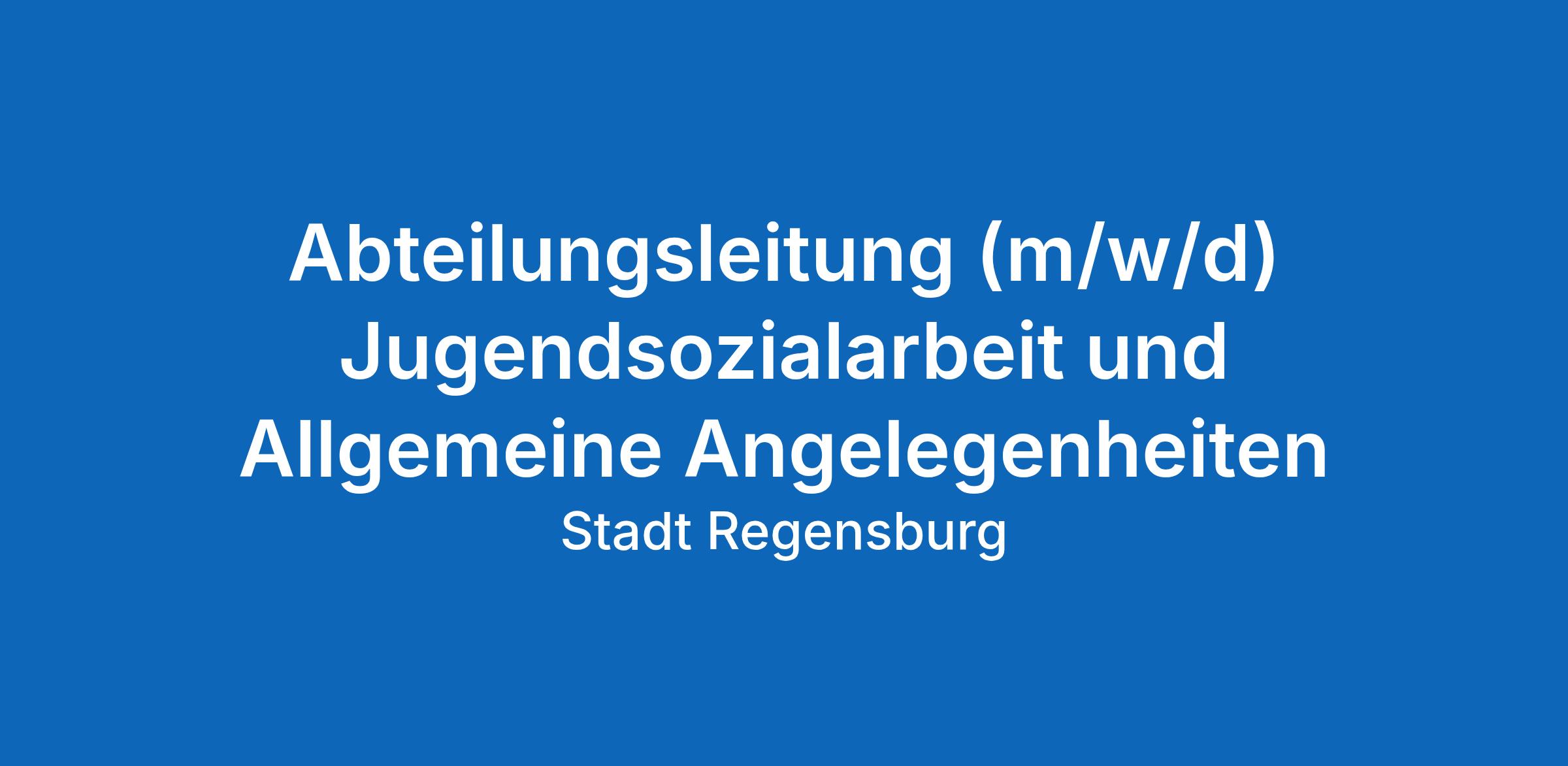 Gemeinsam mit der Stadt Regensburg die Zukunft gestalten! Wir suchen für das Amt für kommunale Jugendarbeit eine Leitung (m/w/d) für die Abteilung Jugendsozialarbeit und Allgemeine Angelegenheiten.