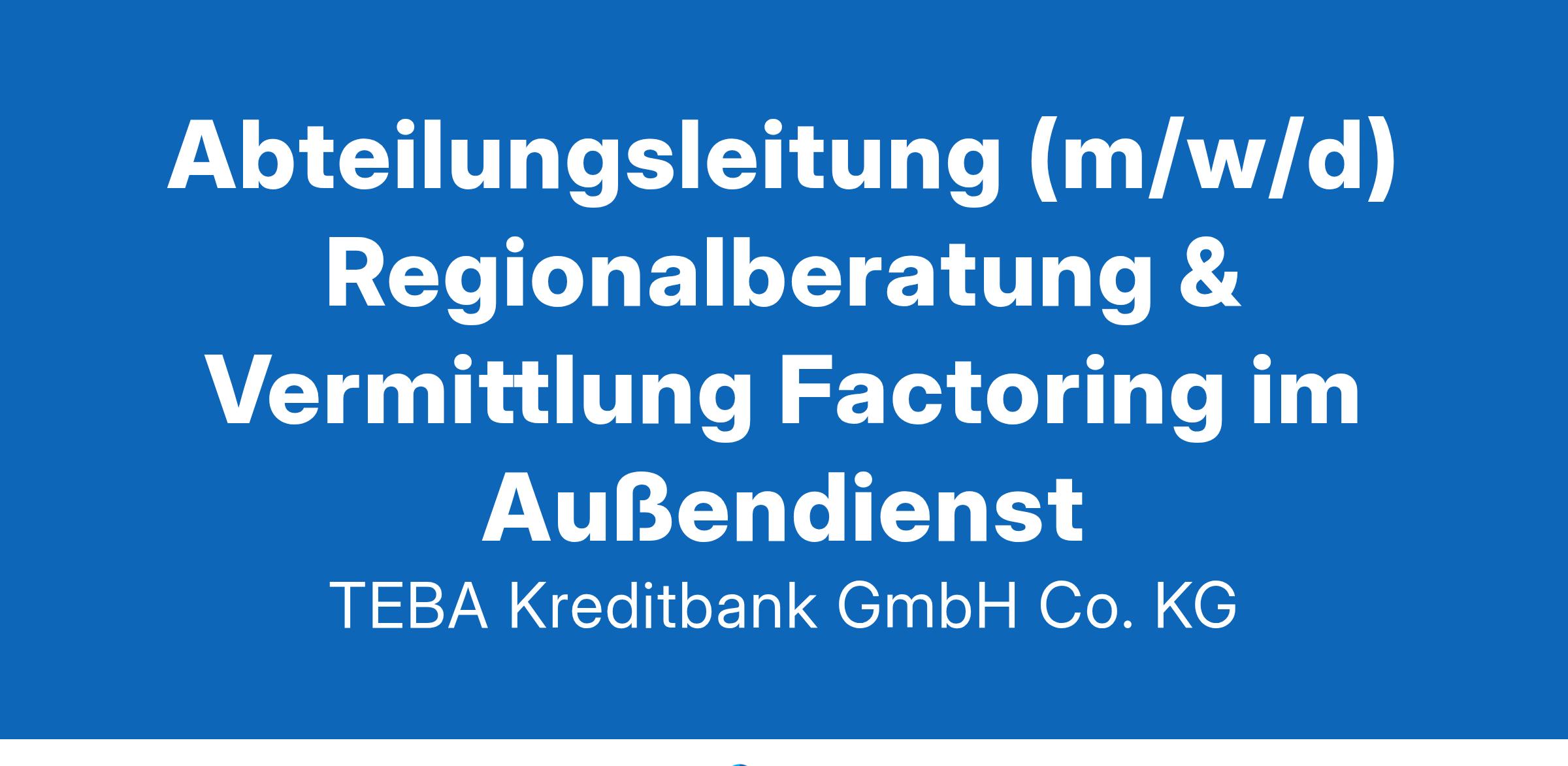 Wir sind eines der erfolgreichsten bundesweit tätigen Factoring-Unternehmen. Als Tochterunternehmen der VR-Bank Landau-Mengkofen eG sind wir ein wichtiger Partner des Mittelstandes (KMU) für Factoring. Außerdem bieten wir maßgeschneiderte Lösungen in der privaten Finanzierung an. Über 190 Mitarbeiter arbeiten am stetig wachsenden Erfolg unserer Bank mit und sorgen für eine sehr hohe Kundenzufriedenheit. Für den weiteren Ausbau unserer erfolgreichen Geschäftsfelder suchen wir zur Unterstützung für unser stetig wachsendes Team eine: ABTEILUNGSLEITUNG (m/w/d) Regionalberatung & Vermittlung Factoring im Außendienst Unsere Bank hat Ihren Firmensitz in der Lindenstr. 5 in 94405 Landau a. d. Isar. Daher ist für uns der vorgesehene Einsatzort in der näheren Umgebung wünschenswert. Zu Ihren Aufgaben gehören Führung der Mitarbeiter Regionalberatung & Vermittlung Factoring Jährliche Zeitplanung der Mitarbeiter auf Basis der TEBA Eckwertplanung und Sicherstellung derer Erreichung Jährliche Provisionsabrechnung der Mitarbeiter und Führen der Jahresgespräche Kundengewinnungs- und Bestandssicherungsmaßnahmen in Abstimmung mit den Factoring-Abteilungen Sicherstellung des Berichtswesens und monatlichen Reportings an die Bereichsleitung Markt Factoring Steuerung der Kooperation und der Vermittler sowie Pflege und Ausbau des Netzwerks Enge Zusammenarbeit mit den Factoring-Abteilungen der TEBA Sie bringen mit Eine kaufmännische Ausbildung oder ein betriebswirtschaftliches Studium Einschlägige Berufserfahrung im Vertriebsaußendienst, vorzugsweise im Bereich Factoring oder einer anderen Finanzdienstleistung Erfahrung in der Führung von Mitarbeitern wäre wünschenswert Erfahrung im Umgang mit gängigen Office- und CRM-Anwendungen Kommunikationsgeschick, Durchsetzungsstärke und Überzeugungsfähigkeit auf Augenhöhe mit Inhabern und Geschäftsführern Sorgfältiges Arbeiten, Verantwortungsbewusstsein und Belastbarkeit Wir bieten Ihnen Einen Arbeitsplatz mit Zukunft in einer Bank mit flachen Hierarchien und eine abwechslungsreiche Tätigkeit bei einem erfolgreichen Factoring-Unternehmen aus dem Genossenschaftsverbund Berufliche Entwicklungs- und Weiterbildungsmöglichkeiten Mobile Arbeitsweise Eine attraktive Vergütung mit Urlaubs- und Weihnachtsgeld Eine Beihilfeversicherung als Upgrade Ihrer gesetzlichen Krankenversicherung Eine Gruppenunfallversicherung auch für das private Umfeld 30 Tage Urlaub Zusätzlich Freistellung an Heiligabend und Silvester Dienstwagen, auch zur privaten Nutzung Möglichkeit des Dienstradleasings Betriebliches Gesundheitsmanagement Wir freuen uns auf Ihre aussagekräftige Onlinebewerbung mit Lebenslauf, Zeugnissen und möglichem Eintrittstermin. TEBA Kreditbank GmbH & Co. KG Lindenstraße 5 · 94405 Landau a. d. Isar · teba-kreditbank.de