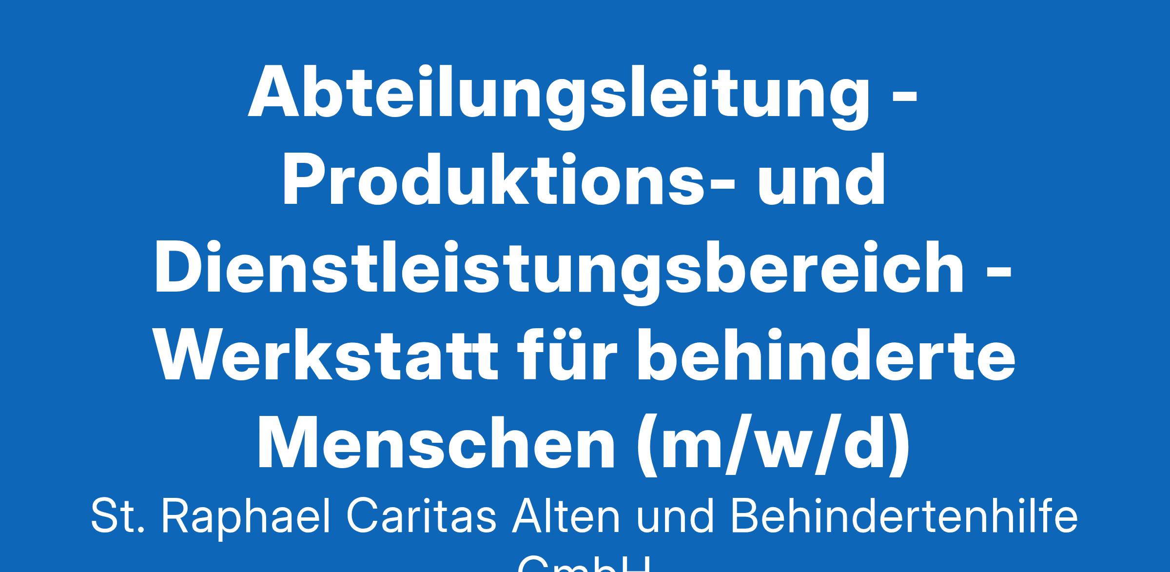 Abteilungsleitung - Produktions- und Dienstleistungsbereich - Werkstatt für behinderte Menschen (m/w/d) Die St. Raphael Caritas Alten- und Behindertenhilfe ist einer der größten sozialen Dienstleister im nördlichen Rheinland-Pfalz. In unserem gemeinnützigen Unternehmen engagieren sich über 1.400 Mitarbeitende an 40 Standorten in den Landkreisen Ahrweiler, Bernkastel-Wittlich, Cochem-Zell und Mayen-Koblenz. Für unsere Caritas Werkstätten im Kreis Ahrweiler für unsere Standorte Sinzig/ Burgbrohl suchen wir Sie zum nächstmöglichen Zeitpunkt als Abteilungsleitung des Produktions- und Dienstleistungsbereichs (m/w/d). Ihre Aufgaben: Abteilungsleitung mehrerer Produktions- und Dienstleistungsbereiche mit insgesamt 100 Werkstattarbeitsplätzen in einer Werkstatt für behinderte Menschen (WfbM) im Landkreis Ahrweiler Personelle, fachliche und wirtschaftliche Verantwortung, Qualitätssicherung sowie Gestaltung des Auftrages zur beruflichen Rehabilitation und Bildung für Menschen mit Behinderung Ausbau und Pflege bestehender Kontakte zu Kunden und Lieferanten sowie Gewinnung neuer Kooperationspartner Zukunftsorientierte Weiterentwicklung der Arbeitsbereiche durch bedarfsorientierte Neukundenakquise Enge Zusammenarbeit mit einem Team, bestehend aus über 300 Werkstattbeschäftigten mit Beeinträchtigung und 120 handwerklichen, technischen und pädagogischen Fachkräften Mitarbeit in unterschiedlichen arbeitspädagogischen Arbeitskreisen auf Leitungsebene Ihr Profil: Ein abgeschlossenes Studium im Bereich Pädagogik, Soziale Arbeit, Betriebswirtschaftslehre (BWL), Ingenieurwesen, oder eine abgeschlossene Meisterausbildung in einem Handwerks- oder Industriebetrieb mit entsprechender Berufserfahrung Gute technische und betriebswirtschaftliche Kenntnisse / Erfahrungen bzw. vergleichbare Qualifikationen Fähigkeiten zur Mitarbeitermotivation und -führung sowie ausgeprägte kommunikative Begabung Erste Erfahrungen damit, Mitarbeiter für kreatives und selbstorganisiertes Handeln zu begeistern Eine positive Einstellung zur Arbeit mit den von uns begleiteten Menschen Unser Angebot: Eine Vollzeitstelle (39 Stunden pro Woche) Eine anspruchsvolle und vielseitige Leitungsaufgabe Tarifliche Vergütung nach AVR-Caritas Betriebliche Altersvorsorge (KZVK) sowie eine Jahressonderzahlung Mindestens 30 Tage Urlaub pro Jahr Fort- und Weiterbildungsmöglichkeiten Teilnahme an der Führungskräfteentwicklung inklusive Coaching Betriebliches Gesundheitsmanagement Dienstradleasing Neugierig geworden? Dann bewerben Sie sich, wir freuen uns auf Sie! Auskünfte vorab erteilt Ihnen gerne Britta Lott unter Telefon 02642 9702310. Wir freuen uns auf Ihre Bewerbung über unser Karriereportal. St. Raphael Caritas Alten- und Behindertenhilfe GmbH Personalentwicklung und Recruiting Am Flugplatz 21 56743 Mendig www.st-raphael-cab.de