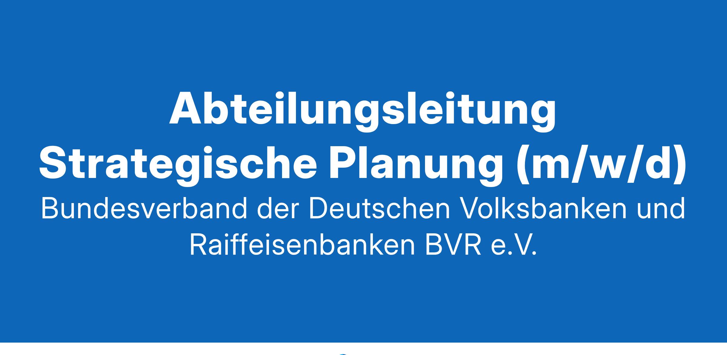 Sie wollen Zukunft gestalten und einen Unterschied machen? Der BVR vertritt als Spitzenverband der genossenschaftlichen FinanzGruppe der Volksbanken Raiffeisenbanken die Interessen von rund 700 Mitgliedsbanken mit mehr als 130.000 Mitarbeitern auf bundesweiter und internationaler Ebene. Wir gestalten Zukunft und machen gemeinsam mit unseren Banken und Partnern Veränderung möglich. Wir suchen für die Abteilung "Strategische Planung" im Bereich "Betriebswirtschaft und Banksteuerung" am Standort Berlin baldmöglichst eine/einen Abteilungsleiter/in Strategische Planung (m/w/d) Das bieten wir Ihnen: Flexible Arbeitszeiten und mobiles Arbeiten - für eigenverantwortliches Arbeiten Attraktive Vergütung - mit zusätzlichen Benefits wie Deutschlandticket und 30 Tage Urlaub Interessante und vielfältige Aufgaben - Gestaltungsspielraum in einem Spitzenverband Arbeitgeberfinanzierte betriebliche Altersvorsorge - Für eine bessere Zukunft: Wir machen den Weg frei Einbindung in ein engagiertes Team - offene und wertschätzende Kommunikationskultur Positive Unternehmenskultur - unsere Werte und unser Team sind wichtiger als schnelle Rendite Fortbildungsmöglichkeiten - sowie sehr gute Rahmenbedingungen für Ihren persönlichen Karriereweg Familie und Beruf - wir unterstützen Sie, beides zu verbinden Gute Verkehrsanbindung - wir sitzen direkt am Potsdamer Platz in Berlin Was Sie erwartet: Sie leiten die Abteilung Strategische Planung in enger Abstimmung mit dem Bereichsleiter Betriebswirtschaft und Banksteuerung Sie koordinieren den gemeinsamen Strategieprozess innerhalb der genossenschaftlichen Finanzgruppe für den BVR und seine Gremien Sie koordinieren die jährliche Erstellung der genossenschaftlichen Rahmenplanung (Kompass) als zentrales Anker- und Orientierungsmedium für die strategische und mittelfristige Planung der Genossenschaftsbanken inklusive der inhaltlichen Ausgestaltung der zugehörigen Strategie-Veranstaltungen Sie sind verantwortlich für die (Weiter-)Entwicklung von strategischen Ziel- und Kennzahlensystemen mit Relevanz für den übergeordneten Strategieprozess und von Instrumenten zur Unterstützung der Strategieprozesse in Genossenschaftsbanken Sie koordinieren die Schnittstellen zu anderen BVR-Fachabteilungen, Vertretern der genossenschaftlichen FinanzGruppe und externen Partnern Was Sie mitbringen: Exzellenter fachlicher Hintergrund: Sie bringen ein abgeschlossenes Studium bevorzugt im Bereich Wirtschaftswissenschaften mit, idealerweise mit dem Schwerpunkt Bankbetriebslehre und verfügen über langjährige Berufserfahrung in einem vergleichbaren Tätigkeitsgebiet. Strategisches Denken und Weitblick: Sie erkennen frühzeitig Potenziale und Herausforderungen und entwickeln nachhaltige Strategien, um langfristige Erfolge zu sichern. Vernetztes Denken & Teamplayer Mentalität: Sie bringen die Fähigkeit mit, komplexe Zusammenhänge zu verstehen und teamübergreifend zu agieren. Überzeugungs- und Durchsetzungsfähigkeit: Ihnen gelingt es, andere mit Ihren Argumenten zu begeistern und Lösungen effektiv durchzusetzen und nutzen dabei Ihre Beratermentalität. Kommunikations-, Verhandlungs- und Präsentationsstärke: Sie überzeugen durch klare und adressatengerechte Kommunikation - ob im persönlichen Gespräch, in Verhandlungen oder bei Präsentationen. Bezug zum Genossenschaftswesen: Sie identifizieren sich mit den Werten und Prinzipien des Genossenschaftswesens und bringen sowohl eine fachliche als auch emotionale Nähe mit. Es ist vorteilhaft, wenn Sie bereits in der genossenschaftlichen Finanzgruppe vernetzt sind und die strategischen Instrumente der Genossenschaftsbanken kennen. Haben wir Ihr Interesse geweckt? Dann senden Sie uns bitte mithilfe des nachfolgenden Formulars: Ihre aussagekräftigen und vollständigen Bewerbungsunterlagen (Lebenslauf, Zeugnisse, ggfs. Motivationsschreiben) Ihre persönliche Verfügbarkeit und Gehaltsvorstellung