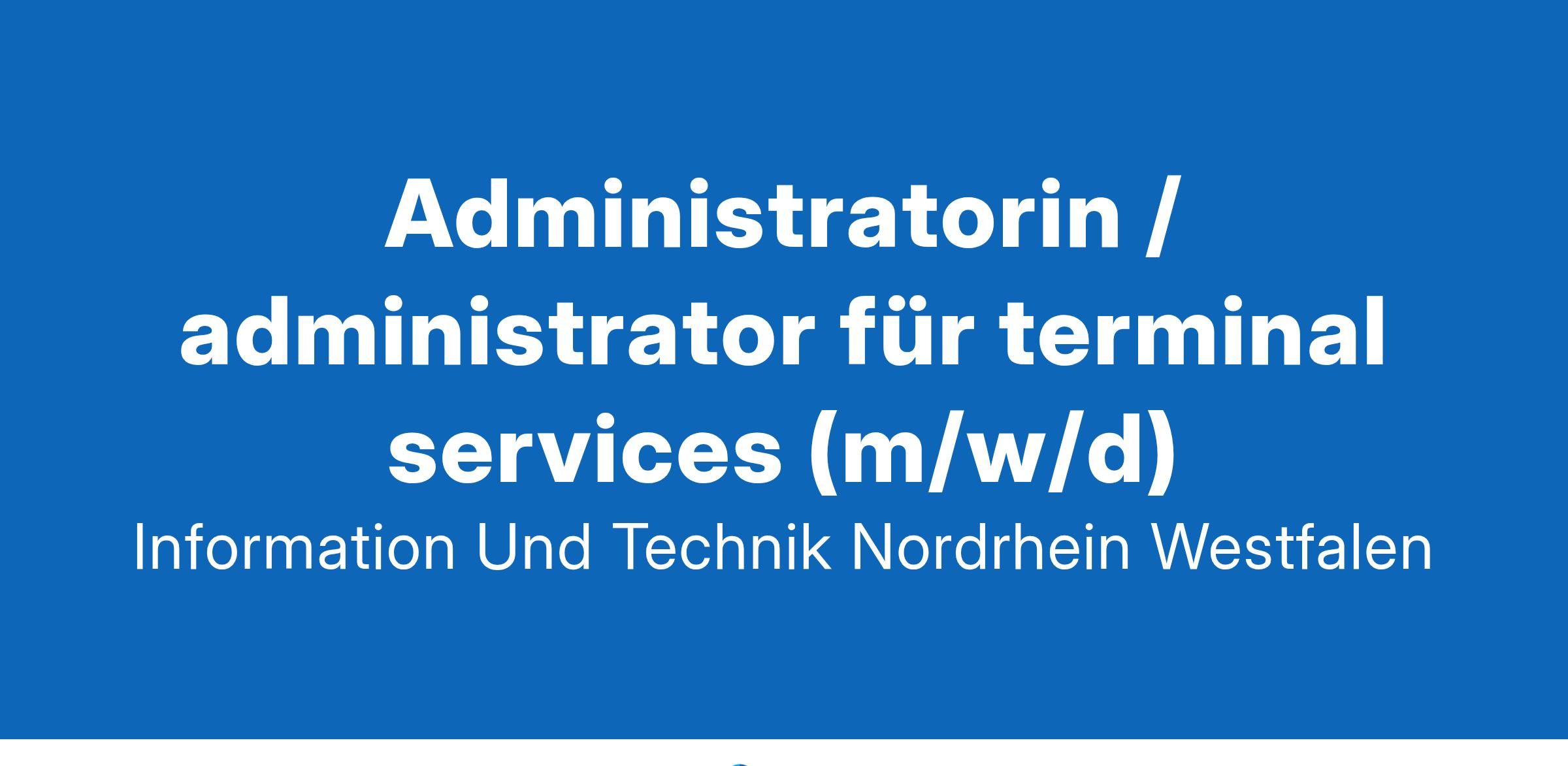 Information und Technik Nordrhein-Westfalen (IT. NRW) -- Administratorin / Administrator für Terminal Services (m/w/d)[ ](Administratorin / Administrator für Terminal Services (m/w/d)Standorte: Düsseldorf, Hagen, Münster, Köln oder Paderborn, Vertrag: Teilzeit/Vollzeit (unbefristet), Vergütung: Entgeltgruppe 12 TV-L*Ihre Mission: NRW digitaler machen*