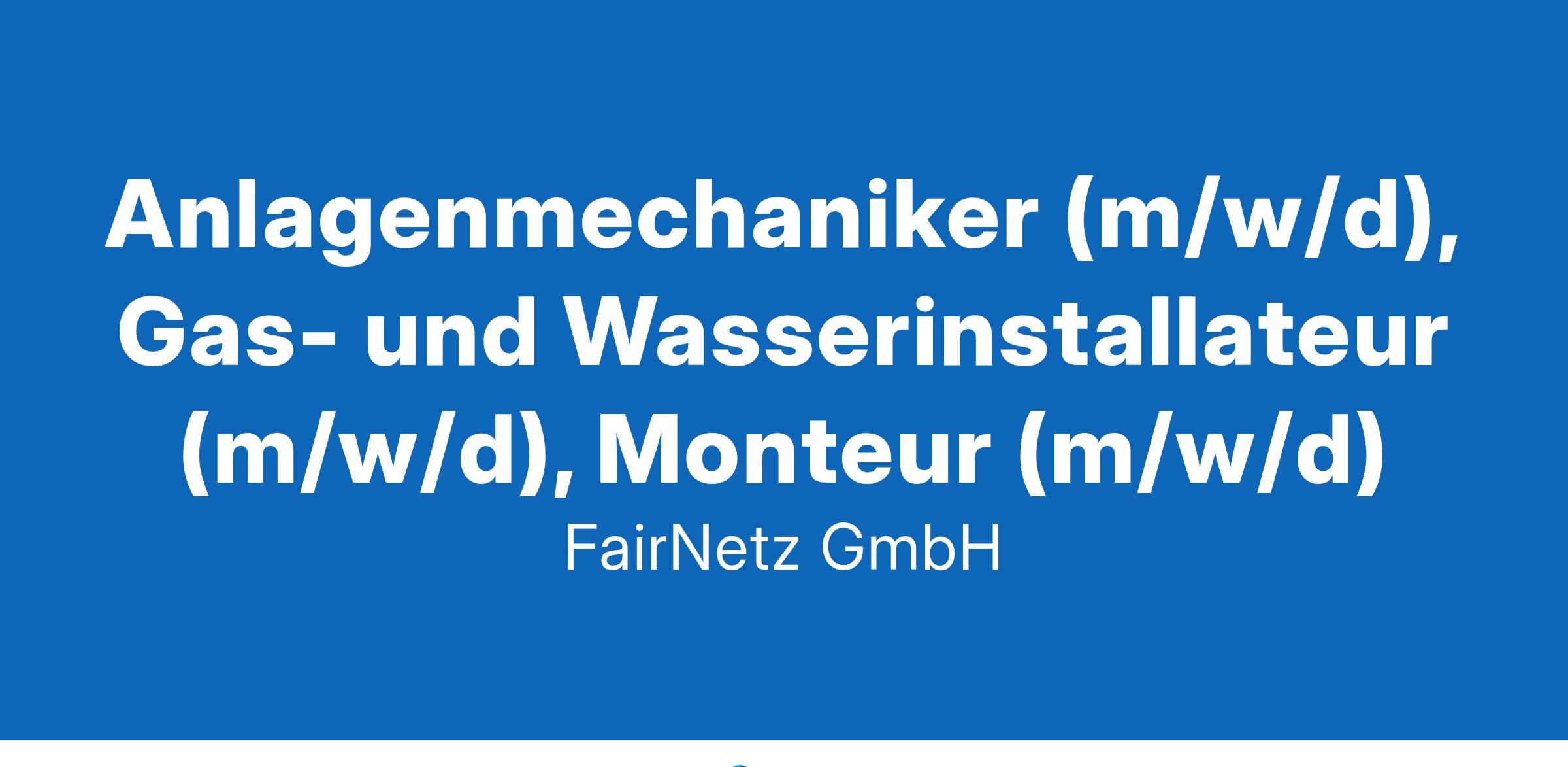 Anlagenmechaniker (m/w/d), Gas- und Wasserinstallateur (m/w/d), Monteur (m/w/d)Wir, die FairNetz GmbH, sind der Netzbetreiber in Reutlingen sowie in vielen Kommunen in der Region und sorgen mit über 300 Mitarbeitern für den zuverlässigen und nachhaltigen Betrieb von Strom-, Erdgas-, Fernwärme- und Trinkwassernetzen. Die Energiewende gestalten wir mit modernster Technik, intelligenten Verteilnetzen, der Integration der erneuerbaren Energien, innovativen Digitalisierungsstrategien oder der Förderung der Elektromobilität aktiv und zukunftsorientiert mit.Ihre AufgabenMontagearbeiten (Neuverlegung, Reparatur und Wartung) an Gas- und Wassernetzen und in Anlagen