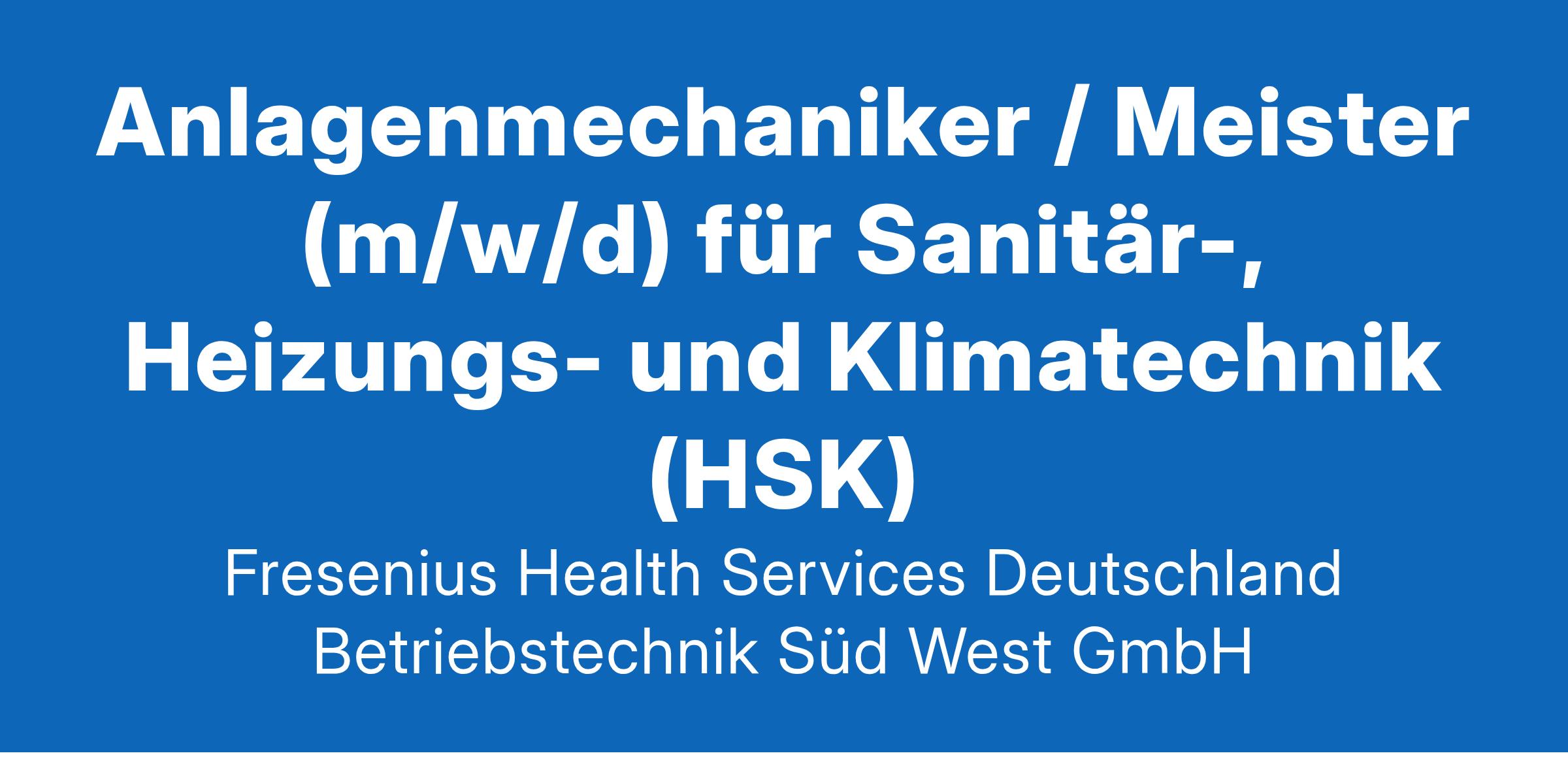Fresenius KarriereAnlagenmechaniker / Meister (m/w/d) für Sanitär-, Heizungs- und Klimatechnik (HSK)Wir suchen für unseren Klinikstandort Krefeld zum nächstmöglichen Zeitpunkt einen Meister (m/w/d) für Sanitär-, Heizungs- und Klimatechnik (HSK/HKLS) in Vollzeit und unbefristet.