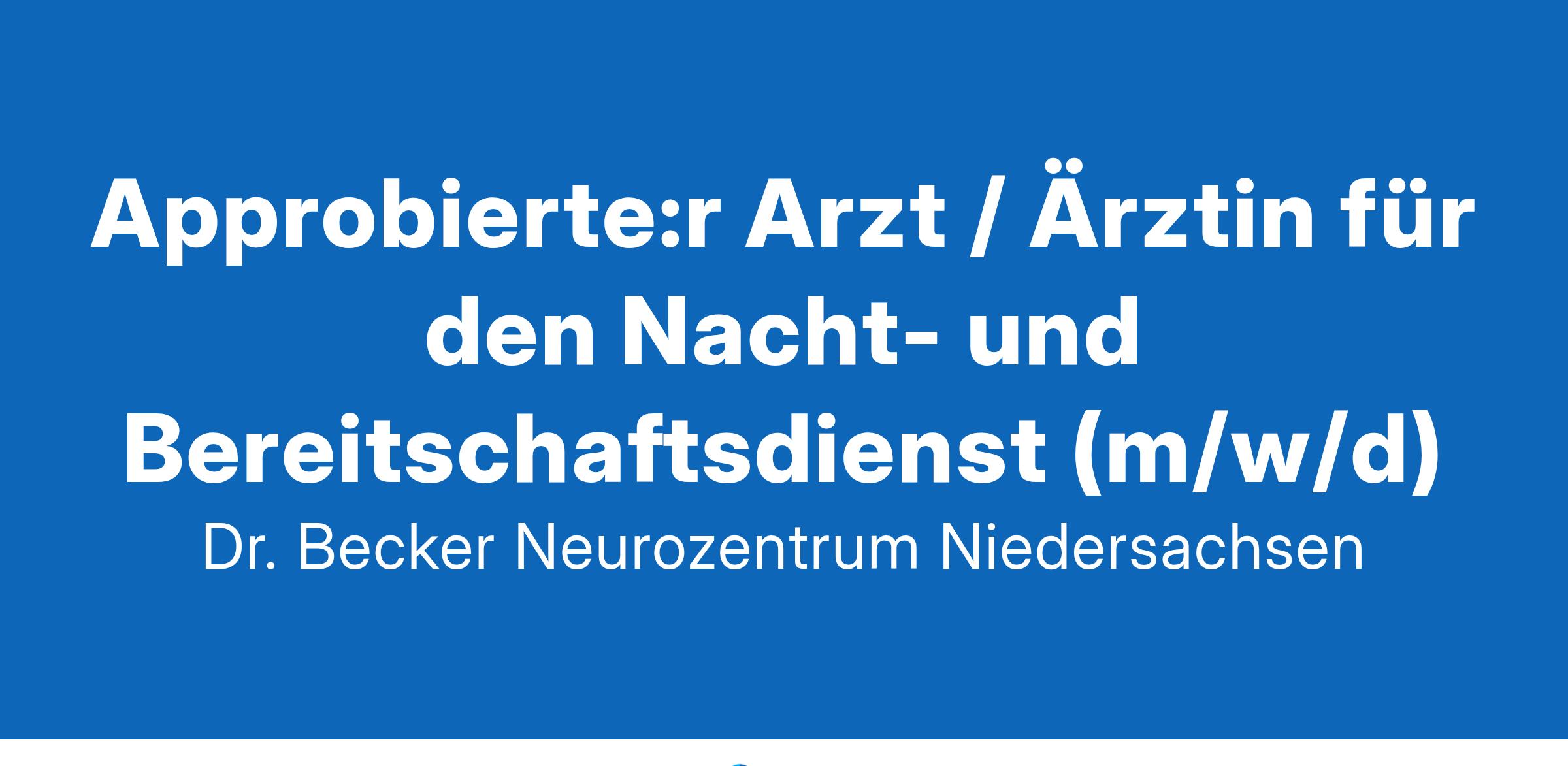 Approbierte:r Arzt / Ärztin für den Nacht- und Bereitschaftsdienst (m/w/d)Jetzt bewerbenHerzlich willkommen!Geregelte Arbeitszeiten, tolles Betriebsklima - unsere 170 Mitarbeiter:innen wissen, warum sie gerne im Dr. Becker Neurozentrum Niedersachen arbeiten. Auch, weil sie den Genesungsprozess ihrer neurologischen Rehabilitand:innen über Wochen miterleben können. Vielleicht ist das ja auch was für Sie? Dann werden Sie Teil der Dr. Becker Klinikgruppe, einem der Top-Player der deutschen Rehabranche seit fast 50 Jahren.Ihre Aufgaben:Als Arzt / Ärztin für den Nacht- und Bereitschaftsdienst im Dr. Becker Neurozentrum Niedersachsen in Bad Essen sichern Sie eine Woche pro Monat die medizinische Versorgung unserer Patient:innen und sind Ansprechperson für das Pflegepersonal. Bei Rückfragen können Sie einen fachärztlichen Hintergrunddienst in Rufbereitschaft erreichen.Ihr Profil:Das Angebot richtet sich besonders an frisch approbierte Mediziner:innen, die ihr Fachwissen einbringen können sowie niedergelassene Ärzt:innen. Häufiges Konstrukt der letzten Jahre: Tagsüber erfolgt die Arbeit an einer Dissertation und nachts die Verrichtung des Dienstes.