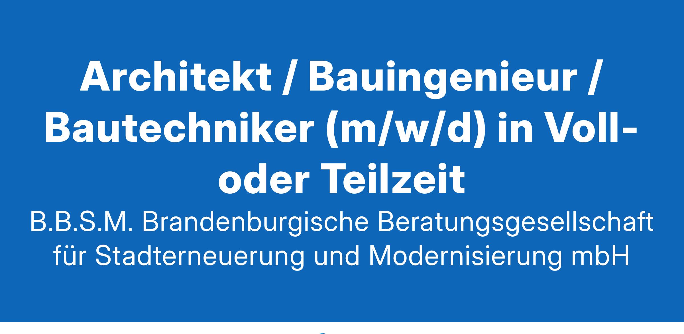 Architekt / Bauingenieur / Bautechniker (m/w/d) in Voll- oder Teilzeit B.B.S.M. Brandenburgische Beratungsgesellschaft für Stadterneuerung und Modernisierung mbH Wir suchen Persönlichkeiten! Stadtsanierung der Kommunen des Landes Brandenburg - hinter dieser Aufgabe verbergen sich viele aktuelle Herausforderungen. Die B.B.S.M. Brandenburgische Beratungsgesellschaft für Stadterneuerung und Modernisierung mbH unterstützt seit mehr als 30 Jahren mit ihren Kernkompetenzen öffentliche Auftraggeber des Landes Brandenburg bei der Stadt- und Projektentwicklung sowie dem Neubau und der Sanierung von Gebäuden, Verkehrs- und Freianlagen. Dafür suchen wir Menschen mit Fachwissen, Engagement und Leidenschaft für die baufachliche Prüfung von Bauvorhaben Architekten/Bauingenieure/Bautechniker (m/w/d) Um welche Aufgaben geht es? Wir erstellen im Auftrag von Kommunen, der Investitionsbank des Landes Brandenburg und des Landes Brandenburg baufachliche Prüfungen für Gebäudesanierungen und -abbrüche, Neubauten von Gebäuden, Straßen, Wege und Plätze sowie Sport- und Freianlagen im Rahmen von diversen Förderprogrammen (Antrags- und Verwendungsnachweisprüfungen, Bautenstandskontrollen). Dabei hat auch die förderungstechnische Beratung unserer Auftraggeber einen hohen Stellenwert. Warum die B.B.S.M.? Arbeiten auf Augenhöhe und ein respektvolles Miteinander stehen bei uns an erster Stelle. Unser Dienstleistungsportfolio und spannende Kunden garantieren eine hohe Projekt- und Aufgabenvielfalt. Wir praktizieren eine Work-Life-Balance und bieten geregelte, familienfreundliche Arbeits- und Urlaubszeiten einschließlich der Möglichkeit von Homeoffice. Sie lernen nie aus: Wir fördern Sie durch Weiterbildungen und regelmäßige Feedbackgespräche. Wir geben auch Berufseinsteigern eine Chance. Unseren Fokus auf die Gesundheit aller Mitarbeiter sichert ein betriebliches Gesundheitsmanagement, u. a. durch die Förderung eines gesunden Mittagessens und die Möglichkeit zur Nutzung diverser Sport- und Fitnessangebote. Sie passen zu uns, wenn Sie ... über ein abgeschlossenes Hochschulstudium Architektur/Landschaftsarchitektur bzw. Bauingenieurwesen (Dipl.-Ingenieur, Master oder Bachelor) verfügen oder eine Ausbildung zum staatlich geprüften Bautechniker abgeschlossen haben und offen sind für Neues, über die Bereitschaft zur Einarbeitung in die Erstellung von baufachlichen Prüfungen der Städtebau- und der Sozialen Wohnraumförderung verfügen, erste Erfahrungen im öffentlichen Vergabewesen erworben haben bzw. die Bereitschaft zur Einarbeitung in das Themenfeld mitbringen, einen Pkw-Führerschein Klasse B besitzen, mit der einschlägigen Bürosoftware (MS Excel, MS Word, ggf. MS Project) sehr gut umgehen können. Wir haben Ihr Interesse geweckt? Dann bewerben Sie sich jetzt! Mehr Informationen im Vorfeld finden Sie auf unserer Homepage www.bbsm-brandenburg.de Wir freuen uns auf Ihre Bewerbung mit Gehaltswunsch und möglichem Eintrittstermin an karriere@bbsm-brandenburg.de Eventuelle Rückfragen richten Sie bitte ebenfalls an karriere@bbsm-brandenburg.de. B.B.S.M. Brandenburgische Beratungsgesellschaft für Stadterneuerung und Modernisierung mbH Geschäftsführung Behlertstraße 3 a, Haus G, 14467 Potsdam karriere@bbsm-brandenburg.de