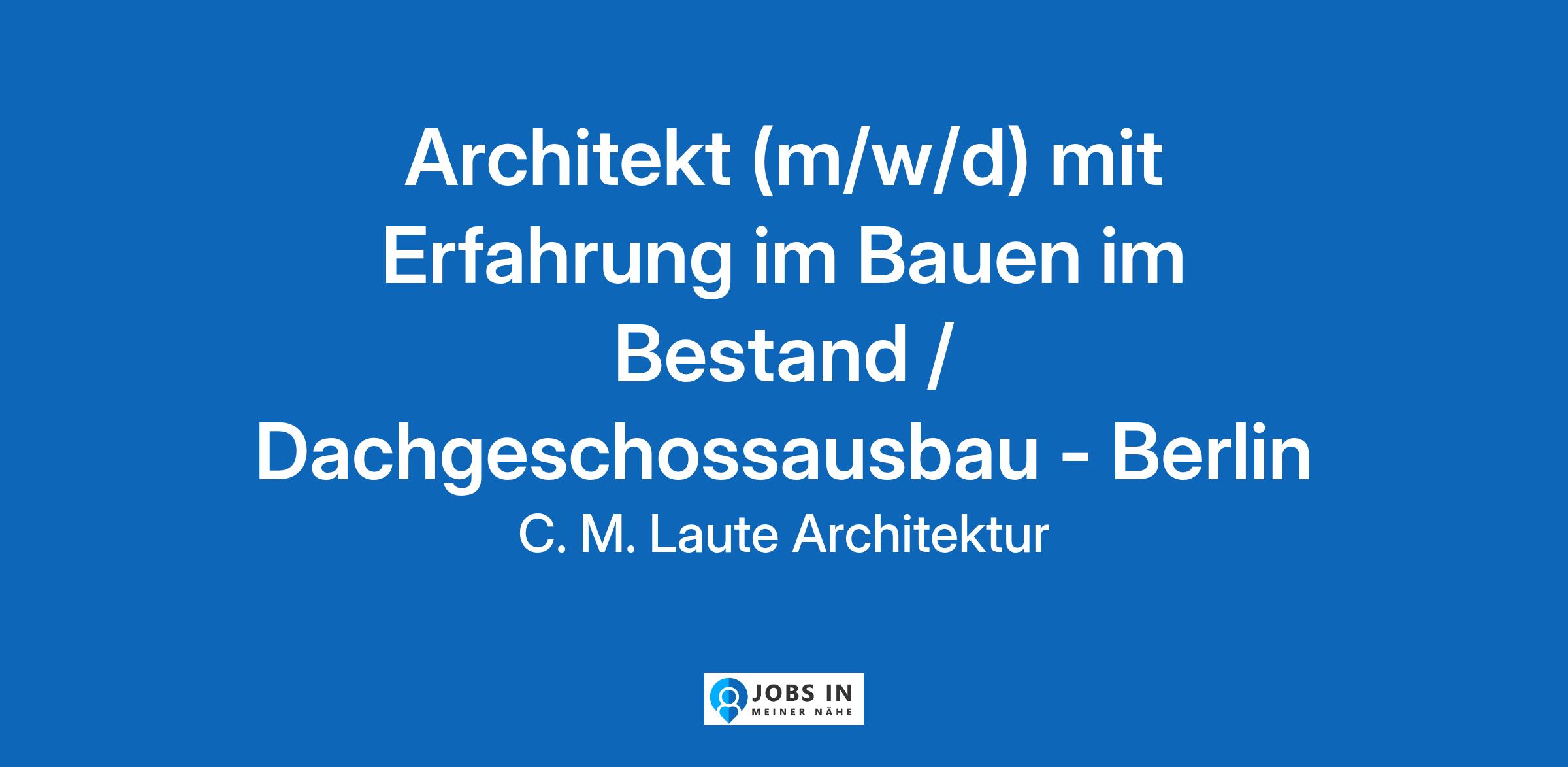 Bei C. M. Laute Architektur gestalten wir die Zukunft Berlins, indem wir das Bestehende wertschätzen und weiterentwickeln. Unser Fokus liegt auf dem Bauen im Bestand, der energetischen Sanierung und der Schaffung hochwertigen Wohnraums durch Dachausbauten und Dachaufstockungen. Mit einem erfahren... Bauordnung;Kostenkontrolle;In sicherer Weise;Qualitätssicherung;Kompetent;Projektstudie;CAD-Software;Altbauerneuerung;Deutsch;Projektmanagement;Koordination;Ausführungsplanung;Entwurfsplanung;Verhandlungsführung;Architektur;Genehmigungsplanung;Netzwerke;Dachausbauten;Statisch;Überwachter Bau;Fachplanung;Baurecht;Verantwortung;Brandschutz;ArchiCAD;Beratung;Betreuung Original Stellenanzeige auf StepStone.de – Jetzt Jobagent bei StepStone einrichten und Traumjob finden! https://bit.ly/2KOagYD Mehr Informationen zu Arbeitgebern, Gehaltsdaten und Karrieretipps finden Sie auf StepStone.de