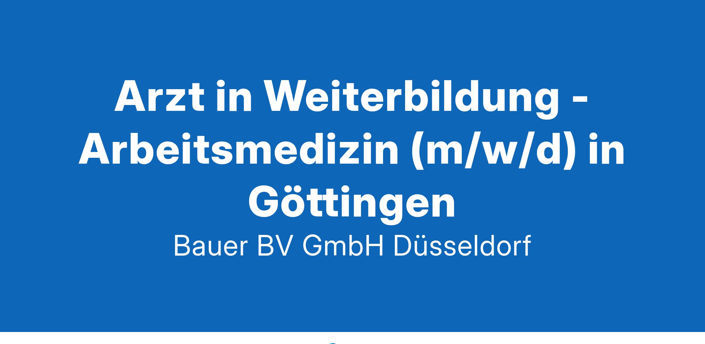 Anstellungsart(en): Teilzeit, VollzeitIhr neuer Arbeitsplatz:Unser Kunde ist ein bundesweit vertetener Anbieter im Bereich der Arbeitsmedizin und des betrieblichen GesundheitsmanagementsFür den Standort in Göttingen suchen wir zum nächstmöglichen Zeitpunkt einen Arzt in Weiterbildung (m/w/d) für Arbeitsmedizin.Ihre Vorteile:Komplette Ausbildung zum Facharzt für Arbeitsmedizin (m/w/d)Individuelle EntwicklungsmöglichkeitenGeregelte Arbeitszeiten ohne Nacht- und WochenenddiensteAttraktiver Verdienst inkl. Dienstwagen mit PrivatnutzungUnbefristete Festanstellung in Voll- oder TeilzeitIhr Profil:Deutsche ApprobationMind. 24 Monate absolvierte Weiterbildungszeit in der unmittelbaren PatientenversorgungSprachkenntnisse auf C1-NiveauFührerscheinIhr Ansprechpartner:Bauer B+V Personalberatung
