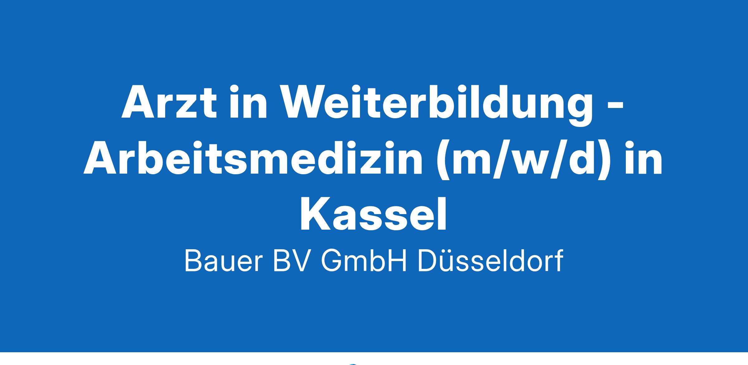 Anstellungsart(en): Teilzeit, VollzeitIhr neuer Arbeitsplatz:Unser Kunde ist ein bundesweit vertetener Anbieter im Bereich der Arbeitsmedizin und des betrieblichen GesundheitsmanagementsFür den Standort in Kassel suchen wir zum nächstmöglichen Zeitpunkt einen Arzt in Weiterbildung (m/w/d) für Arbeitsmedizin.Ihre Vorteile:Komplette Ausbildung zum Facharzt für Arbeitsmedizin (m/w/d)Individuelle EntwicklungsmöglichkeitenGeregelte Arbeitszeiten ohne Nacht- und WochenenddiensteAttraktiver Verdienst inkl. Dienstwagen mit PrivatnutzungUnbefristete Festanstellung in Voll- oder TeilzeitIhr Profil:Deutsche ApprobationMind. 24 Monate absolvierte Weiterbildungszeit in der unmittelbaren PatientenversorgungSprachkenntnisse auf C1-NiveauFührerscheinIhr Ansprechpartner:Bauer B+V Personalberatung