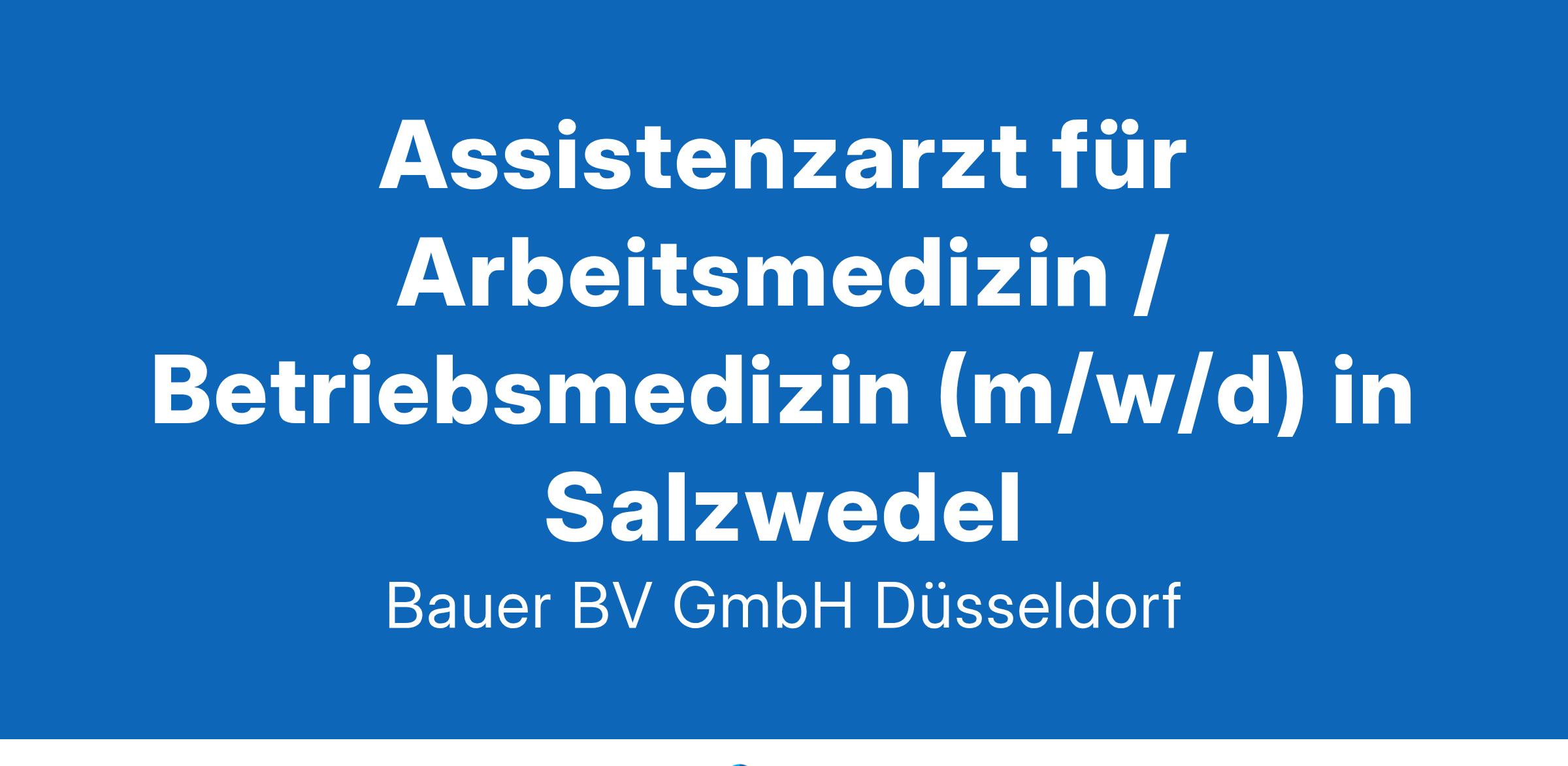 Anstellungsart(en): Teilzeit, VollzeitIhr neuer Arbeitsplatz:Unser Kunde ist Marktführer in der Arbeitsmedizin, Arbeitssicherheit und im Gesundheitsmanagement. Für das Gesundheitszentrum in der Nähe von Salzwedel suchen wir zum nächstmöglichen Zeitpunkt einen Assistenzarzt (m/w/d) für Arbeitsmedizin.Ihre Vorteile:Weiterbildungsermächtigung Arbeitsmedizin (36 Monate)Persönlicher Betreuung während der Weiterbildung durch MentorInEinarbeitung in ein breites, präventives AufgabenspektrumFreundliches und engagiertes TeamFamilienfreundliche Arbeitszeiten ohne DiensteAttraktive VergütungUnbefristete Festanstellung in Voll- oder TeilzeitIhr Profil:Deutsche Approbation und Sprachlevel C124 Monate absolvierte Weiterbildungszeit in der unmittelbaren PatientenversorgungInteresse an der Arbeits- und BetriebsmedizinIhr Ansprechpartner:Bauer B+V Personalberatung