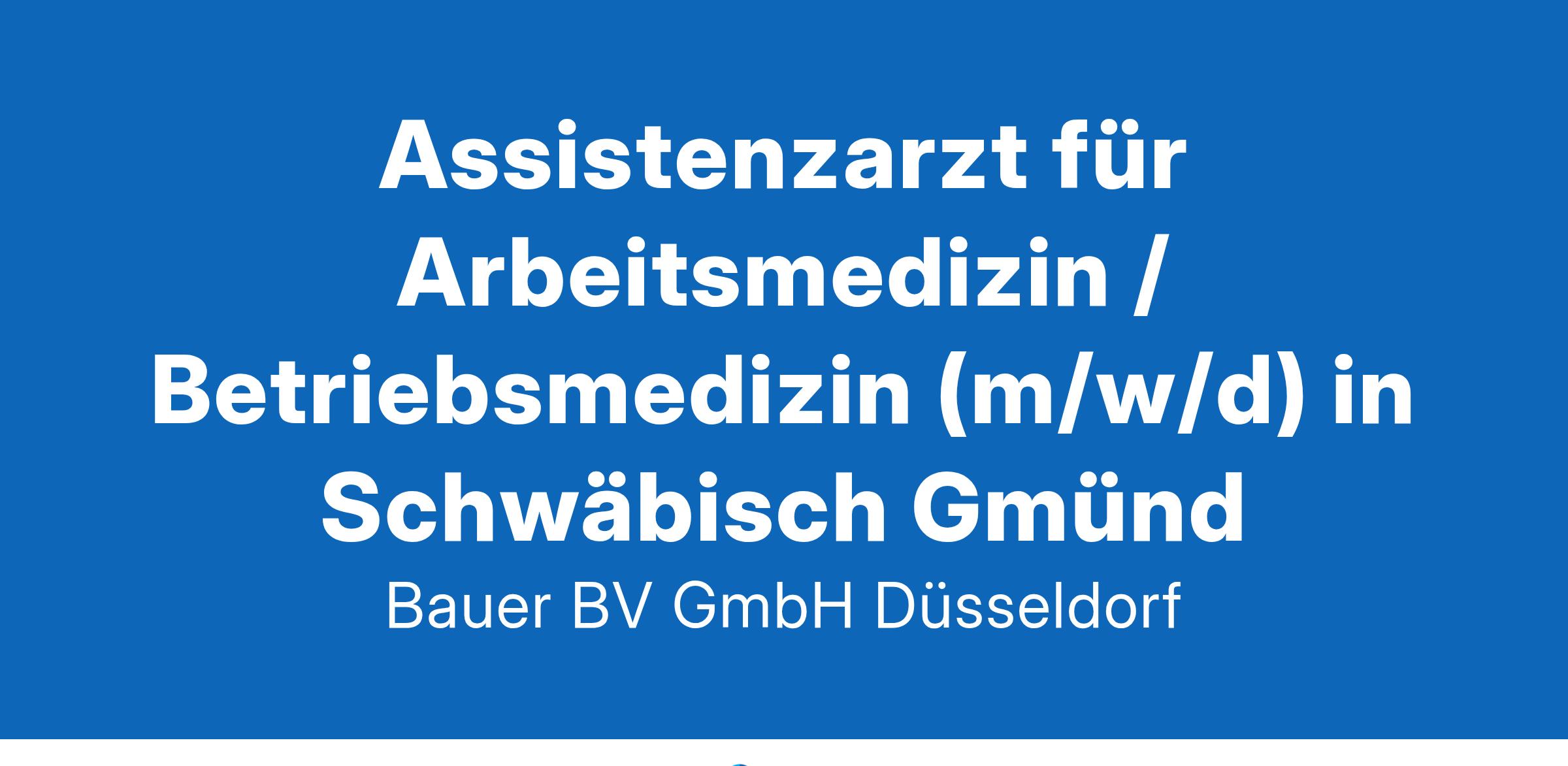 Anstellungsart(en): Teilzeit, VollzeitIhr neuer Arbeitsplatz:Unser Kunde ist Marktführer in der Arbeitsmedizin, Arbeitssicherheit und im Gesundheitsmanagement. Für das Gesundheitszentrum in der Nähe von Schwäbisch Gmünd (Baden-Württemberg) suchen wir zum nächstmöglichen Zeitpunkt einen Assistenzarzt (m/w/d) für Arbeitsmedizin.Ihre Vorteile:Weiterbildungsermächtigung Arbeitsmedizin (36 Monate)Persönlicher Betreuung während der Weiterbildung durch MentorInEinarbeitung in ein breites, präventives AufgabenspektrumFreundliches und engagiertes TeamFamilienfreundliche Arbeitszeiten ohne DiensteAttraktive VergütungUnbefristete Festanstellung in Voll- oder TeilzeitIhr Profil:Deutsche Approbation und Sprachlevel C124 Monate absolvierte Weiterbildungszeit in der unmittelbaren PatientenversorgungInteresse an der Arbeits- und BetriebsmedizinIhr Ansprechpartner:Bauer B+V Personalberatung