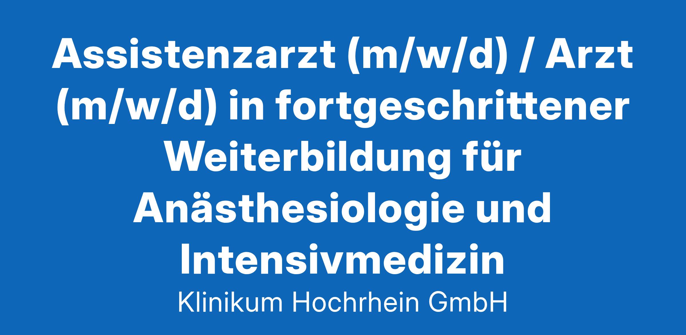 Sie sind empathisch und arbeiten gerne im Team?! Dann sind Sie bei uns genau richtig. Die Klinikum Hochrhein GmbH sucht zum nächstmöglichen Zeitpunkt in Voll- oder Teilzeit einen:Assistenzarzt (m/w/d) / Arzt (m/w/d) in fortgeschrittener Weiterbildung für Anästhesiologie und IntensivmedizinJährlich werden ca. 7.000 Patienten anästhesiologische Verfahren durchgeführt. Alle üblichen Verfahren der Allgemein- und Regionalanästhesie einschl. der geburtshilflichen Anästhesie kommen dabei zur Anwendung. Die interdisziplinäre Intensivstation mit 14 Betten (NIV und invasive Beatmung, Bronchoskopie, Dilatationstracheotomie, PiCCO, Dialyse) sowie das blutgruppenserologische Labor unterstehen organisatorisch der Abteilung für Anästhesie.