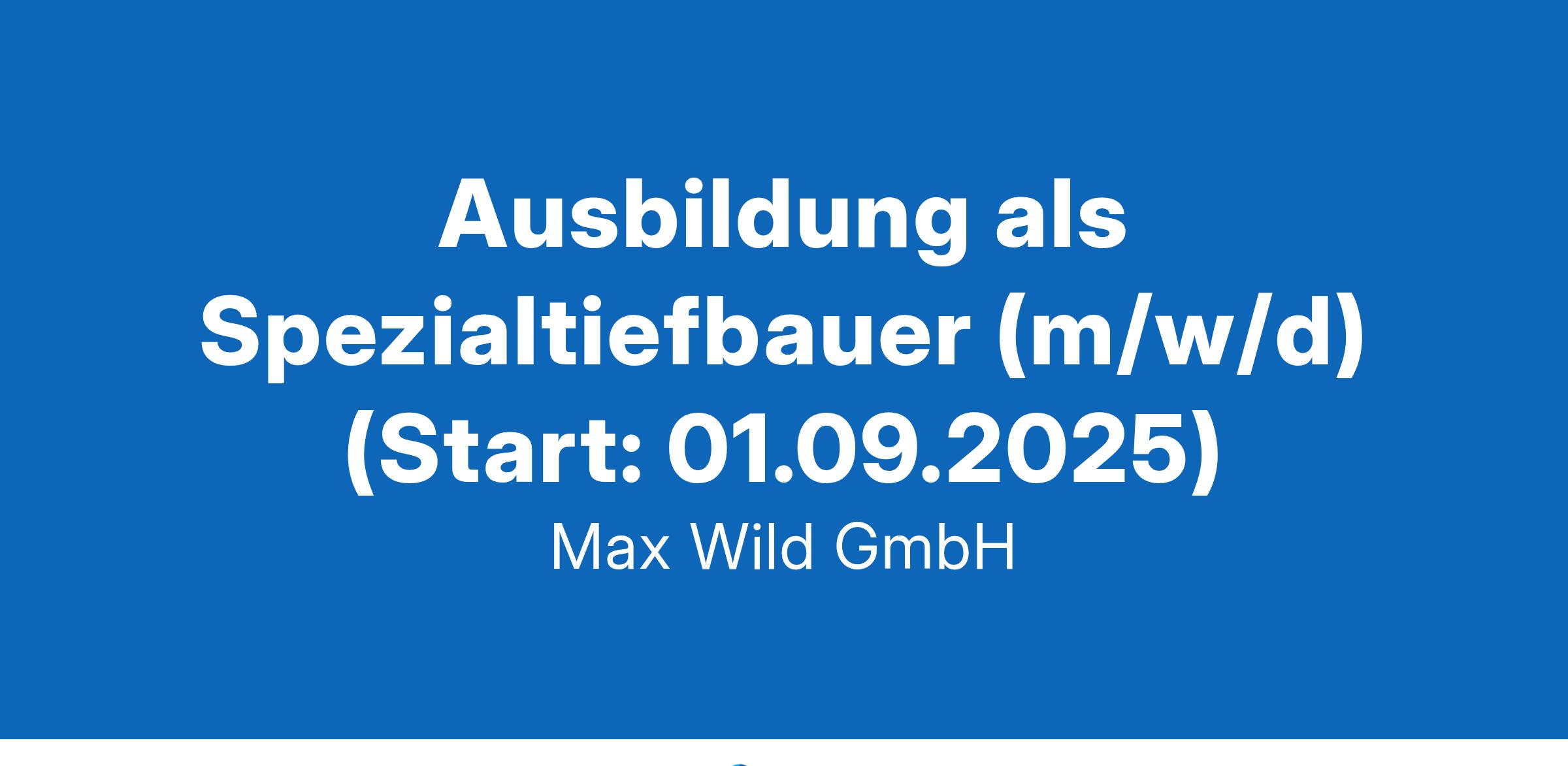 Ausbildung als Spezialtiefbauer (m/w/d) (Start: 01.09.2025) in Berkheim vom 24.07.2024 Max Wild - Hochmotivierte und gut ausgebildete Mitarbeiterinnen und Mitarbeiter machen uns zu dem, was wir sind: ein leistungsstarker und zuverlässiger Partner für unsere Kunden in den Bereichen Abbruch, Bau und Transportdienstleistungen. Werde auch du Teil unseres Teams. Ausbildung als Spezialtiefbauer (m/w/d)