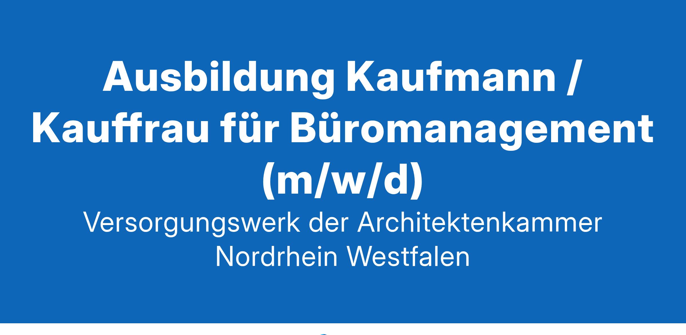 Wir, das Versorgungswerk der Architektenkammer Nordrhein-Westfalen mit Sitz in Düsseldorf, sind eine öffentlich-rechtliche Versorgungseinrichtung. Egal, ob es um Alters-, Berufsunfähigkeits- oder Hinterbliebenenversorgung geht, wir sind der Ansprechpartner für alle Kammermitglieder, Hochschulabsolventinnen und Hochschulabsolventen der Architektenkammer Nordrhein-Westfalen, Architektenkammer der Freien Hansestadt Bremen, Architekten- und Stadtplanerkammer Hessen, Architektenkammer des Saarlandes und der Ingenieurkammer-Bau Nordrhein-Westfalen.Zur Verstärkung unseres Teams bieten wir zum 1. August 2025 einen Ausbildungsplatz im Bereich Büromanagement.Ausbildung zum Kaufmann / zur Kauffrau für BüromanagementZu Ihren Praxisphasen:Während der Praxisphasen durchlaufen Sie verschiedene Abteilungen und erhalten Einblicke in die Abläufe unseres Unternehmens.Eigenschaften, die Sie mitbringen:Sie haben mindestens einen guten Realschulabschluss, mit guten Noten in Mathematik und Deutsch.Sie sind hoch motiviert.Sie besitzen die Fähigkeit zu eigenverantwortlichem und strukturiertem Arbeiten.Sie sind zuverlässig, besitzen Verantwortungsbewusstsein und eine schnelle Auffassungsgabe.Sie haben grundlegende Kenntnisse des MS-Office-Pakets und Interesse an digitalen Themen.Unser Angebot:Vielseitige Ausbildung in einem etablierten, krisenfesten UnternehmenLangfristige und interessante Tätigkeit in Düsseldorf mit bester NahverkehrsanbindungEine attraktive AusbildungsvergütungBetriebliche Altersversorgung mit ArbeitgeberbeteiligungFlexible Arbeitszeiten, 30 Tage UrlaubZuschuss zu Ihren vermögenswirksamen LeistungenDeutschlandticketInteressiert?Ihre Bewerbung senden Sie bitte bis 14.02.2025 mit vollständigen und aussagefähigen Unterlagen per Post oder E-Mail (personal@vw-aknrw.de) an:Herrn Hauptgeschäftsführer