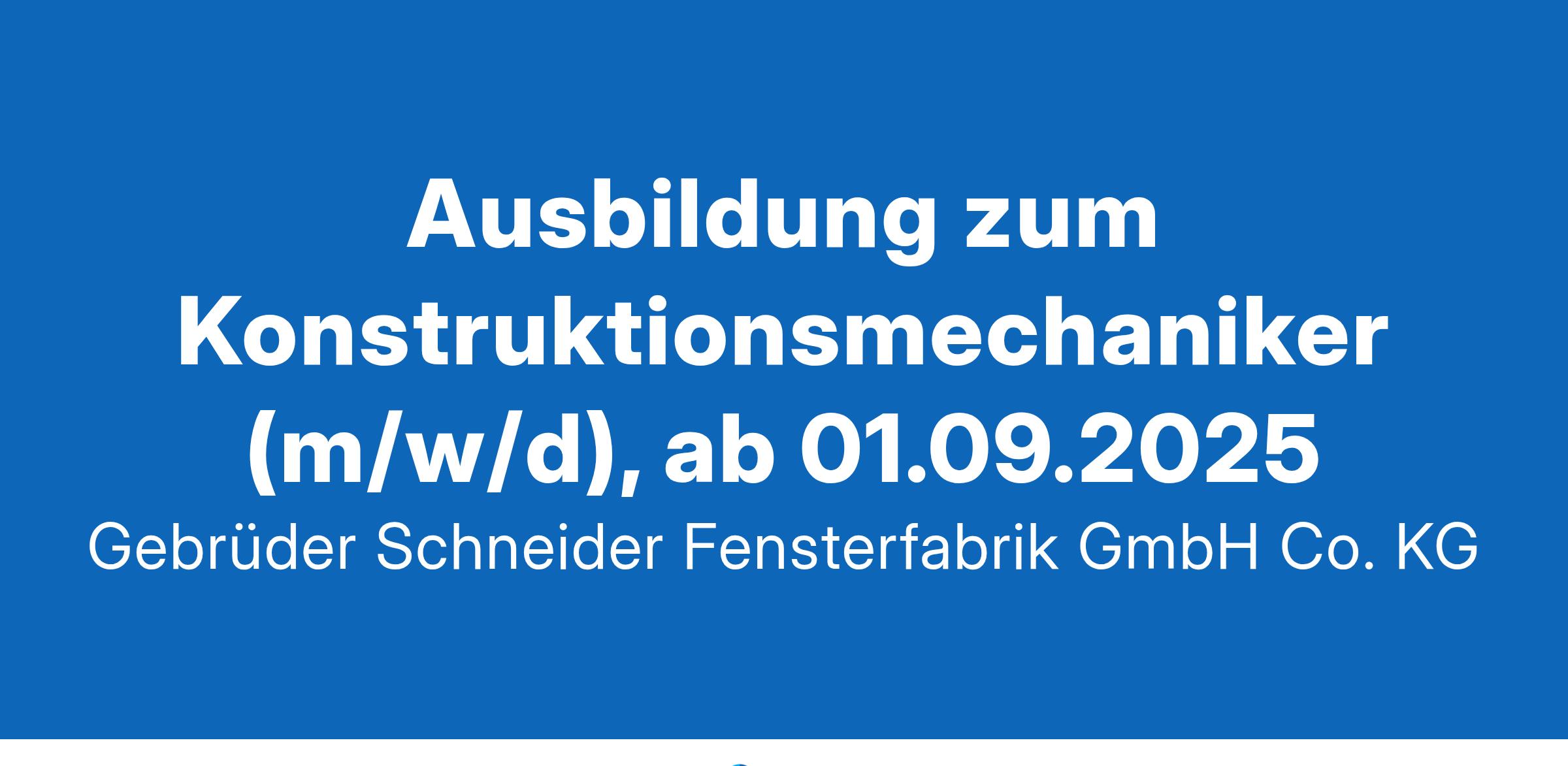 Für den Standort Stimpfach suchen wir: Ausbildung zum Konstruktionsmechaniker (m/w/d), ab 01.09.2025 Starte deine Ausbildung 2025 zum/zur Konstruktionsmechaniker/in bei Schneider! An unserem zentral gelegenen Standort zwischen Crailsheim, Ellwangen und Dinkelsbühl lernst du alles über den Stahl-, Metallbau, die Schweißtechnik und Fertigung von Metallkonstruktionen für unsere Fassaden kennen. Freu dich auf faire Bezahlung, abwechslungsreiche Projekte und ein tolles Team! DEIN AUFGABENGEBIET Während deiner 3,5-jährigen Ausbildung lernst du die Grundlagen im Stahl- und Metallbau kennen Du wirst lernen wie unsere Fassaden hergestellt werden und selbst Teilaufgaben davon übernehmen Zu deiner Arbeit wird das Bearbeiten von Metallerzeugnissen durch Schleifen, Schweißen, Kanten und Bohren gehören Deine Konstruktionen wirst du an Maschinen und Werkzeugen bearbeiten Deine Arbeit wird auf dem lesen und umsetzen von technischen Zeichnungen aufbauen Mit jedem Ausbildungsjahr werden deine Aufgaben anspruchsvoller und dein Verantwortungsbereich größer DAS BRINGST DU MIT Du verfügst mindestens über einen (qualifizierten) Hauptschulabschluss oder vergleichbar Deine praktische Veranlagung, dein handwerkliches Geschick und dein räumliches Vorstellungsvermögen zeichnen dich aus Die Bereiche Mathematik, Technik und Physik wecken dein Interesse Zuverlässigkeit, Teamfähigkeit und Verantwortungsbewusstsein bringst du ebenfalls mit Kommunikative Deutschkenntnisse wünschenswert DEINE PERSPEKTIVEN Du wirst ein breites und interessantes Tätigkeitsspektrum bei einem Marktführer seiner Branche in einem internationalen Umfeld kennenlernen Auf dich wartet ein Familienunternehmen mit einem aufgeschlossenen Team und mehrere Mitauszubildende Qualifizierte Ausbilder und Kollegen vom Fach werden dich durch deine Lehrzeit begleiten Dich erwartet ein sicherer und moderner Arbeitsplatz mit sehr guten Chancen auf eine Übernahme nach deiner Ausbildung Du kannst dich auf eine faire und pünktliche Vergütung verlassen Deine Ansprechpartnerin Frau Vanessa Frank Kontakt Gebrüder Schneider Fensterfabrik GmbH & Co. KG Rechenberger Str. 7-9 74597 Stimpfach 07967/151-188 bewerbung@schneider-fassaden.de Impressum • Datenschutzerklärung