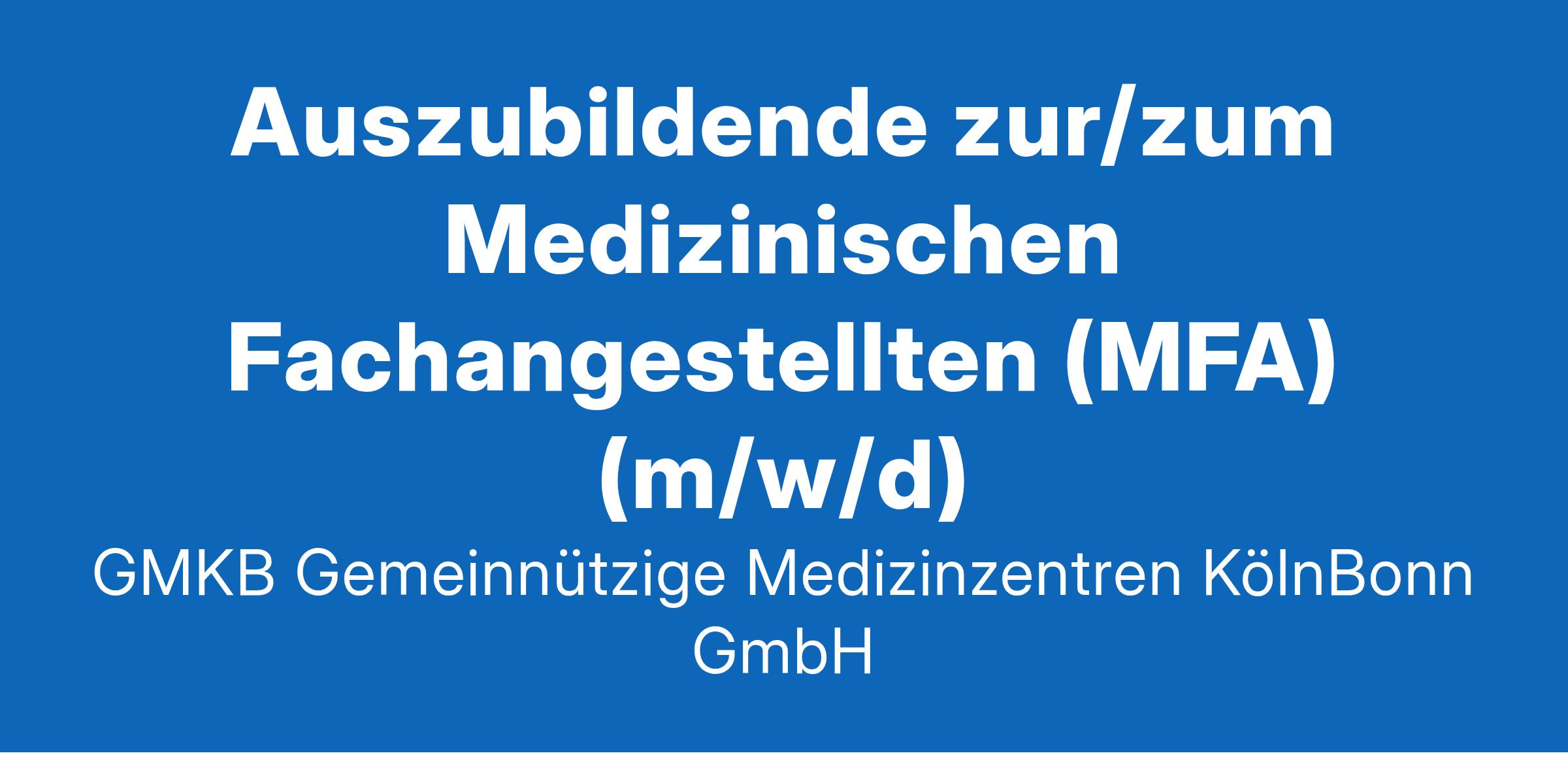 Wir können mehr als Pusten und Pflaster!Die GMKB – Gemeinnützige Medizinzentren KölnBonn GmbH suchen mehrere Auszubildende zur/zum Medizinischen Fachangestellten (MFA) (m/w/d) zum 01. August 2025 - in Vollzeit für den Bereich der Kinder- und Jugendpsychiatrie und für den Bereich der Kinder- und Jugendmedizin in Köln, Bonn und Bonn-Bad Godesberg.
