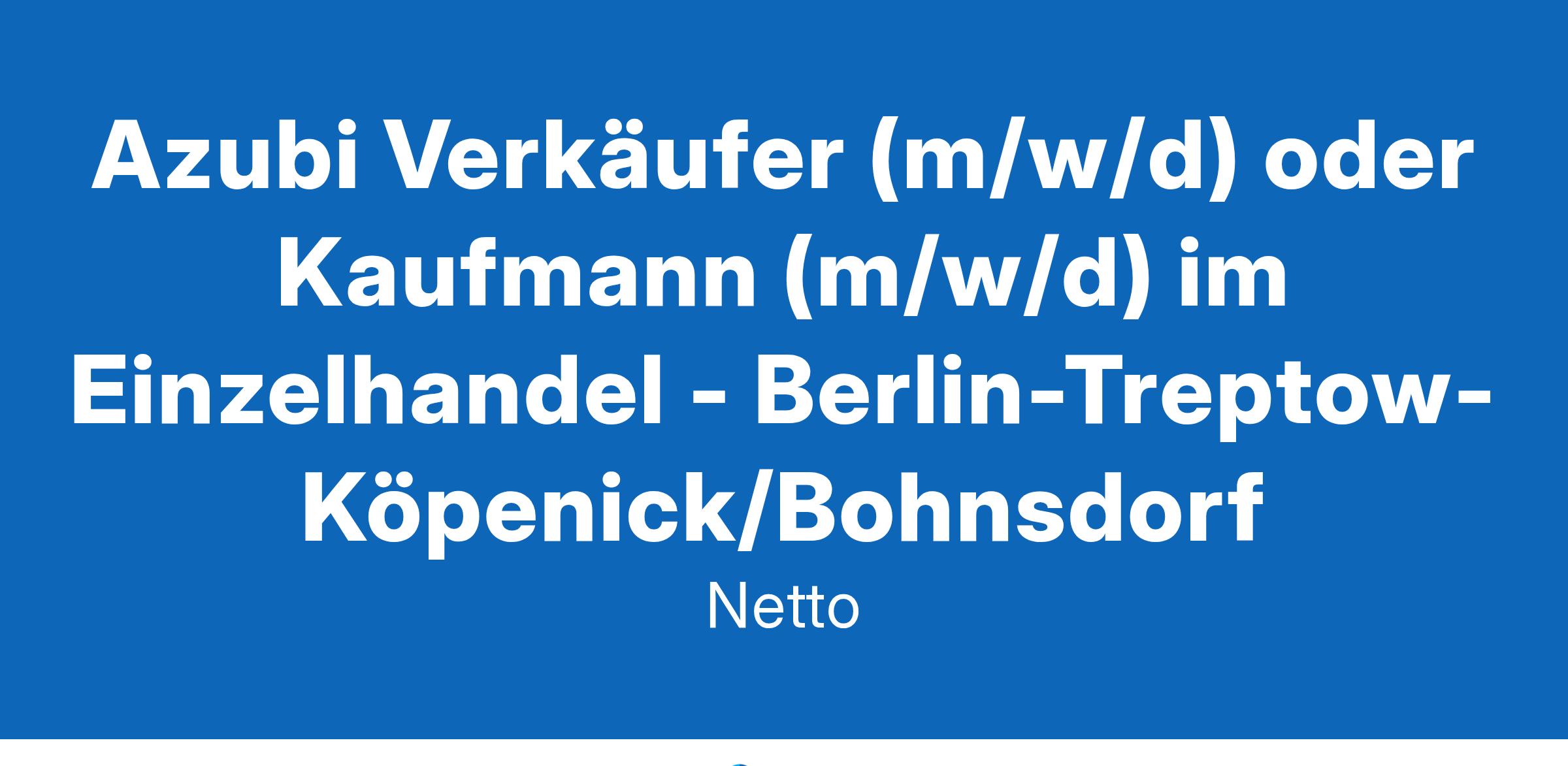 Was wir für dich sein können? Ein Arbeitgeber mit Zukunft, bei dem du mitgestalten und dich weiterentwickeln kannst.Wir suchen Verkäufer (m/w/d) für eine zweijährige oder Kaufmann (m/w/d) im Einzelhandel für eine dreijährige Ausbildung bei Netto. Du hast ebenfalls die Möglichkeit, nach einem guten Abschluss zum Verkäufer (m/w/d) das 3. Ausbildungsjahr zum Kaufmann (m/w/d) im Einzelhandel anzuschließen.Das bieten wir dir:Spitzengehalt: Bei uns verdienen Azubis im ersten Lehrjahr EUR 1.250, im zweiten Jahr EUR 1.350 und im dritten Ausbildungsjahr EUR 1.550. Urlaubs- und Weihnachtsgeld kommt noch obendrauf. Damit haben wir eine Spitzenposition im deutschen Lebensmitteleinzelhandel.Exklusiv-für-dich: 5 % Rabatt auf deinen Einkauf bei Netto, vergünstigte Konditionen bei unserem Wellbeing-Partner Wellhub sowie Zugang zu einer Vielzahl von Vergünstigungen für ausgewählte Online-Angebote.Spannendeinhalte: Jährlich finden für alle Lehrjahre Azubi-Seminare mit spannenden Inhalten statt. Außerdem helfen wir allen dabei, sich auf die Abschlussprüfungen vorzubereiten. Azubis haben zudem die Möglichkeit sich weiterzubilden und z. B. eine Ausbildereignungsprüfung abzulegen oder den Arzneimittelschein zu erwerben.Karrierebooster: Nach dem erfolgreichen Abschluss stehen dir viele Karrierewege bei uns offen. So kannst du beispielsweise zur Marktleitung aufsteigen oder deine Karriere in der Verwaltung fortsetzen, z. B. im Einkauf, Marketing oder People & Culture.Überholspur: Bei entsprechender schulischer Vorbildung oder bei sehr guter Leistung kannst du deine Ausbildungszeit verkürzen.Das werden deine Aufgaben sein:Kunden-Rockstar: In dieser Ausbildung wirst du lernen, wie man Kunden wie echte Rockstars behandelt - freundlich, kompetent und immer bereit, ihre Wünsche zu erfüllen.Produkt-Showtime: Du wirst die Geheimnisse der Produktplatzierung und -präsentation im Verkaufsraum meistern, um unseren Laden zur angesagtesten Bühne der Stadt zu machen.Kassen-König(in): Wir bringen dir bei, die Kasse wie ein/e König(in) zu beherrschen und Transaktionen mit Stil abzuwickeln.Bestandsboss: Die Überwachung und Auffüllung des Lagerbestands machen dich zum wahren Bestandsboss.Hygiene-Guru: Hygienevorschriften sind bei uns das A und O, und du wirst die Kunst der Sauberkeit und Pflege unseres Verkaufsraums wie ein echter Guru beherrschen.Das bringst du mit:Neugierde und Lernhunger: Bei uns kannst du zeigen, wie neugierig du auf die Welt des Einzelhandels bist und wie großen Hunger du auf neues Wissen und Können hast.Menschenmagnet: Du liebst es, mit Menschen in Kontakt zu treten und ziehst Energie aus sozialen Interaktionen.Teamplayer und Superheld der Verantwortung: Deine Superkraft ist Teamfähigkeit, und du übernimmst Verantwortung mit Stil. Du bist bereit, mit anderen zusammenzuarbeiten und dabei Verantwortung zu übernehmen.Du passt zu uns? Dann bewirb dich jetzt direkt hier.