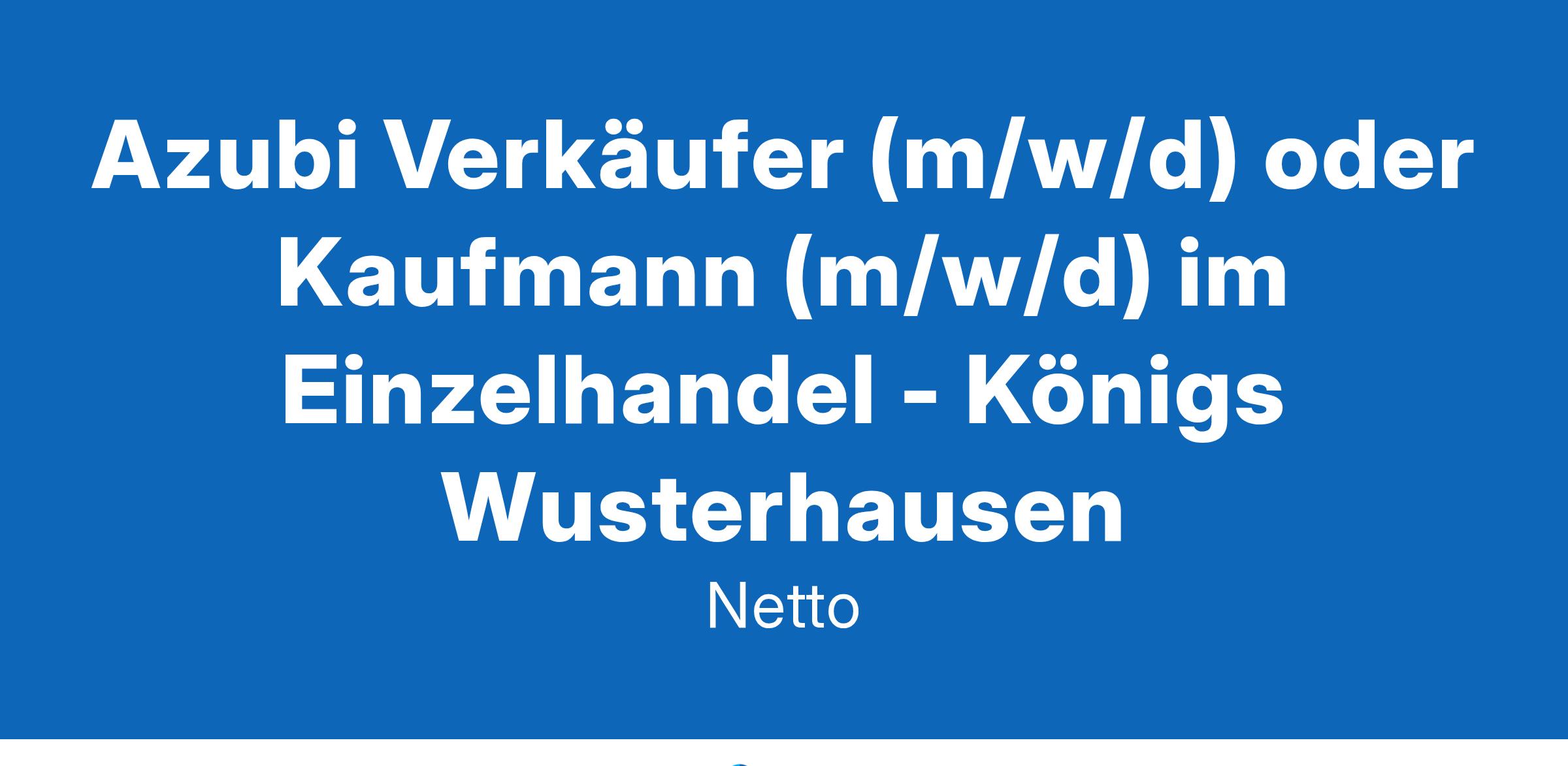 Was wir für dich sein können? Ein Arbeitgeber mit Zukunft, bei dem du mitgestalten und dich weiterentwickeln kannst.Wir suchen Verkäufer (m/w/d) für eine zweijährige oder Kaufmann (m/w/d) im Einzelhandel für eine dreijährige Ausbildung bei Netto. Du hast ebenfalls die Möglichkeit, nach einem guten Abschluss zum Verkäufer (m/w/d) das 3. Ausbildungsjahr zum Kaufmann (m/w/d) im Einzelhandel anzuschließen.Das bieten wir dir:Spitzengehalt: Bei uns verdienen Azubis im ersten Lehrjahr EUR 1.250, im zweiten Jahr EUR 1.350 und im dritten Ausbildungsjahr EUR 1.550. Urlaubs- und Weihnachtsgeld kommt noch obendrauf. Damit haben wir eine Spitzenposition im deutschen Lebensmitteleinzelhandel.Exklusiv-für-dich: 5 % Rabatt auf deinen Einkauf bei Netto, vergünstigte Konditionen bei unserem Wellbeing-Partner Wellhub sowie Zugang zu einer Vielzahl von Vergünstigungen für ausgewählte Online-Angebote.Spannendeinhalte: Jährlich finden für alle Lehrjahre Azubi-Seminare mit spannenden Inhalten statt. Außerdem helfen wir allen dabei, sich auf die Abschlussprüfungen vorzubereiten. Azubis haben zudem die Möglichkeit sich weiterzubilden und z. B. eine Ausbildereignungsprüfung abzulegen oder den Arzneimittelschein zu erwerben.Karrierebooster: Nach dem erfolgreichen Abschluss stehen dir viele Karrierewege bei uns offen. So kannst du beispielsweise zur Marktleitung aufsteigen oder deine Karriere in der Verwaltung fortsetzen, z. B. im Einkauf, Marketing oder People & Culture.Überholspur: Bei entsprechender schulischer Vorbildung oder bei sehr guter Leistung kannst du deine Ausbildungszeit verkürzen.Das werden deine Aufgaben sein:Kunden-Rockstar: In dieser Ausbildung wirst du lernen, wie man Kunden wie echte Rockstars behandelt - freundlich, kompetent und immer bereit, ihre Wünsche zu erfüllen.Produkt-Showtime: Du wirst die Geheimnisse der Produktplatzierung und -präsentation im Verkaufsraum meistern, um unseren Laden zur angesagtesten Bühne der Stadt zu machen.Kassen-König(in): Wir bringen dir bei, die Kasse wie ein/e König(in) zu beherrschen und Transaktionen mit Stil abzuwickeln.Bestandsboss: Die Überwachung und Auffüllung des Lagerbestands machen dich zum wahren Bestandsboss.Hygiene-Guru: Hygienevorschriften sind bei uns das A und O, und du wirst die Kunst der Sauberkeit und Pflege unseres Verkaufsraums wie ein echter Guru beherrschen.Das bringst du mit:Neugierde und Lernhunger: Bei uns kannst du zeigen, wie neugierig du auf die Welt des Einzelhandels bist und wie großen Hunger du auf neues Wissen und Können hast.Menschenmagnet: Du liebst es, mit Menschen in Kontakt zu treten und ziehst Energie aus sozialen Interaktionen.Teamplayer und Superheld der Verantwortung: Deine Superkraft ist Teamfähigkeit, und du übernimmst Verantwortung mit Stil. Du bist bereit, mit anderen zusammenzuarbeiten und dabei Verantwortung zu übernehmen.Du passt zu uns? Dann bewirb dich jetzt direkt hier.