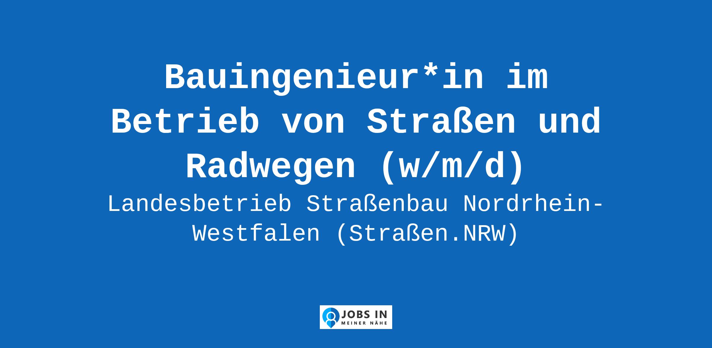 Der Landesbetrieb Straßenbau Nordrhein-Westfalen (Straßen.NRW) sucht zum nächstmöglichen Zeitpunkt für den Standort Region I NL Ostwestfalen-Lippe, Dienstort Bielefeld in Vollzeit oder Teilzeit eine*n Bauingenieur*in im Betrieb von Straßen und Radwegen (w/m/d).