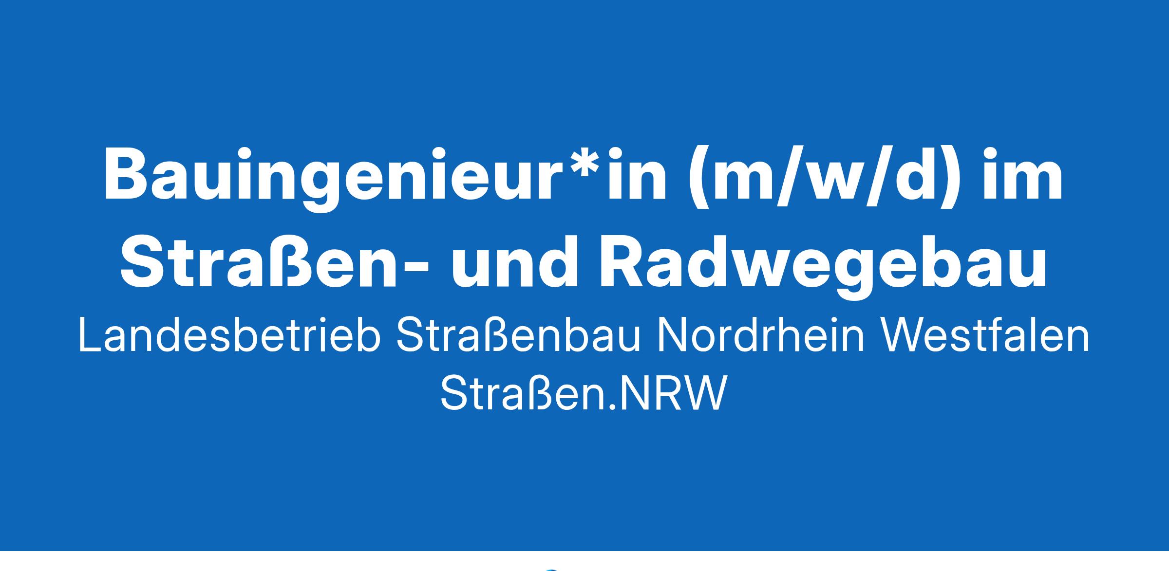Bewerbungslink: https://career55.sapsf.eu/career?company=landesbetr&site=&lang=de_DE&career_ns=job%5fapplication&career_job_req_id=4387Über Straßen.NRWWir sind der Ansprechpartner Nummer eins, wenn es um Bundes- und Landesstraßen oder Rad(schnell)wege im bevölkerungsreichsten Bundesland geht. Wir sind Straßen.NRW. Ein zentraler, moderner Mobilitätsdienstleister, der jedoch im ganzen Land - vor Ort - zu finden ist. Wir können bereits auf mehr als 20 erfolgreiche Jahre zurückschauen, haben aber vor allem die mobile Zukunft im Blick: digital, flexibel, sicher. Wir, das sind 56 Straßenmeistereien in acht regionalen Niederlassungen, ein Betriebssitz in Gelsenkirchen und eine Landesverkehrszentrale in Leverkusen. Wir sind 4.000 engagierte Beschäftigte. Uns eint ein Ziel: Die Menschen in Nordrhein-Westfalen mobil zu halten.Der Landesbetrieb Straßenbau Nordrhein-Westfalen (Straßen.NRW) sucht zum nächstmöglichen Zeitpunkt für den Standort Region I NL Ostwestfalen-Lippe, Dienstort Bielefeld, in Vollzeit-/Teilzeit eine*n Bauingenieur*in (m/w/d) im Straßen- und Radwegebau.
