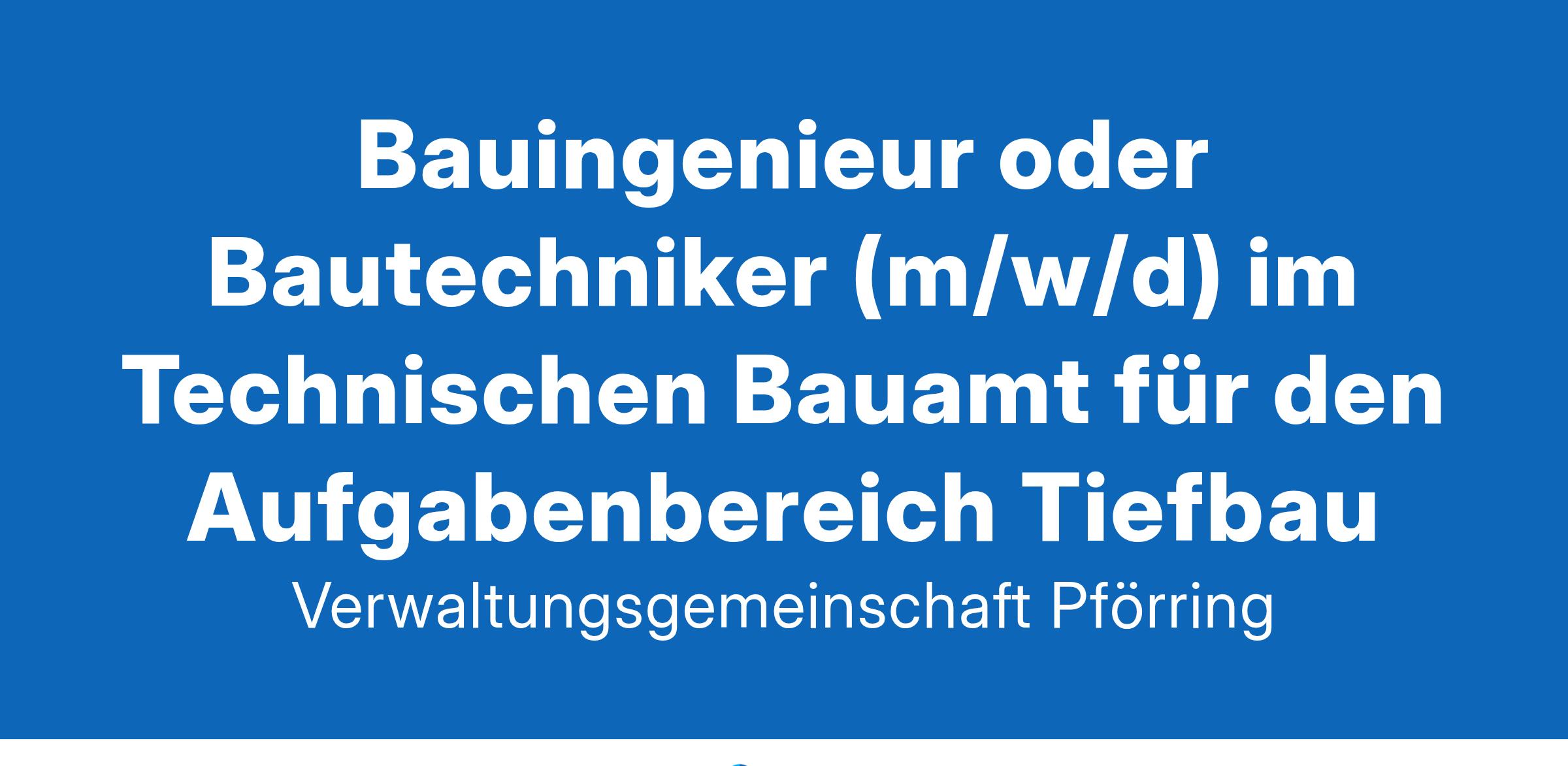 Die Verwaltungsgemeinschaft Pförring (bestehend aus den Gemeinden Pförring, Oberdolling und Mindelstetten mit insgesamt rd. 8.000 Einwohnern) sucht zum nächstmöglichen Zeitpunkt einen Bauingenieur oder Bautechniker (m/w/d) im Technischen Bauamt für den Aufgabenbereich Tiefbau