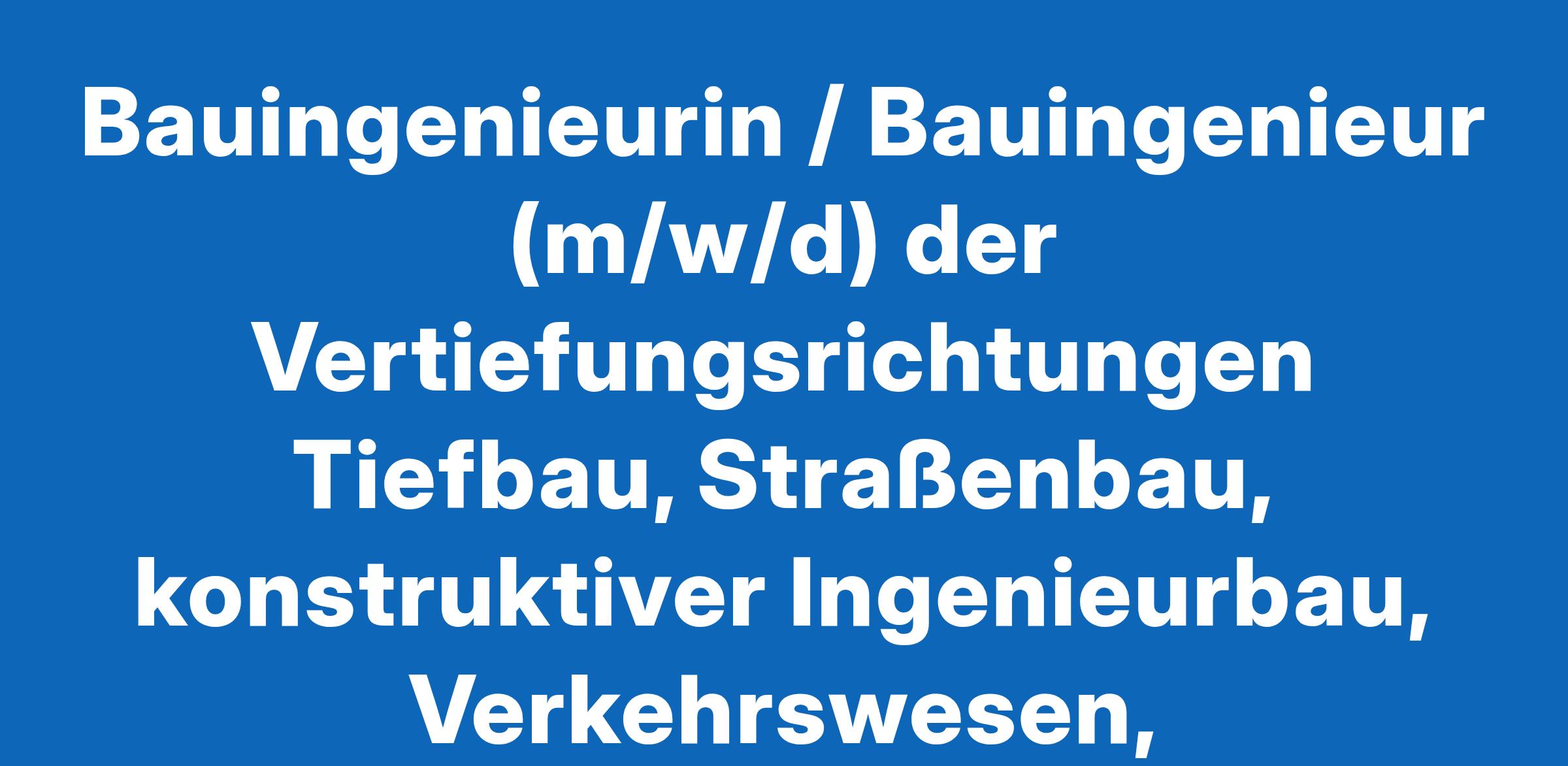 Bauingenieurin / Bauingenieur (m/w/d) der Vertiefungsrichtungen Tiefbau, Straßenbau, konstruktiver Ingenieurbau, Verkehrswesen, Siedlungswasserwirtschaft oder Wasserbau