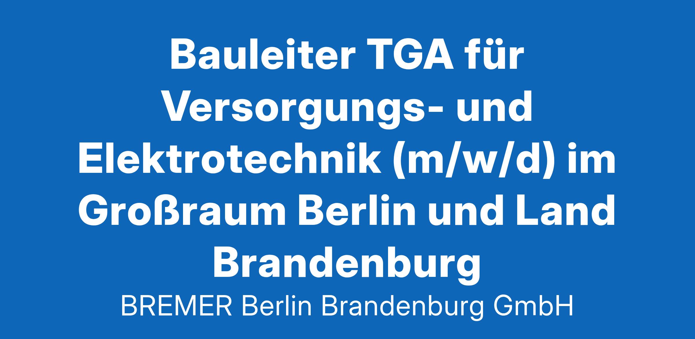 Als Bauleiter TGA (m/w/d) am BREMER Standort in Potsdam sind Sie auf der Baustelle der Spezialist für die Heizungs-, Lüftungs-, Sanitär- und Klima- sowie die Elektrotechnik unserer technisch anspruchsvollen Bauvorhaben im Großraum Berlin und Land Brandenburg. Darüber hinaus erwartet Sie ein großartiges und besonders erfahrenes Team, welches sich darauf freut, Sie in Ihrer Einarbeitungsphase zu begleiten und zu unterstützen sowie als neues Mitglied in der BREMER-Familie begrüßen zu dürfen.IHRE AUFGABEN:Ausführungs-, Qualitäts-, Kosten- und Terminkontrolle der Nachunternehmerleistungen unter Berücksichtigung der anderen Gewerke