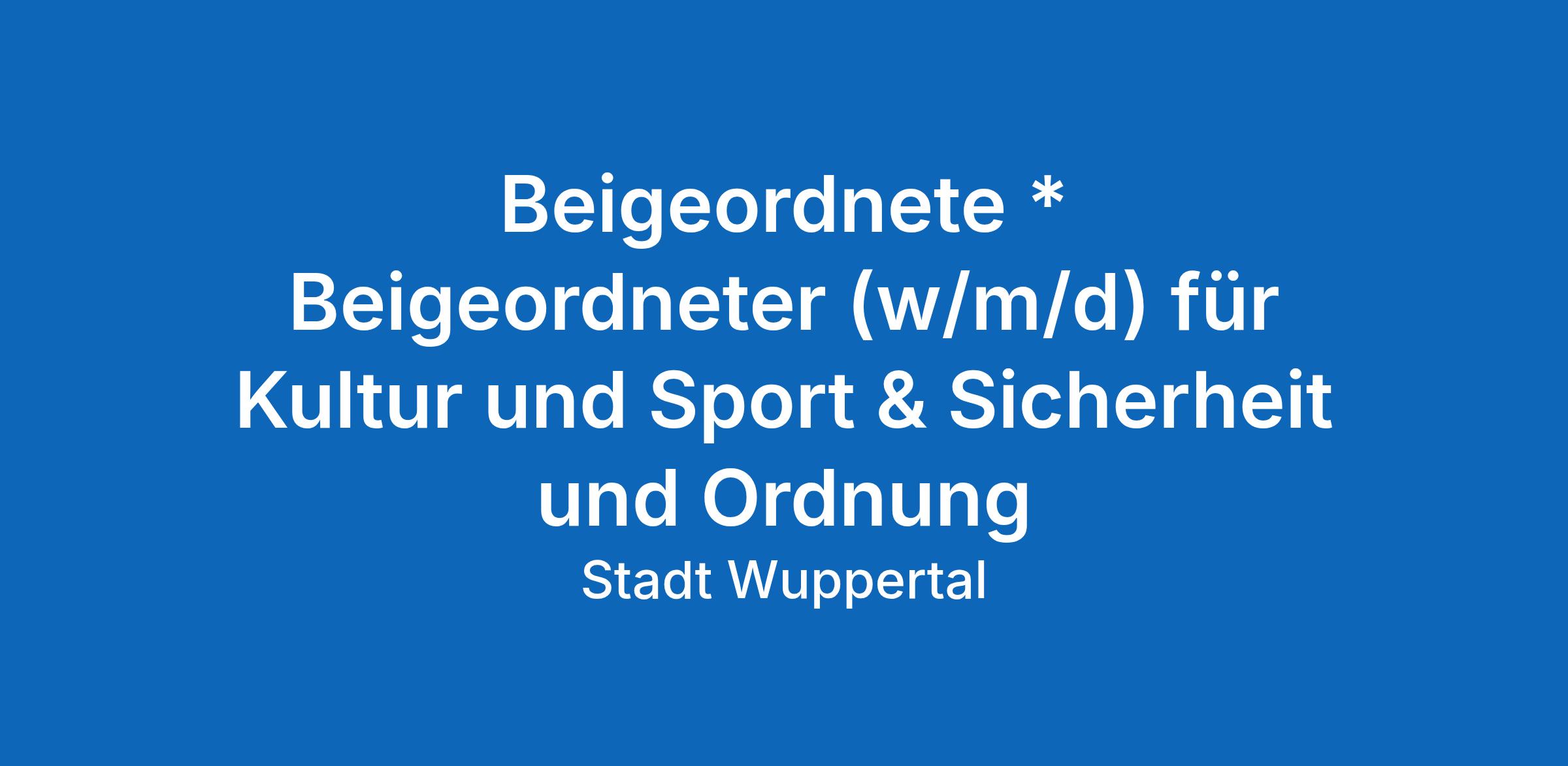 Kultur, Sport und Sicherheit sind zentrale Grundlagen für gesellschaftlichen Zusammenhalt und Lebensqualität. Mit Engagement und Überzeugung eröffnen Sie neue Perspektiven, entwickeln tragfähige Strukturen und stärken verlässliche Netzwerke mit dem Ziel, Wuppertal als attraktiven, sicheren und kulturell geprägten Lebensraum weiterzuentwickeln.
