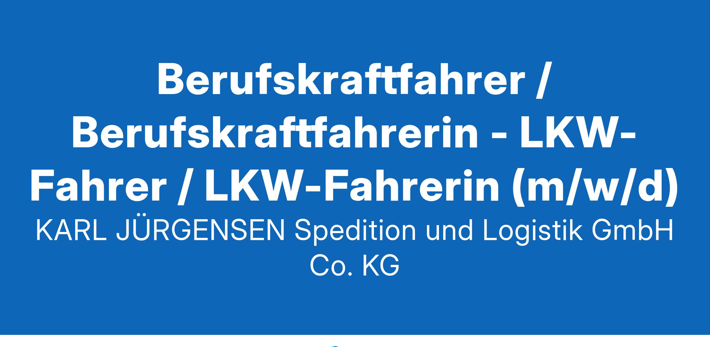 Seit 1928 steht die Marke KARL JÜRGENSEN für die Entwicklung effizienter und flexibler Transport- und Logistiklösungen. Unsere Kernkompetenzen liegen in der europaweiten Distributions- und Beschaffungslogistik sowie in der Lagerlogistik. Wir suchen für den Standort in 24837 Schleswig ab sofort einen Berufskraftfahrer (m/w/d) unbefristet und in Vollzeit für den Nahverkehr in der Abteilung "Flächen- und Linienverkehre“.Ihre Aufgaben bei unsReibungslose und pünktliche Auslieferung von Sendungen im Nahverkehr mit einem modernen LKW