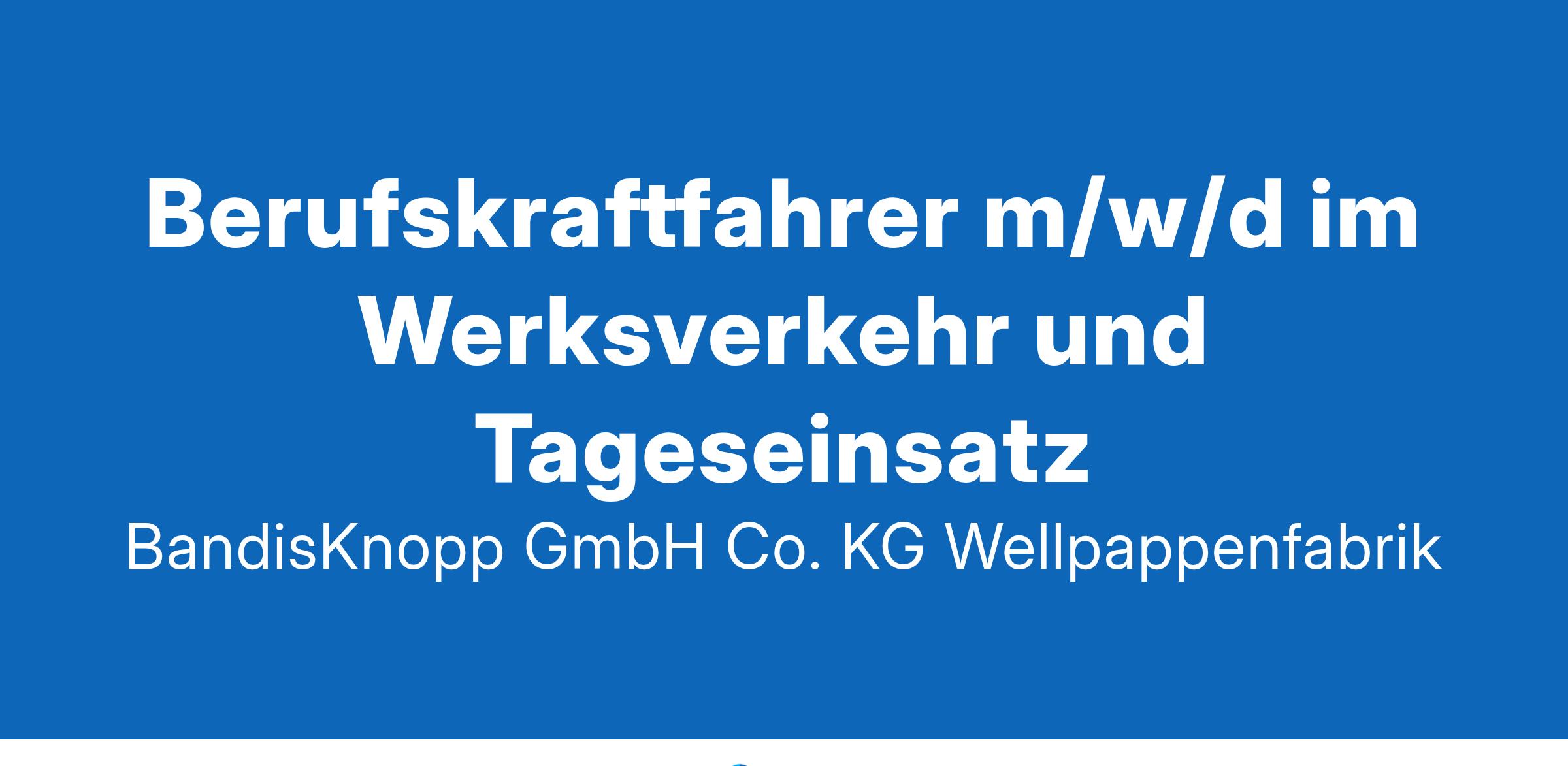 Zur Verstärkung unseres Teams suchen wir Sie zum nächstmöglichen Zeitpunkt als Berufskraftfahrer m/w/d im Werksverkehr und Tageseinsatz Bergisch GladbachIhre AufgabenSie transportieren und liefern unsere Wellpappenprodukte zu unseren Kunden im Umkreis von max. 300 km. Dabei erledigen Sie alle Frachtformalitäten und kümmern sich um die Be- und Entladung der Lkw. Fahrzeugpflege und Wartungsarbeiten gehören selbstverständlich mit zu Ihrem Aufgabengebiet. Ihr Profil Berufserfahrung Führerschein Klasse C/CE Gute Deutschkenntnisse Hohe Zuverlässigkeit und Pünktlichkeit Freundlicher Umgang mit den Kunden Bereitschaft zu flexiblen Arbeitszeiten Ihre Vorteile Als Familienunternehmen sind uns Werte wie Nachhaltigkeit, Langfristigkeit, Eigenständigkeit sowie Ehrlichkeit und Vertrauen wichtig. Die Arbeit bei uns zeichnet sich durch kurze und schnelle Entscheidungswege, Zusammenhalt und gegenseitigen Respekt aus. Aber natürlich bieten wir Ihnen auch viele ganz konkrete Vorteile: Gute Weiterbildungsmöglichkeiten Intensive Einarbeitung sowie Betreuung 30 Urlaubstage Angenehmes, familiäres Betriebsklima Ihre BewerbungSichern Sie sich einen guten Start für eine erfolgreiche Karriere. Interessiert? Dann senden Sie uns bitte Ihre ausführlichen Bewerbungsunterlagen (inkl. Anschreiben, Lebenslauf, Führerscheine, Arbeitszeugnisse) per E-Mail oder Post. Und wenn Sie vorab Fragen haben, rufen Sie uns einfach an. Bandis+Knopp GmbH & Co. KG Wellpappenfabrik