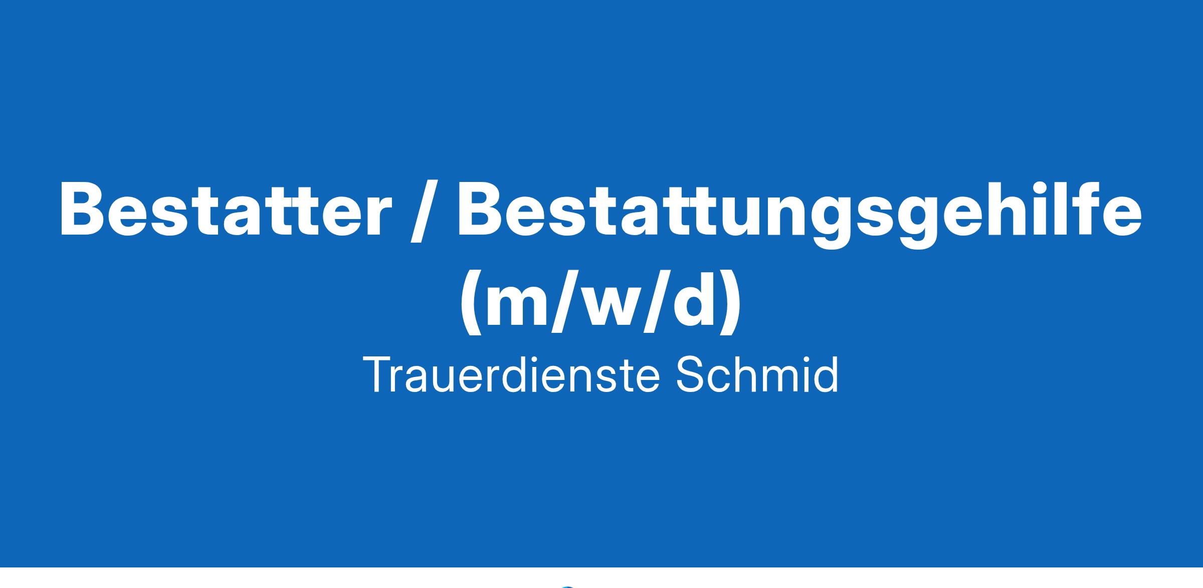 nächstmöglichen Zeitpunkt: Bestatter / Bestattungsgehilfe (m/w/d) in Vollzeit und auf Minijob-Basis. Stellenbeschreibung: Der Tätigkeitsbereich umfasst alle in einem modernen Bestattungsunternehmen anfallenden Aufgaben. Die Schwerpunkte hierbei sind u.a. : Abholung, Überführung und hygienische Versorgung Verstorbener Abwicklung von Formalitäten, Behördengänge Betreuung und Begleitung von Trauerfeiern Wartung und Pflege unseres Equipments sowie des Fuhrparks Wir wünschen uns: Zuverlässigkeit und Verantwortungsbewusstsein Physische und psychische Belastbarkeit Flexibilität und Engagement Ein freundliches, gepflegtes Erscheinungsbild Gute Umgangsformen Führerschein Klasse B Es erwartet Sie: Ein sicherer Arbeitsplatz Leistungsgerechte Bezahlung Möglichkeiten zur Weiterbildung Ein interessantes Arbeitsfeld mit einem freundlichen Team Die Regelarbeitszeit beträgt 40 Std./Woche zuzüglich Bereitschaftsdiensten nach Absprache an Sonn- und Feiertagen sowie nachts. Wir freuen uns über Ihre aussagekräftige Bewerbung an: schmid@trauerdienste-schmid.de oder per Post an: Riemer Straße 336, 81829 München