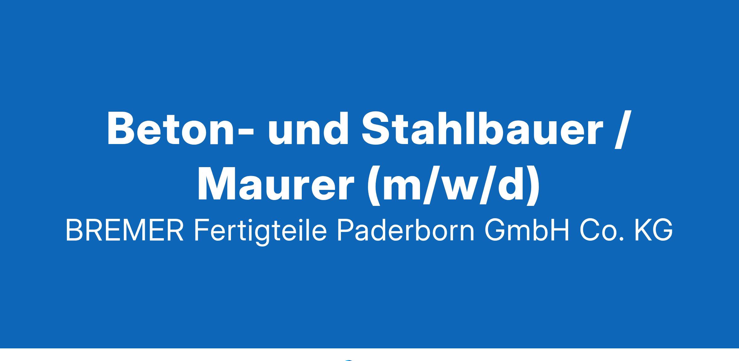 BETON- UND STAHLBETONBAUER / MAURER (m/w/d)BREMER Fertigteile Paderborn GmbH & Co. KGBerufserfahrungHandwerkProduktion, FertigungWIR SIND:In Deutschland zählt BREMER zu den führenden Unternehmen im schlüsselfertigen Industrie- und Gewerbebau. Als ganzheitlicher Anbieter der Immobilien- und Bauwirtschaft begleiten wir unsere Kunden von der Projektentwicklung über die Fertigung in eigenen Werken bis zum schlüsselfertigen Bau und den Serviceleistungen für das Gebäude im laufenden Betrieb. Das 1947 gegründete Familienunternehmen agiert an fünfzehn deutschen und zwei polnischen Standorten und erwirtschaftet aktuell eine Betriebsleistung von gut 1.100 Mio. EUR. Rund 1300 Mitarbeitenden setzen sich täglich mit Leidenschaft für den Kundenerfolg ein.IHRE AUFGABEN:Herstellung von Stahlbetonfertigteilen nach Zeichnungen