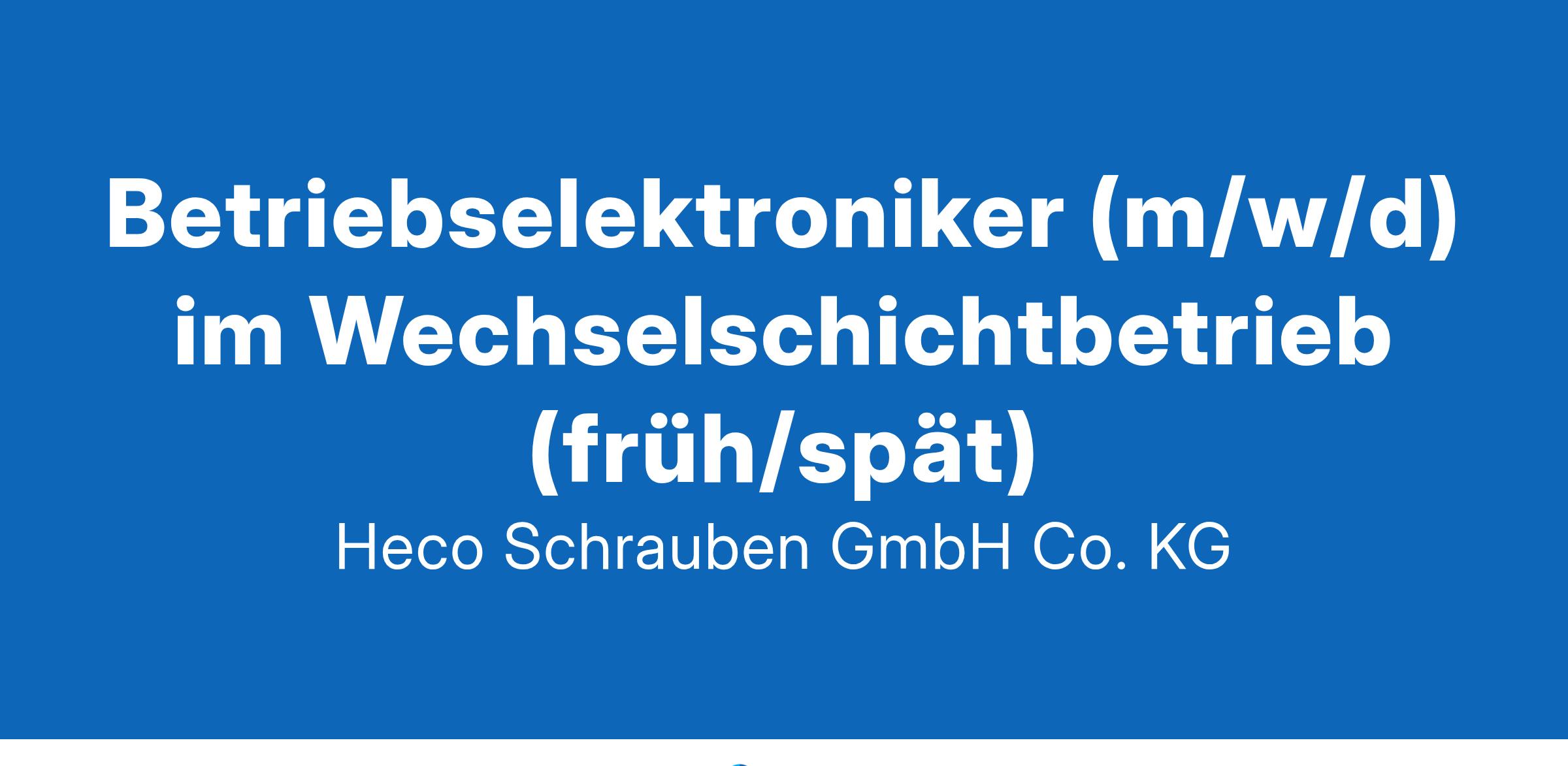 Als Familienunternehmen sind wir einer der führenden Hersteller von Schrauben- und Befestigungssystemen für den konstruktiven Holz- und Innenausbau, den Beton- und Metallbau sowie für Schwerlastbefestigungen. Mit Sitz in Schramberg / Schwarzwald beschäftigen wir derzeit ca. 400 Mitarbeitende und sind weltweit in über 40 Ländern tätig. Klingt spannend? Dann stellen Sie sich vor und schrauben an Ihrer Zukunft! Für den Standort in 78713 Schramberg suchen wir einen Betriebselektroniker (m/w/d) im Wechselschichtbetrieb (früh/spät) Ihre Aufgaben: Sie sind für die anfallenden elektrischen Reparatur,- Instandhaltungs- und Installationsarbeiten innerhalb des HECO-Maschinenparks verantwortlich. Darüber hinaus übernehmen Sie die vorbeugende Wartung an den Maschinen und Anlagen und sind für die Funktionsüberwachung sowie Prüfung der elektronischen Geräte zuständig. Ihr Profil: Sie haben eine Berufsausbildung als Elektroniker, bestenfalls im industriellen Umfeld, abgeschlossen. Idealerweise haben Sie bereits erste Berufserfahrung in vergleichbarer Position gesammelt. Sie bringen die Bereitschaft und Eignung für den Einsatz im 2‐Schichtbetrieb (früh/spät) mit. Ihre schnelle Auffassungsgabe und Ihre strukturierte Arbeitsweise runden Ihr Profil ab. Wir bieten: Unterstützung bei Ihrem Einstieg ins Unternehmen mit Willkommensordner und einem Einarbeitungsprogramm zum Kennenlernen der verschiedenen Unternehmensbereiche. Die besten Voraussetzungen für eine langfristige Beschäftigung mit Wohlfühlfaktor: sichere Arbeitsplätze mit vielfältigen Aufgabenstellungen, Weiterbildungsmöglichkeiten u. v. m. Ein attraktives Vergütungspaket mit Gruppen- und Teamprämien, erfolgsorientierter Sonderzahlung und Sachbezügen. Vielseitige Zusatzleistungen und Angebote, wie z. B. Fahrradleasing über HECO, gemeinsame Sport- und Freizeitveranstaltungen, Wasserspender im Unternehmen etc. Haben wir Ihr Interesse geweckt? Dann freuen wir uns auf Ihre Bewerbung! HIER BEWERBEN Für Fragen steht Ihnen Frau Lisa Herrmann Telefon: +49 7422 989-306 | E-Mail: personal@heco-schrauben.de gern zur Verfügung. HECO-Schrauben GmbH & Co. KG Dr.-Kurt-Steim-Straße 28 | 78713 Schramberg www.heco-schrauben.de