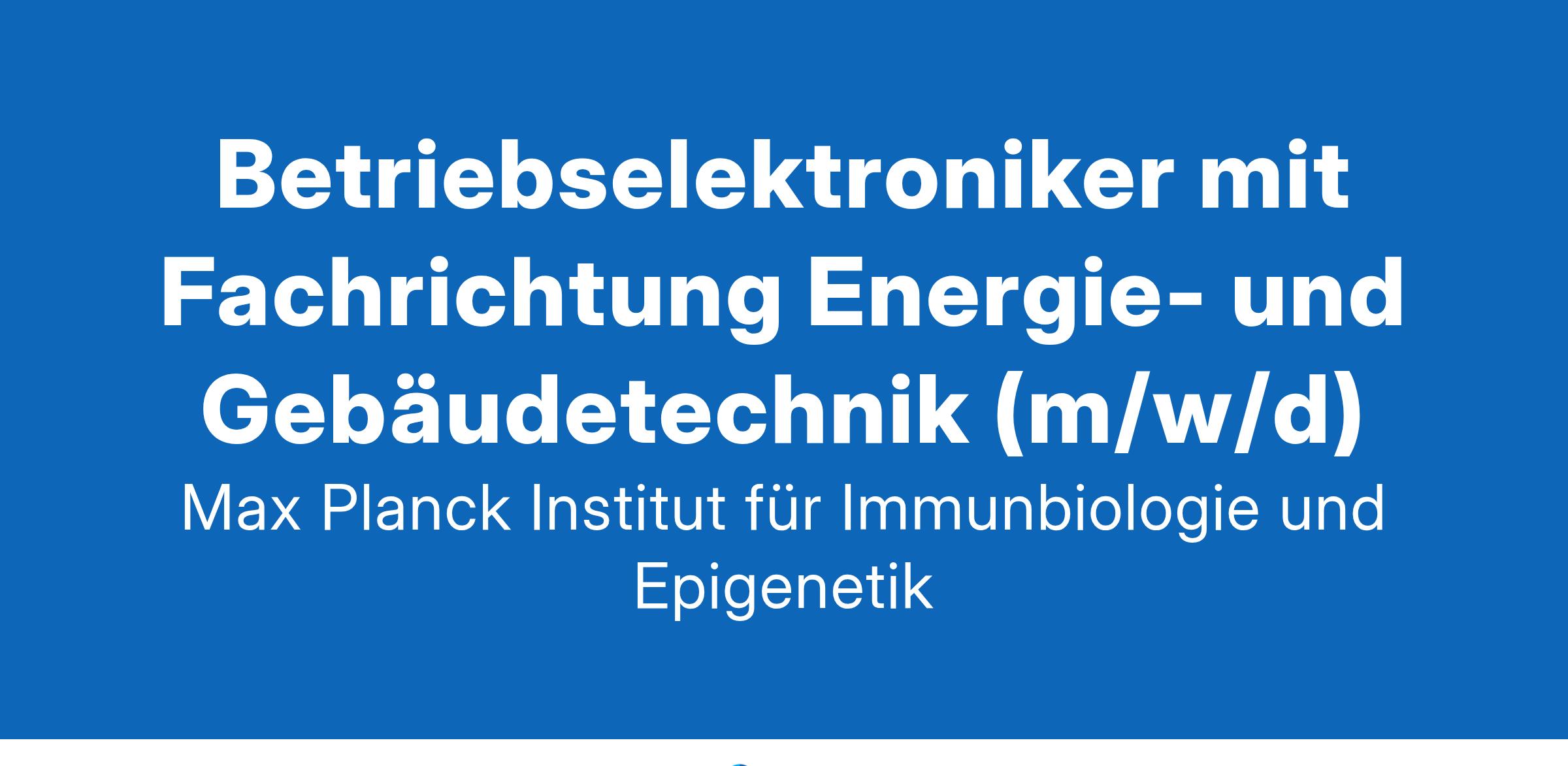 Betriebselektroniker/in mit Fachrichtung Energie- und Gebäudetechnik (m/w/d)Am Max-Planck-Institut für Immunbiologie und Epigenetik in Freiburg ist in der Haustechnik eine Stelle als Betriebs elektroniker/in (m/w/d) zu besetzen.Die Anstellung ist unbefristet.IHRE AUFGABEN:Als Mitarbeiter/in in der Haustechnik sind Sie besonders verantwortlich für die Betreuung, die Unterhaltung, die regelmäßige Wartung, die Reparatur und die Instandhaltung der elektrischen und raumluft technischen Anlagen und Geräte. Ebenso beinhaltet der Aufgabenbereich die Beschaffung von elektrischen Ersatzteilen und Material sowie die Betreuung der Aufzüge.Die allgemeine elektrische Hausversorgung sowie Pflege und Dokumentation der Pläne und Unterlagen für das Gewerk Elektro und die Betreuung und Wartung des Datennetzes, in Zusammenarbeit mit der IT, runden das Aufgabengebiet ab.IHRE QUALIFIKATIONEN:Sie sind im Besitz einer abgeschlossenen Ausbildung zum/zur Elektroniker/in für Energie und Gebäude technik oder einer vergleichbaren Ausbildung, eine Weiterbildung zum/zur Meister/in wäre von Vorteil.Sie haben Berufserfahrung in den oben genannten Aufgaben gesammelt und bewegen sich sicher in den relevanten Richtlinien und Verordnungen (z. B. DGUV, VDE, EN DIN).Teamfähigkeit, Flexibilität und Belastbarkeit gehören zu Ihren Stärken. Die Teilnahme an Weiterbildungs maßnahmen, verantwortungsvolles und selbstständiges Arbeiten sowie die Übernahme von Rufbereitschafts diensten (auch an Wochenenden und Feiertagen) sind für Sie selbstverständlich.Englischkenntnisse sind wünschenswert, aber keine Bedingung.WIR BIETEN:Eingebettet in eine Region, die Deutschland, Frankreich und die Schweiz verbindet, bietet unser Institut ein internationales Forschungsumfeld mit herausragenden Infrastruktureinrichtungen und positivem Arbeitsklima, das hohen Wert auf die Vereinbarkeit von Beruf und Privatleben legt.