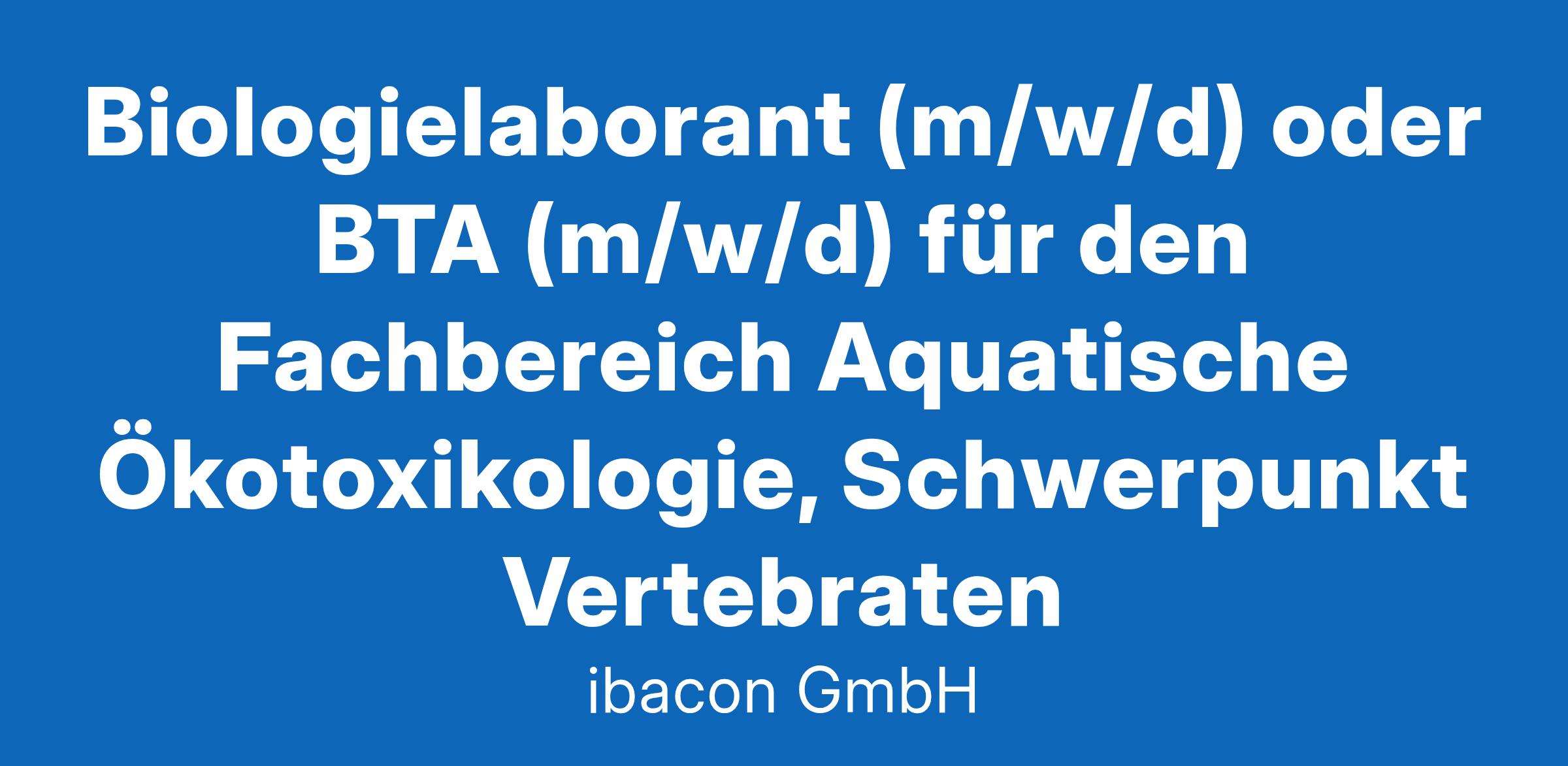 Wir möchten eine offene Stelle als Biologielaborant (m/w/d) oder BTA (m/w/d) in dem Fachbereich Aquatische Ökotoxikologie besetzen. Aufgabe des zukünftigen Stelleninhabers (m/w/d) ist die GLP-konforme Durchführung von ökotoxikologischen Studien.