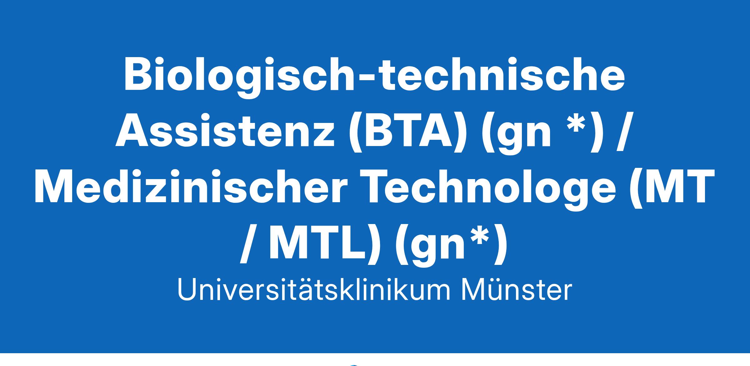 Biologisch-technische Assistenz (BTA) (gn *) / Medizinischer Technologe (MT / MTL) (gn*) Befristet auf 3 Jahre | In Teilzeit mit 19,25 Wochenstunden | Vergütung nach TV-L | Klinik für Kinder- und Jugendmedizin, Allgemeine Pädiatrie | Arbeitsgruppe von Dr. Dr. med. Alexander Busch | Kennziffer 10196 Wir sind das UKM. Wir haben einen klaren gesellschaftlichen Auftrag und mit der Verbindung von Krankenversorgung, Forschung und Lehre eine besondere gesellschaftliche Verantwortung. Damit wir unserem hohen Anspruch tagtäglich gerecht werden, freuen wir uns auf Deine fachliche Kompetenz in der Arbeitsgruppe von Dr. Dr. med. Alexander Busch. Die DFG-geförderte Forschungsgruppe konzentriert sich auf die Erforschung der Regulation der Hypothalamus-Hypophysen-Gonaden-Achse (HPG). Die Gruppe untersucht Regulationsmechanismen der frühen neuroendokrinologischen Aktivitätsphasen-Achse während der Minipubertät und der Pubertät. Durch die Kombination klinischer, genetischer und laborchemischer Verfahren soll ein Einblick in Fortpflanzungsstörungen und das Fortpflanzungspotenzial gewonnen werden – am besten mit DIR! VERANTWORTUNGSVOLLE AUFGABEN: Molekularbiologische Tätigkeiten (Single cell RNA-seq, Zellkultur) Immunhistochemische Färbungen Pflege der Biobank Sorgfältige Dokumentation Organisation des Laboralltags/Bestellmanagement ANFORDERUNGEN: Eine abgeschlossene BTA-/MTA-Berufsausbildung Praktische Erfahrungen in molekularbiologischen, histologischen und Zellkulturtechniken Affinität zur Immunfluoreszenzmikroskopie Selbstständige, zuverlässige und strukturierte Arbeitsweise mit Qualitätsbewusstsein Flexibilität, Teamfähigkeit und Kommunikationsvermögen sowie Motivation Grundlegende MS-Office-Kenntnisse Gute Deutsch- und Englischkenntnisse WIR BIETEN: Flexible Arbeitszeiten in Teilzeit Aktive Mitgestaltung des eigenen Tätigkeitsfeldes Integration ins wissenschaftliche Team Eine vielseitige und anspruchsvolle Tätigkeit Rückfragen an: Dr. Dr. med. Alexander Busch, alexandersiegfried.busch[AT]ukmuenster.de. Jetzt bewerben über unser Karriereportal bis zum 18.02.2025. BESTE BEDINGUNGEN: Abwechslungsreich Familienfreundlich Wertschätzung Sicherheit Vieles mehr ... Abwechslungsreich Familienfreundlich Wertschätzung Sicherheit Weitere Vorteile (*gn=geschlechtsneutral) Das UKM unterstützt die Vereinbarkeit von Beruf und Familie und ist daher als familienbewusstes Unternehmen zertifiziert. Es besteht grundsätzlich die Möglichkeit der Teilzeitbeschäftigung. Im Rahmen der gesetzlichen Vorschriften werden Frauen sowie Schwerbehinderte bei gleicher Eignung bevorzugt berücksichtigt. Aufgrund der gesetzlichen Vorgaben gemäß Masernschutzgesetz ist eine Tätigkeit bei uns nur mit vollständigem Impfschutz gegen Masern möglich. Universitätsklinikum Münster