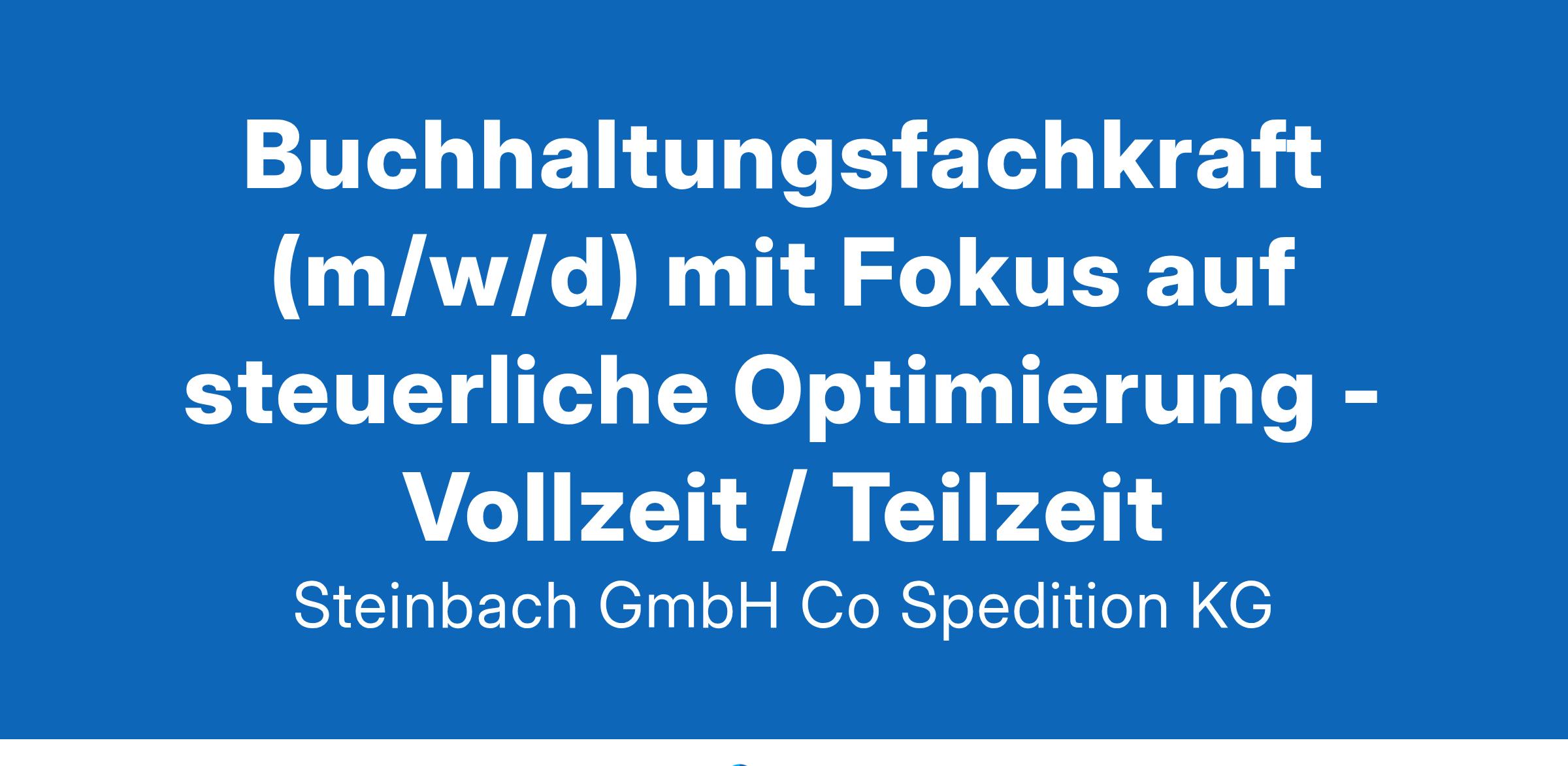 Über die Steinbach GmbH & Co Spedition KGSeit 1963 steht das Familienunternehmen Steinbach GmbH & Co Spedition KG als Experte für Logistik und Transporte. Unser Erfolg beruht auf engagierten und qualifizierten Mitarbeitern, die Tag für Tag Außergewöhnliches leisten. Zur Verstärkung unseres Teams suchen wir eine motivierte und detailverliebte Buchhaltungsfachkraft (m/w/d), die unsere Leidenschaft für Genauigkeit und Effizienz teilt.Wir setzen auf langfristige Beziehungen und sind stolz darauf, viele unserer langjährigen Mitarbeiter selbst ausgebildet zu haben.Finanzbuchhalter/-in (m/w/d) mit fundierten Kenntnissen im Steuerrecht in Vollzeit oder Teilzeit gesucht! Bayreuth - Festanstellung- ab sofortDas erwarten wir Finanzguru: Bearbeite die laufende Finanzbuchhaltung Detektiv der Konten: Stimme Konten ab, kläre offene Posten und sorge für Klarheit durch Mahnungen und Saldenbestätigungen Workflow-Wizard: Wickle Rechnungen über unseren elektronischen Workflow ab und halte den Zahlungsverkehr reibungslos am Laufen Hüter der Debitoren- und Kreditorenkonten: Überwache die Debitoren- und Kreditorenkonten und behalte den Überblick über dein Herrschaftsgebiet Budget-Buddy: Unterstütze bei der Optimierung interner ProzesseDas erwartet Dich Vergütung: Attraktive Vergütung und umfassende Sozialleistungen, steuerfreier Warengutschein, Jobrad... Modernität: Ein modernes Arbeitsumfeld, in dem Du Dich wohlfühlen wirst Wir sind ein gutes Team: Regelmäßige Teamevents und Trainings intern und extern gehören bei uns dazu! Du kannst Dich auf Firmenfeste, Grillevents oder Teamtage freuen Entwicklung: Flache Hierarchien, kurze Entscheidungswege sowie Entwicklungsmöglichkeiten Flexibilität: Flexible Arbeitszeiten und die Möglichkeit zum Homeoffice Verantwortung: Eine verantwortungsvolle und abwechslungsreiche Tätigkeit in einem dynamischen Team Sicherheit: Ein unbefristeter Arbeitsvertrag, der auf eine dauerhafte Zusammenarbeit ausgelegt istHaben wir Dein Interesse geweckt?Suchst Du nach einer neuen beruflichen Herausforderung?DANN WERDE JETZT TEIL UNSERES TEAMS!Jetzt bewerben