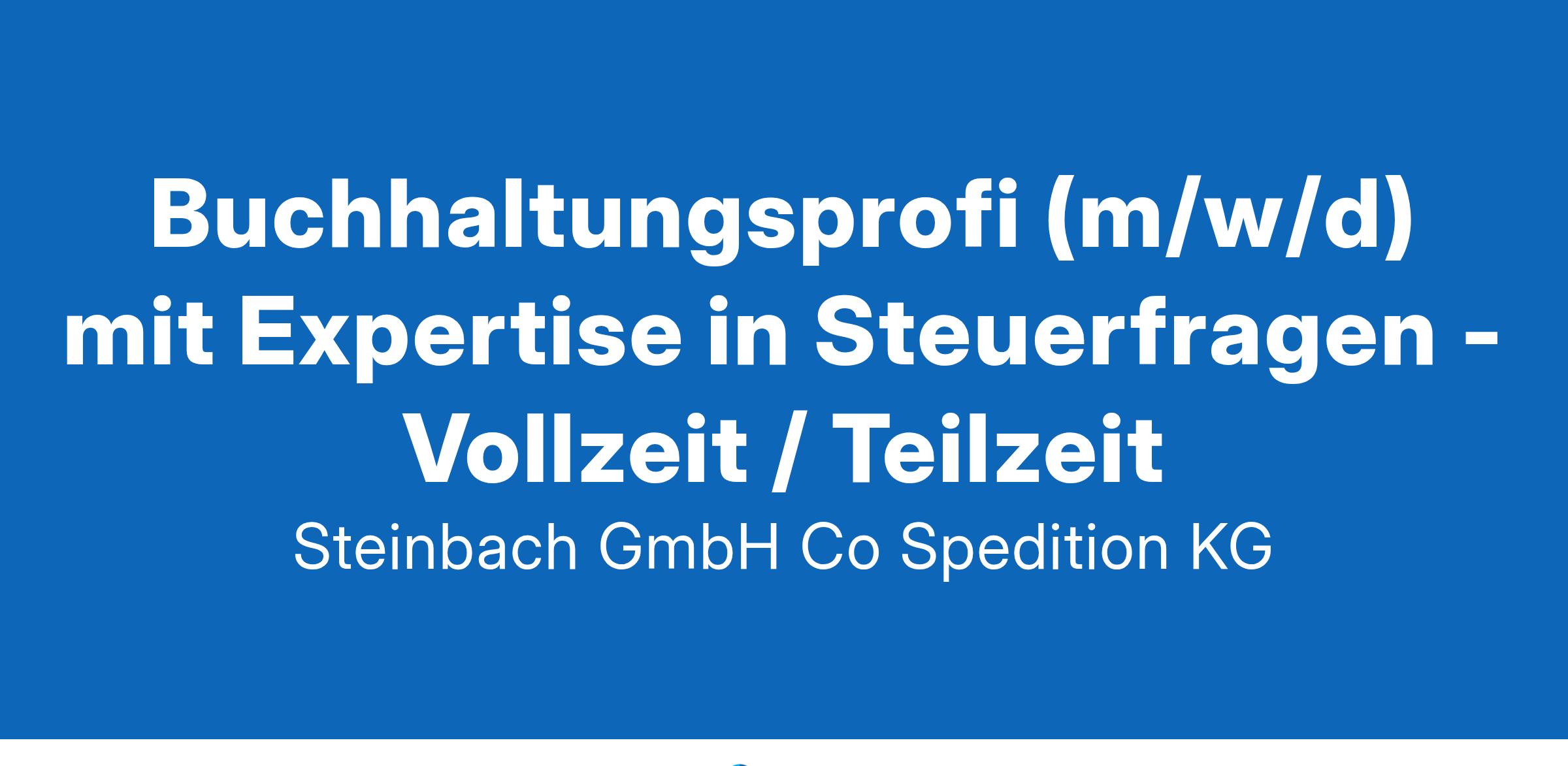 Über die Steinbach GmbH & Co Spedition KGSeit 1963 steht das Familienunternehmen Steinbach GmbH & Co Spedition KG als Experte für Logistik und Transporte. Unser Erfolg beruht auf engagierten und qualifizierten Mitarbeitern, die Tag für Tag Außergewöhnliches leisten. Zur Verstärkung unseres Teams suchen wir eine motivierte und detailverliebte Buchhaltungsfachkraft (m/w/d), die unsere Leidenschaft für Genauigkeit und Effizienz teilt.Wir setzen auf langfristige Beziehungen und sind stolz darauf, viele unserer langjährigen Mitarbeiter selbst ausgebildet zu haben.Finanzbuchhalter/-in (m/w/d) mit fundierten Kenntnissen im Steuerrecht in Vollzeit oder Teilzeit gesucht! Bayreuth - Festanstellung- ab sofortDas erwarten wir Finanzguru: Bearbeite die laufende Finanzbuchhaltung Detektiv der Konten: Stimme Konten ab, kläre offene Posten und sorge für Klarheit durch Mahnungen und Saldenbestätigungen Workflow-Wizard: Wickle Rechnungen über unseren elektronischen Workflow ab und halte den Zahlungsverkehr reibungslos am Laufen Hüter der Debitoren- und Kreditorenkonten: Überwache die Debitoren- und Kreditorenkonten und behalte den Überblick über dein Herrschaftsgebiet Budget-Buddy: Unterstütze bei der Optimierung interner ProzesseDas erwartet Dich Vergütung: Attraktive Vergütung und umfassende Sozialleistungen, steuerfreier Warengutschein, Jobrad... Modernität: Ein modernes Arbeitsumfeld, in dem Du Dich wohlfühlen wirst Wir sind ein gutes Team: Regelmäßige Teamevents und Trainings intern und extern gehören bei uns dazu! Du kannst Dich auf Firmenfeste, Grillevents oder Teamtage freuen Entwicklung: Flache Hierarchien, kurze Entscheidungswege sowie Entwicklungsmöglichkeiten Flexibilität: Flexible Arbeitszeiten und die Möglichkeit zum Homeoffice Verantwortung: Eine verantwortungsvolle und abwechslungsreiche Tätigkeit in einem dynamischen Team Sicherheit: Ein unbefristeter Arbeitsvertrag, der auf eine dauerhafte Zusammenarbeit ausgelegt istHaben wir Dein Interesse geweckt?Suchst Du nach einer neuen beruflichen Herausforderung?DANN WERDE JETZT TEIL UNSERES TEAMS!Jetzt bewerben