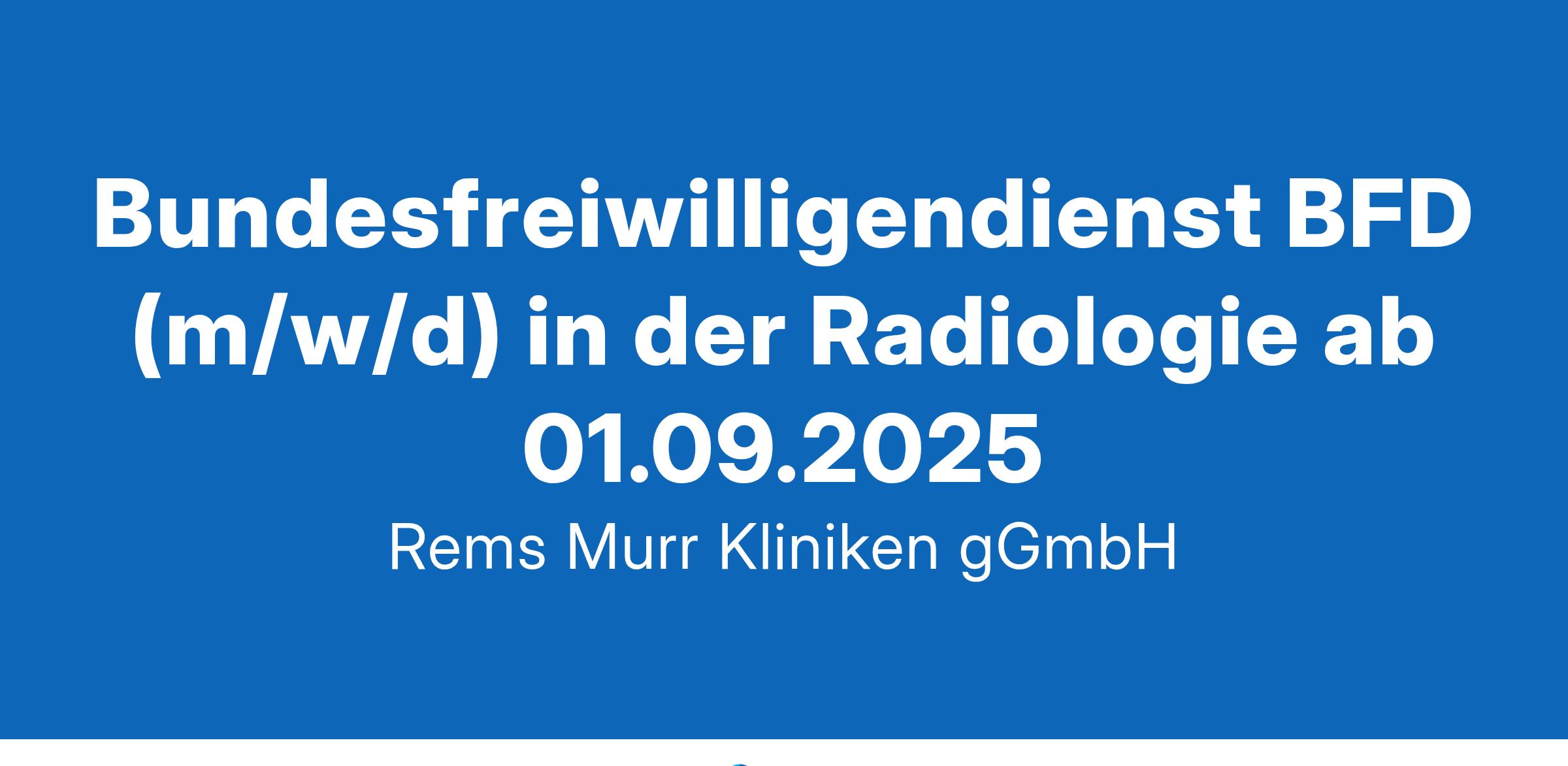 Wir bieten ab 01.09.2025 einen Platz in Vollzeit in unserem Klinikum in Winnenden im RahmenBundesfreiwilligendienst BFD (m/w/d) in der Radiologie ab 01.09.2025Referenznummer: W-2-303-24Welche Einsatzmöglichkeiten gibt es noch? Ab 01.09.2025:Radiologie Winnenden