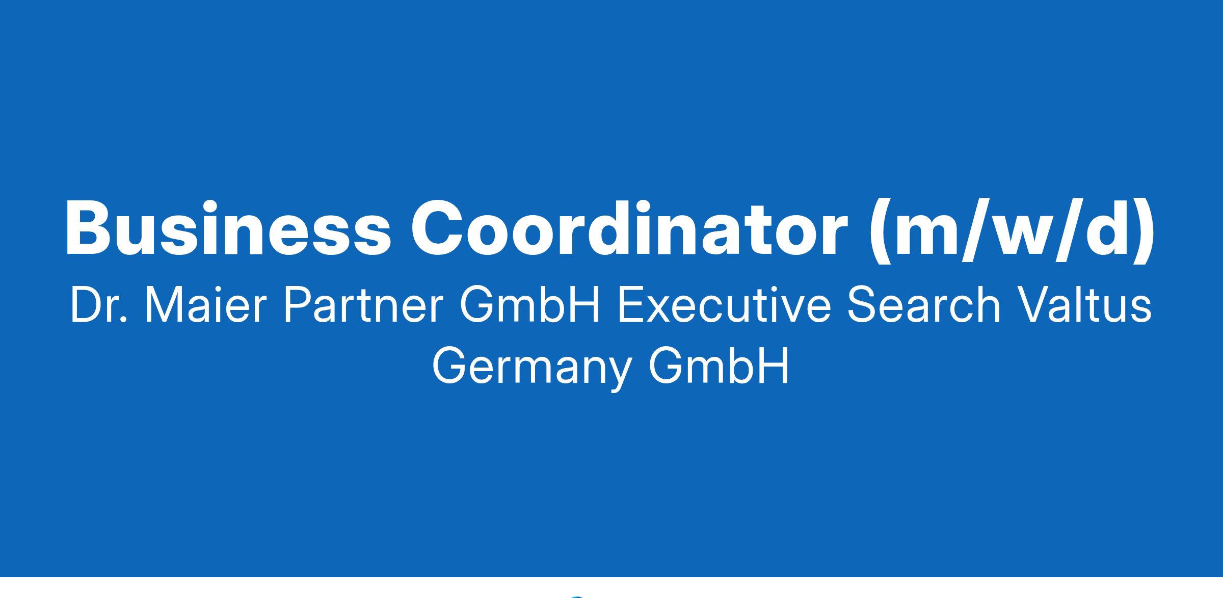 Business Coordinator (m/w/d)MünchenVollzeitDie im süddeutschen Raum renommierte Personalberatung Dr. Maier + Partner mit Hauptsitz in Stuttgart und Valtus, der europäische Marktführer für Interim Management, haben gemeinsam das Joint Venture Valtus Germany gegründet. Am neu eröffneten, zentral gelegenen Standort in München suchen Dr. Maier + Partner Executive Search und Valtus Germany einen Business Coordinator (m/w/d) in Vollzeit.