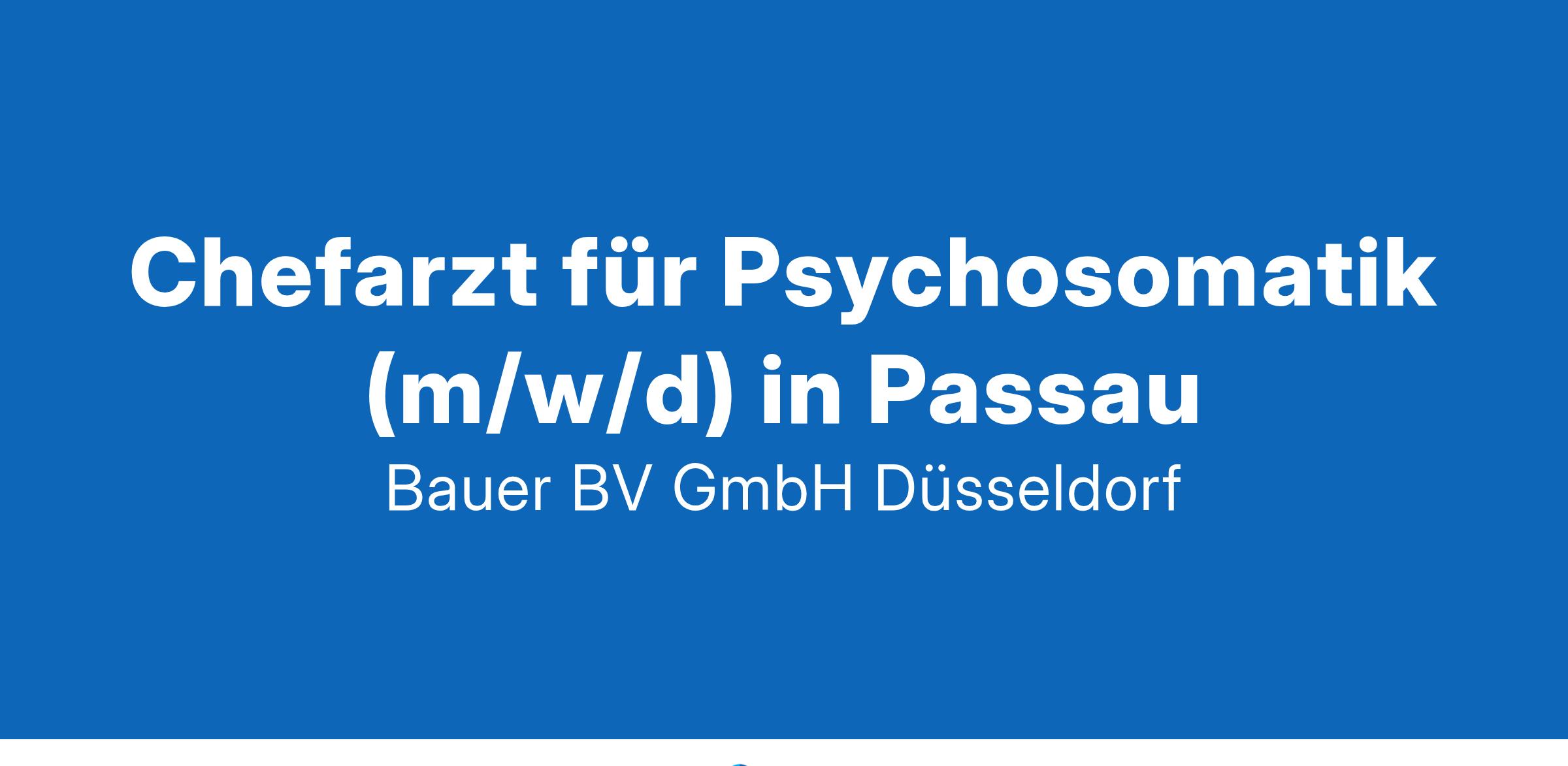 Standort: PassauIhr neuer Arbeitsplatz:Moderne Fachklinik für Psychosomatische Medizin im Raum Passau mit umfangreichem Behandlungsspektrum im Rahmen einer stationären/ambulanten Rehabilitation, Anschlussheilbehandlung, Krankenhausbehandlung oder Präventionsmaßnahme.Ihr Aufgabenbereich:Fachliche Leitung, Führung und Supervision des gesamten TeamsAktive Weiterentwicklung des medizinischen Konzepts der FachabteilungOrganisatorische Aufgaben und chefärztliche GesamtverantwortungIhre Vorteile:Attraktiver KlinikstandortBreites BehandlungsspektrumAufgeschlossenes TeamFlexible ArbeitszeitmodelleMöglichkeit der PrivatliquidationAttraktive VergütungUnbefristete FestanstellungIhr Profil:Facharzt für Psychosomatische Medizin oder Psychiatrie und Psychotherapie (m/w/d)Berufserfahrung im psychosomatischen BereichGerne Führungserfahrungen sowie ZusatzbezeichnungenIhr Ansprechpartner:Bauer B+V Personalberatung