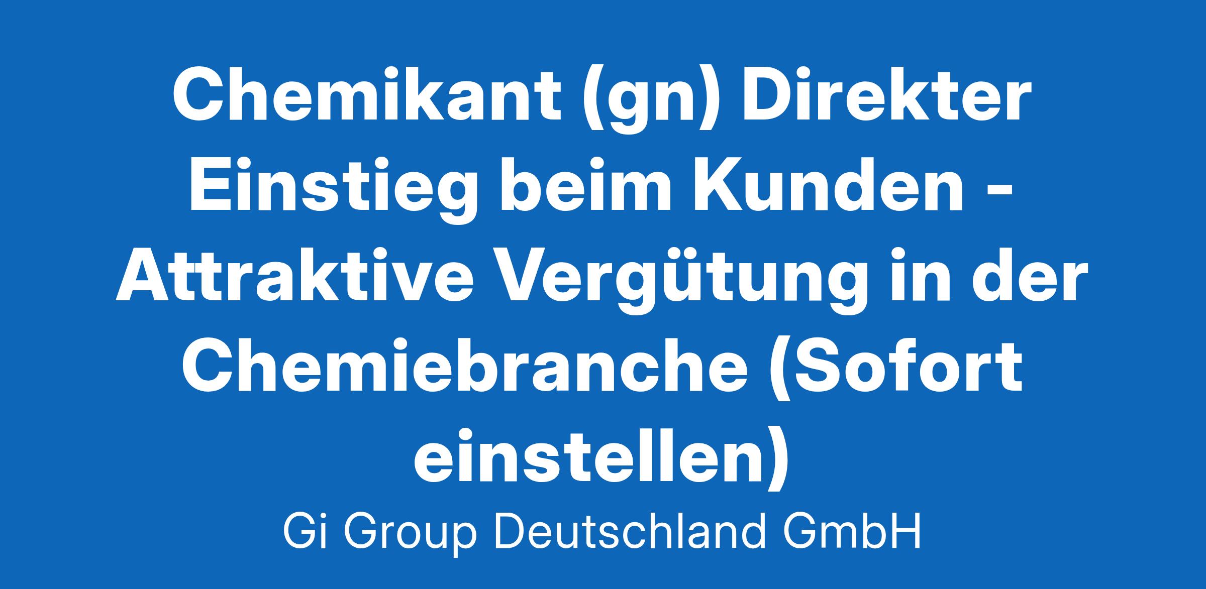 Chemikant (gn) Direkter Einstieg beim Kunden ab sofort in Vollzeit in Frankfurt am Main Die Gi Group ist ein international agierender Personaldienstleister mit mehr als 500 Standorten in 40 Ländern. Im Rahmen der Direktvermittlung suchen wir, für unseren Kunden in Frankfurt am Main, einen Chemikant. Deine Benefits Im Rahmen der Personalvermittlung vermittelt Dich die Gi Group als Chemikant an ein renommiertes Kundenunternehmen aus der Pharmabranche Während des gesamten Bewerbungsprozesses stehen Dir die Personalberater der Gi Group bei Fragen und Anliegen zur Verfügung Durch unsere langjährige Zusammenarbeit mit dem Kundenunternehmen sorgen wir für schlanke und schnelle Bewerbungsprozesse und platzieren Dich optimal Du erhältst einen Arbeitsvertrag direkt beim Kundenunternehmen Eine attraktive Vergütung, aufgrund der Zugehörigkeit zur Chemiebranche Vielfältige Entwicklungsmöglichkeiten innerhalb des internationalen Unternehmensnetzwerks Dein Tätigkeitsbereich Deine Hauptaufgabe ist das Steuern und Überwachen der einzelnen Herstellschritte innerhalb der Prozesskette Auch unterstützende Tätigkeiten bei der Instandhaltung der Anlage gehören zu deinem Aufgabenbereich Du bedienst ordnungsgemäß Abfüllanlagen, Kontroll- und Spülmaschinen sowie Depalettierer Zusätzlich führst du ergänzende pharmazeutischen Maßnahmen zur Sicherstellung des Herstellungsprozesses durch Durchgehende Dokumentationen werden von Dir anhand der Prozesskette erstellt Alle Tätigkeiten führst Du ordnungsgemäß nach Verfahrensanweisung durch und achtest stets aus die Abläufe hinsichtlich GMP und SGU-Gesichtspunkten Dein Profil Du verfügst neben einer abgeschlossenen naturwissenschaftliche oder technischen Ausbildung auch Berufserfahrung in der Pharma- oder Lebensmittelindustrie Du hast Erfahrung im Reinraum sowie bei antiseptischen Herstellungsprozessen Neben guten Deutschkenntnissen in Wort und Schrift verfügst Du ebenfalls über ausreichende EDV-Kenntnisse (bspw. MS-Office oder SAP) Die Arbeit im Schichtbetrieb ist für dich selbstverständlich Neben einem hohen Maß an Eigenverantwortung bringst Du die Eigenmotivation mit, dich in fachfremde, anlagentechnische Themenstellungen einzuarbeiten Der Bewerbungsprozess Für Deine Bewerbung als Chemikant klicke bitte einfach auf „Jetzt bewerben“. Dort kannst Du Deine Kontaktdaten eingeben sowie Deinen Lebenslauf und Deine Bewerbungsunterlagen hochladen. Gerne kannst Du uns auch Deine Bewerbungsunterlagen per E-Mail zusenden. Wir freuen uns auf Deine Bewerbung! Unsere Stellenangebote richten sich an Arbeitssuchende jeglichen Geschlechts. (gn) = geschlechtsneutral. Kontakt Gi Group Recruiting Team