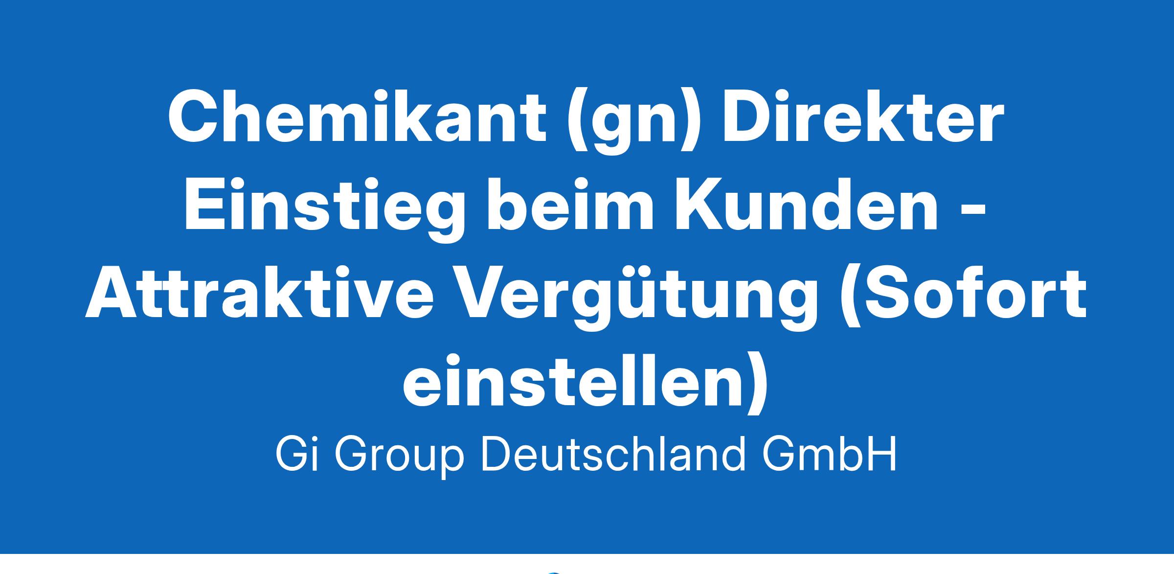 Chemikant (gn) Direkter Einstieg beim Kunden ab sofort in Vollzeit in Frankfurt am Main Die Gi Group ist ein international agierender Personaldienstleister mit mehr als 500 Standorten in 40 Ländern. Im Rahmen der Direktvermittlung suchen wir, für unseren Kunden in Frankfurt am Main, einen Chemikant. Deine Benefits Im Rahmen der Personalvermittlung vermittelt Dich die Gi Group als Chemikant an ein renommiertes Kundenunternehmen aus der Pharmabranche Während des gesamten Bewerbungsprozesses stehen Dir die Personalberater der Gi Group bei Fragen und Anliegen zur Verfügung Durch unsere langjährige Zusammenarbeit mit dem Kundenunternehmen sorgen wir für schlanke und schnelle Bewerbungsprozesse und platzieren Dich optimal Du erhältst einen Arbeitsvertrag direkt beim Kundenunternehmen  Eine attraktive Vergütung, aufgrund der Zugehörigkeit zur Chemiebranche Vielfältige Entwicklungsmöglichkeiten innerhalb des internationalen Unternehmensnetzwerks Dein Tätigkeitsbereich Deine Hauptaufgabe ist das Steuern und Überwachen der einzelnen Herstellschritte innerhalb der Prozesskette Auch unterstützende Tätigkeiten bei der Instandhaltung der Anlage gehören zu deinem Aufgabenbereich Du bedienst ordnungsgemäß Abfüllanlagen, Kontroll- und Spülmaschinen sowie Depalettierer Zusätzlich führst du ergänzende pharmazeutischen Maßnahmen zur Sicherstellung des Herstellungsprozesses durch Durchgehende Dokumentationen werden von Dir anhand der Prozesskette erstellt Alle Tätigkeiten führst Du ordnungsgemäß nach Verfahrensanweisung durch und achtest stets aus die Abläufe hinsichtlich GMP und SGU-Gesichtspunkten Dein Profil Du verfügst neben einer abgeschlossenen naturwissenschaftliche oder technischen Ausbildung auch Berufserfahrung in der Pharma- oder Lebensmittelindustrie Du hast Erfahrung im Reinraum sowie bei antiseptischen Herstellungsprozessen Neben guten Deutschkenntnissen in Wort und Schrift verfügst Du ebenfalls über ausreichende EDV-Kenntnisse (bspw. MS-Office oder SAP) Die Arbeit im Schichtbetrieb ist für dich selbstverständlich Neben einem hohen Maß an Eigenverantwortung bringst Du die Eigenmotivation mit, dich in fachfremde, anlagentechnische Themenstellungen einzuarbeiten Der Bewerbungsprozess Für Deine Bewerbung als Chemikant klicke bitte einfach auf „Jetzt bewerben“. Dort kannst Du Deine Kontaktdaten eingeben sowie Deinen Lebenslauf und Deine Bewerbungsunterlagen hochladen. Gerne kannst Du uns auch Deine Bewerbungsunterlagen per E-Mail zusenden. Wir freuen uns auf Deine Bewerbung! Unsere Stellenangebote richten sich an Arbeitssuchende jeglichen Geschlechts. (gn) = geschlechtsneutral. Kontakt Gi Group Recruiting Team