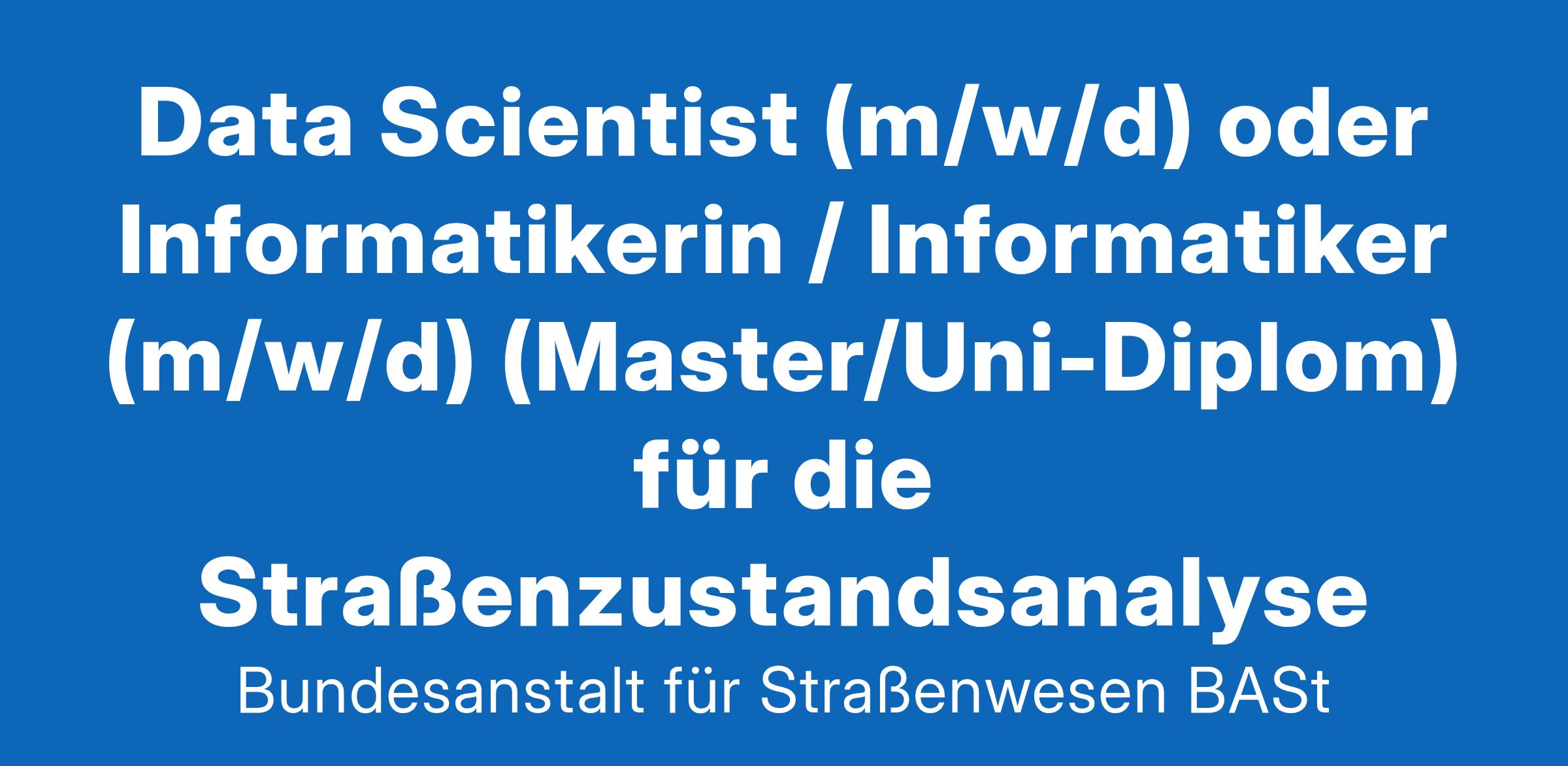 Die Erhaltung der Straßeninfrastruktur stellt eine der wichtigsten Aufgaben des Bundes dar. Hierzu wird im Rahmen der Zustandserfassung und ‑bewertung (ZEB) das Straßennetz mit Hilfe speziell ausgestatteter Messfahrzeuge regelmäßig befahren. Als zukünftiger Data Scientist der Abteilung Straßenbautechnik der BASt wirken Sie bei der Auswertung der aufgenommenen Daten mit, indem Sie in unterschiedlichen Projekten die Auswertemethoden und ‑prozesse konzipieren, pilotieren und die Auswertequalität sichern. Wenn Sie Experte/Expertin auf dem Gebiet der Datenauswertung sind, Sie die KI‑basierte Analyse von hunderten Terabyte Bildmaterial begeistert und Sie die Zukunft der Verkehrsinfrastruktur mitgestalten wollen, werden Sie Teil unseres Teams!
