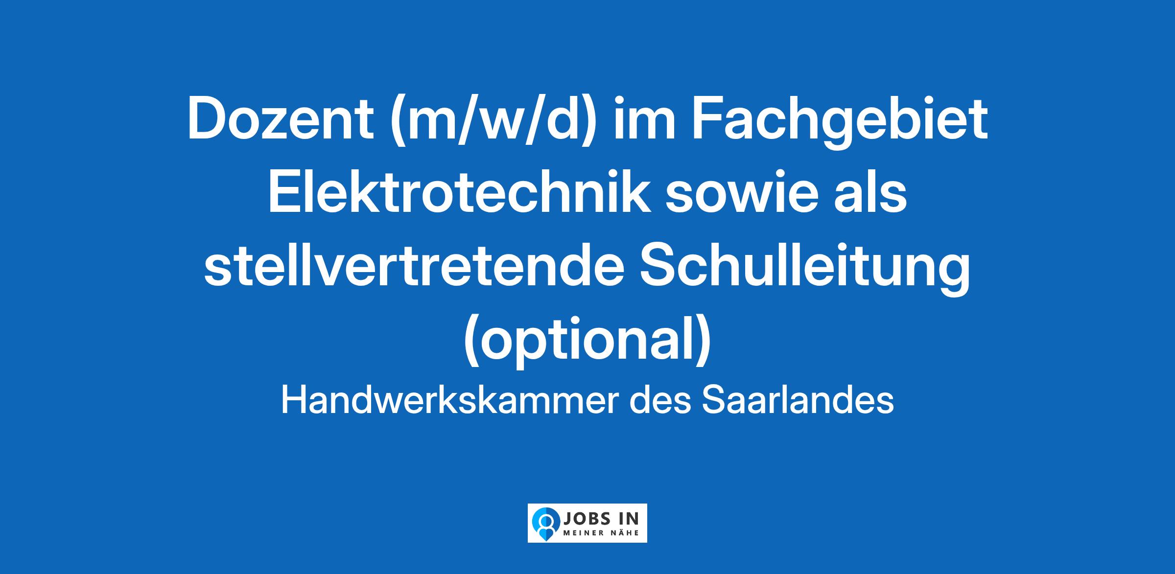 Mit einem umfassenden Informations-, Beratungs- und Bildungsangebot ist die Handwerkskammer des Saarlandes (HWK) das Dienstleistungszentrum für alle saarländischen Handwerksunternehmen und deren Beschäftigte. Die Mitarbeitenden unserer HWK sagen von sich: „Ich arbeite gern bei der H... Lehrer Elektrotechnik, Berufsschullehrer, Fachlehrer Technik, Elektrotechnik Dozent, Technikerlehrer, Ausbilder Elektrotechnik, Trainer Elektrotechnik, Lehrkraft Technik, Pädagoge Elektrotechnik, Schulleitung, Stellvertretende Schulleitung, Erwachsenenbildung, Ausbildung, Unterricht, Lehrgangsleitung, Prüfungswesen, Bildungsmanagement, Schulorganisation, Didaktik, Weiterbildung, Berufsausbildung, Technikpädagogik, Saarbrücken, Handwerk, Öffentlicher Dienst, Verwaltung, HWK, Handwerkskammer des Saarlandes Schulleitung;Führung;Kursmanagement;Regelungstechnik;Freiwilligensektor;Technikerarbeit;Prüfungswesen;Fachmesse;Entwicklung;Schulen;Managementsystem;Antrieb;Bildungsarbeit;Tagungskoordination;Vorlesungen halten;Technikerschule;Energietechnik;Betreuung Original Stellenanzeige auf StepStone.de – Jetzt Jobagent bei StepStone einrichten und Traumjob finden! https://bit.ly/2KOagYD Mehr Informationen zu Arbeitgebern, Gehaltsdaten und Karrieretipps finden Sie auf StepStone.de