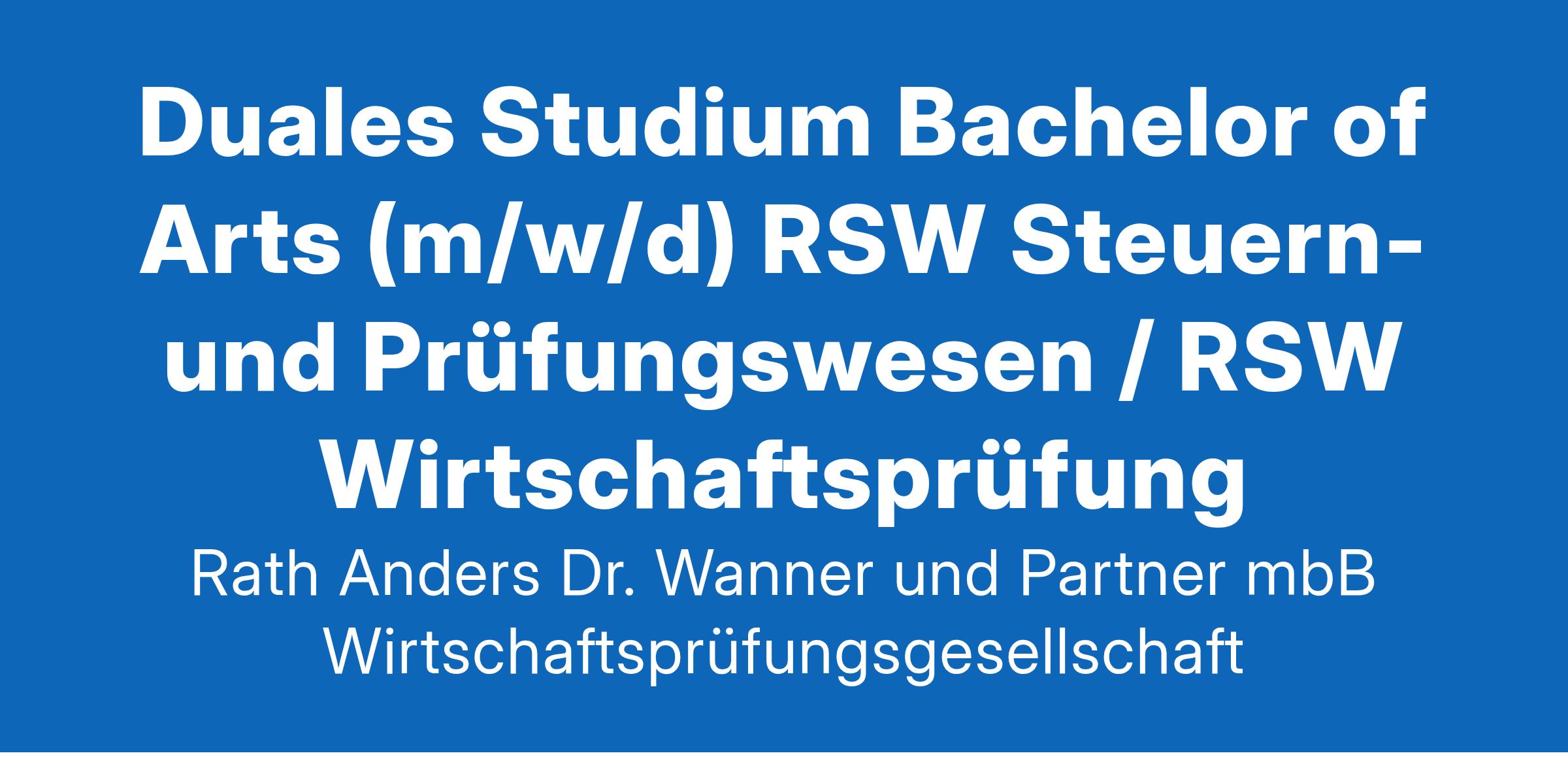Jetzt bist Du am Zug:R·A·W - Partner – seit 1965 die Kanzlei, die nicht nur aufgrund ihrer zahlreichen Aufgabengebiete attraktiv für jeden ist, der beruflich viel vor hat, sondern die genauso dafür steht, allen Mitarbeitenden ein kollegiales wie aussichtsreiches Umfeld zu bieten. Und das ist immerhin die ganze Bandbreite von der Steuerberatung, über die Wirtschaftsprüfung, bis hin zur Rechts- und Unternehmensberatung.Komm in ein starkes Team, das wenig von Hierarchie, aber viel von ehrlicher Leistung hält und sich vom Auszubildenden bis zum Partner auch wirklich als Team versteht.In Deinem dualen Studium an der Dualen Hochschule Baden-Württemberg in Villingen-Schwenningen wirst Du neben den Schwerpunkten Steuern und Wirtschaftsprüfung in den klassischen Bereichen der Wirtschaftswissenschaften wie Allgemeine Betriebswirtschaftslehre, Volkswirtschaftslehre, und Recht ausgebildet. Nach einem erfolgreichen dreijährigen Studium, welches sich in betriebliche Praxisphasen und theoretische Studienphasen untergliedert, erhältst Du den akademischen Grad eines Bachelor of Arts.Dein AufgabengebietAktive Mitarbeit im Team durch eigenständige AufgabenMitwirkung bei der Durchführung von gesetzlichen und freiwilligen JahresabschlussprüfungenUnterstützung unserer Experten im Steuerbereich bei der Betreuung unserer MandantenAssistenz bei der Erstellung von Steuererklärungen und JahresabschlüssenDas solltest Du mitbringenAbgeschlossene Hochschulreife (allgemeine oder fachgebunden) und/oder eine Ausbildung im Bereich SteuernDen Spaß an steuerrechtlicher Gestaltung und Beratung, dazu Überzeugungskraft durch professionelles AuftretenHohes Engagement, Flexibilität und TeamgeistDie Fähigkeit, sich schnell in immer neue Sachverhalte einzuarbeitenGute Englisch- und MS-Office-KenntnisseUnd das erwartet Dich zur Eröffnung der PartieEine zweistufige flache Hierarchie und das Prinzip der offenen Tür. Dazu gelebte Teamarbeit mit sympathischen Kolleginnen und Kollegen.Eine attraktive Vergütung plus Benefits sind bei uns obligatorisch.Unser Büro liegt am Stadtrand von Bad Wörishofen mit sowohl 5 Minuten Fahrzeit zur Autobahn als auch ins Zentrum. Im direkten Umfeld findest Du eine ausgezeichnete Infrastruktur, die von Mittagessen bis Einkaufen alles bietet. Bei uns schmeckt die Arbeit eben auch in der Pause.Wenn das genau das ist, was Du dir vorstellst – dann bring Dich ins Spiel:Bewirb Dich jetzt!Gerne steht Ihnen Herr Thomas Lutz (WP/Partner) für Vorabinformationen telefonisch unter 08247/9670-0 zur Verfügung.Deine Unterlagen schickst Du bitte an:per Email an