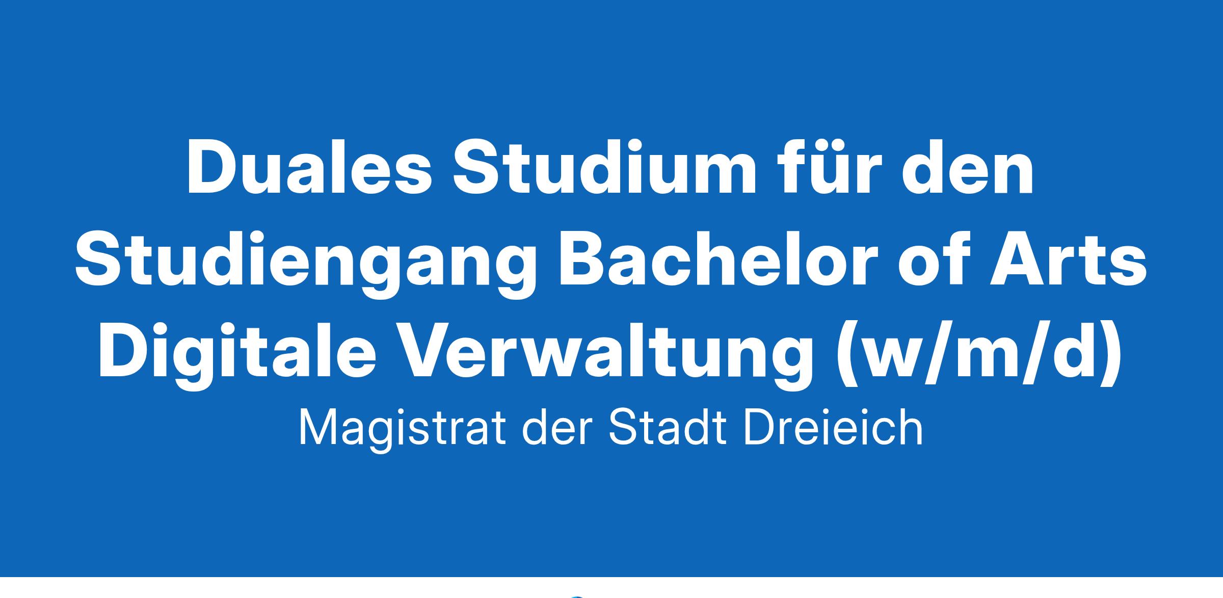 Bachelor of Arts Digitale Verwaltung (w/m/d) Gestalte mit uns die Verwaltung. Die digitale Transformation verändert unsere Verwaltung und wir wollen Strukturen und Services grundlegend neu entwickeln. Mit dem dualen Studium Bachelor of Arts Digitale Verwaltung können die wichtigen technischen und rechtlichen Kompetenzen gebündelt werden, um unsere Verwaltung weiter voranzubringen und diese bei internen Projekten zu unterstützen. In einer praxisorientierten Ausbildung sammeln die zukünftigen Studierenden bereits während der Ausbildung viel Erfahrung im Berufsumfeld. Während des Studiums wechseln sich dabei Theorie, an der Hessischen Hochschule für öffentliches Management und Sicherheit (ehemals Hessische Hochschule für Polizei und Verwaltung) – Abteilung Mühlheim am Main, und Praxis in den verschiedenen Fachbereichen der Stadt Dreieich ab. Wir suchen technikaffine Nachwuchskräfte mit Freude an interdisziplinärem Denken, die durch innovative Ideen die Modernisierung der Verwaltung vorantreiben. Das bieten wir... Ein hochwertiges Studium an der Hessischen Hochschule für öffentliches Management und Sicherheit mit ansprechender Bezahlung in Höhe von 1360,00 € Individuelle Unterstützung durch ein engagiertes Ausbildungsteam (persönliche Ansprechpartner) Spannende dreijährige Reise durch sämtliche Bereiche der Verwaltung Flexible, familienfreundliche Arbeitszeitgestaltung 30 Tage Urlaub im Jahr Betriebliches Gesundheitsmanagement Entwicklungsförderung durch interne und externe Fortbildungsangebote Kostenloses Premium-Jobticket für das gesamte RMV-Gebiet für den Weg zur Arbeit oder Trips in die Region Das suchen wir... Menschen mit Spaß und Freude an einem Job in der Verwaltung Jemanden der neugierig in die Tiefen der digitalen Welt eintauchen möchte Engagement und Flexibilität Lust eigene Projekte und Themen voranzutreiben Das erwarten wir... Abitur, Fachhochschulreife oder Hochschulzugangsberechtigung Sicherheit in Wort, Schrift, Ausdruck und Satzbau Freundliches und souveränes Auftreten Engagement für eine bürgerfreundliche und moderne Verwaltung Dienstleistungsorientierung Konzeptionelle und analystische Fähigkeiten Interkulturelle Kompetenz Der Weg zu uns... Bitte als Onlinebewerbung bis zum 30. März 2025 Ansprechpartner: Herr Andreas Feldmann Tel: 06103 601-180