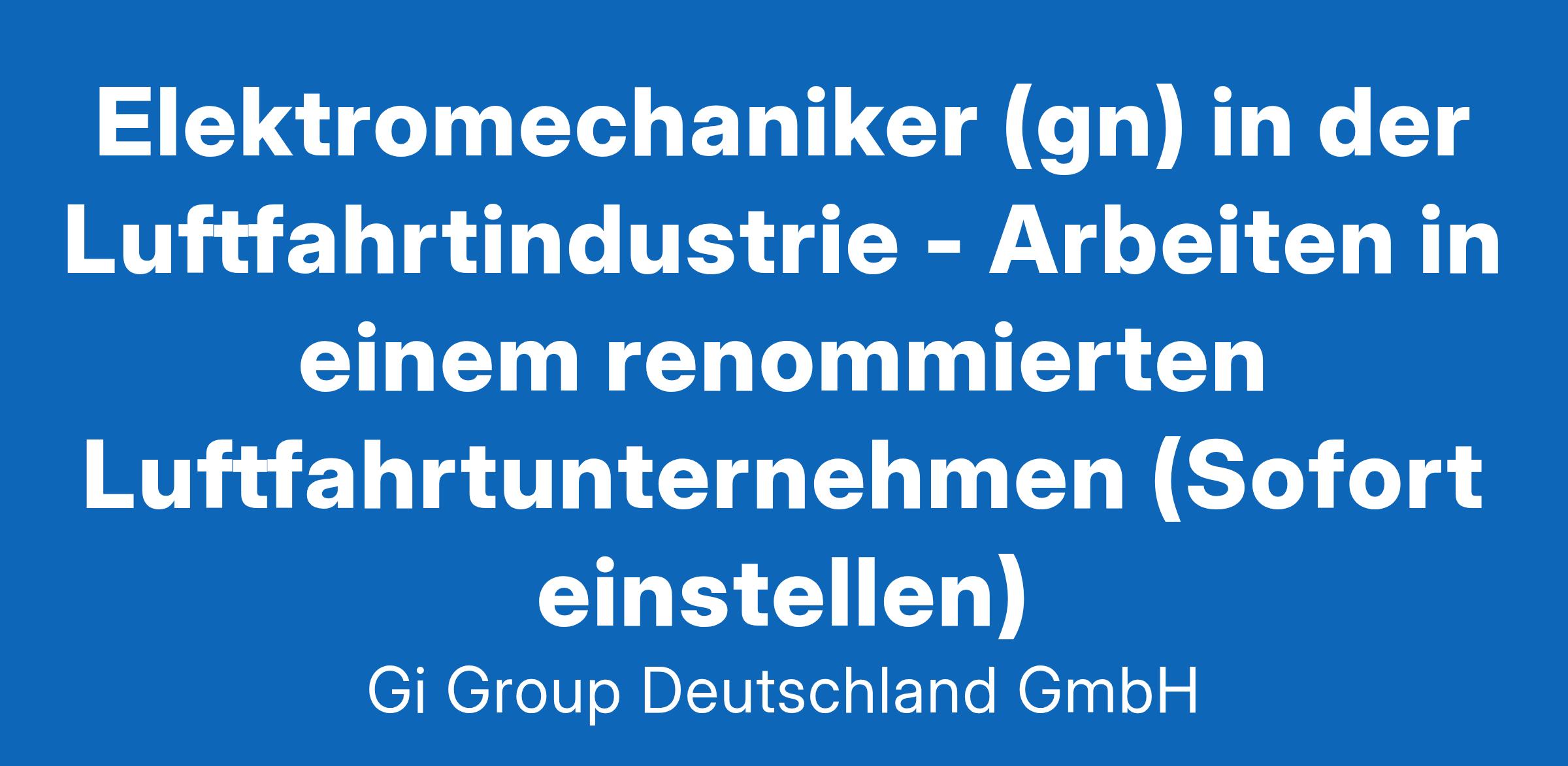 Elektromechaniker (gn) in der Luftfahrtindustrie ab sofort in Vollzeit in Hamburg im Rahmen der Direktvermittlung Die Gi Group ist ein international agierender Personaldienstleister mit mehr als 500 Standorten in 40 Ländern. Unser Kunde ist ein renommiertes und zukunftsorientiertes Unternehmen aus der Luftfahrtindustrie Deine Aufgaben Ausführung von Reparaturen an elektromechanischen Bauteilen und Geräten Fehlerdiagnosen an elektromechanischen Fluggeräten oder Baugruppen unter Anwendung von Messgeräten, Test- und Prüfeinrichtungen durchführen Mit technischen Unterlagen arbeiten und die Dokumentation entsprechend pflegen Dein Profil Eine abgeschlossene Berufsausbildung in einem luftfahrttechnischen Bereich, z.B. Fluggerätelektronik Alternativ ist eine abgeschlossene Berufsausbildung in einem Beruf mit Schwerpunkt Mechatronik, z.B. Mechatroniker, Elektromechaniker oder eine gleichwertige Qualifikation wünschenswert Fachkenntnisse in der Wartung, Instandhaltung und Montage Bereitschaft zum Erwerb fehlender Qualifikationen sowie zu berufsbezogener Weiterbildung Gute Englischkenntnisse Unser Angebot Urlaubs- und Weihnachtsgeld sowie eine Gewinnbeteiligung Flexible Arbeitszeiten (Gleitzeit, keine Schichtarbeit) und 30 Tage Urlaub Flugvergünstigungen, Einkaufsrabatte in Geschäften und Jobrad-Leasing Kostenloses Parken, betriebliche Altersvorsorge und Verpflegungszuschuss für die Kantine Deine Bewerbung Für Deine Bewerbung Elektromechaniker in der Luftfahrtindustrie klicke bitte einfach auf „Jetzt bewerben“. Dort kannst Du Deine Kontaktdaten eingeben sowie Deinen Lebenslauf und Deine Bewerbungsunterlagen hochladen. Du benötigst dafür nur ca. 1 Minute. Dein zuständiger Personaldisponent wird sich bei Dir schnellstmöglich melden. Gerne kannst Du uns auch Deine Bewerbungsunterlagen per E-Mail zusenden. Wir freuen uns auf Deine Bewerbung! Unsere Stellenangebote richten sich an Arbeitssuchende jeglichen Geschlechts. (gn) = geschlechtsneutral. Kontakt Gi Group Recruiting Team