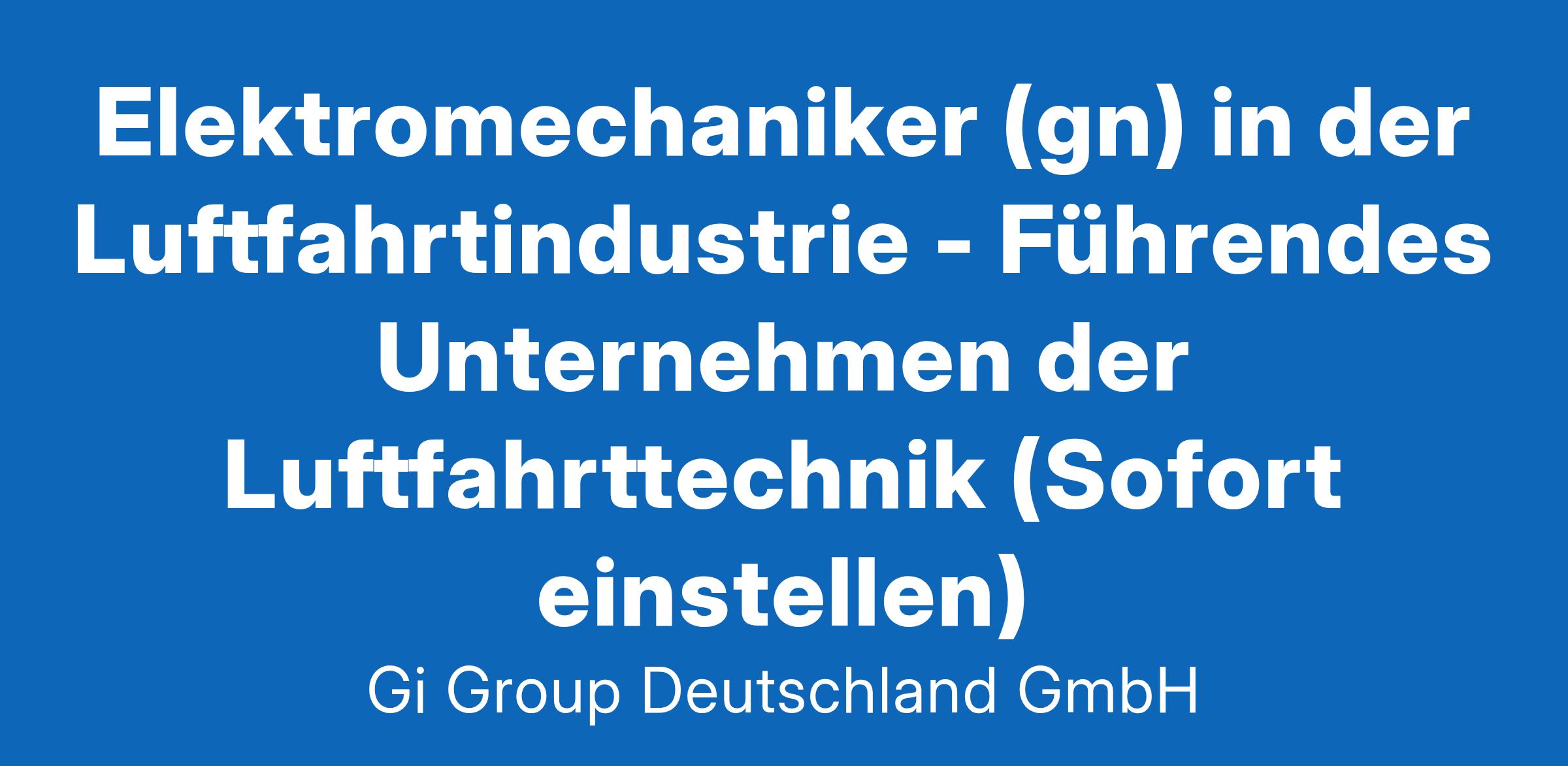 Elektromechaniker (gn) in der Luftfahrtindustrie ab sofort in Vollzeit in Hamburg im Rahmen der Direktvermittlung Die Gi Group ist ein international agierender Personaldienstleister mit mehr als 500 Standorten in 40 Ländern. Unser Kunde ist ein renommiertes und zukunftsorientiertes Unternehmen aus der Luftfahrtindustrie Deine Aufgaben Ausführung von Reparaturen an elektromechanischen Bauteilen und Geräten Fehlerdiagnosen an elektromechanischen Fluggeräten oder Baugruppen unter Anwendung von Messgeräten, Test- und Prüfeinrichtungen durchführen Mit technischen Unterlagen arbeiten und die Dokumentation entsprechend pflegen Dein Profil Eine abgeschlossene Berufsausbildung in einem luftfahrttechnischen Bereich, z.B. Fluggerätelektronik Alternativ ist eine abgeschlossene Berufsausbildung in einem Beruf mit Schwerpunkt Mechatronik, z.B. Mechatroniker, Elektromechaniker oder eine gleichwertige Qualifikation wünschenswert Fachkenntnisse in der Wartung, Instandhaltung und Montage Bereitschaft zum Erwerb fehlender Qualifikationen sowie zu berufsbezogener Weiterbildung Gute Englischkenntnisse Unser Angebot Urlaubs- und Weihnachtsgeld sowie eine Gewinnbeteiligung Flexible Arbeitszeiten (Gleitzeit, keine Schichtarbeit) und 30 Tage Urlaub Flugvergünstigungen, Einkaufsrabatte in Geschäften und Jobrad-Leasing Kostenloses Parken, betriebliche Altersvorsorge und Verpflegungszuschuss für die Kantine Deine Bewerbung Für Deine Bewerbung Elektromechaniker in der Luftfahrtindustrie klicke bitte einfach auf „Jetzt bewerben“. Dort kannst Du Deine Kontaktdaten eingeben sowie Deinen Lebenslauf und Deine Bewerbungsunterlagen hochladen. Du benötigst dafür nur ca. 1 Minute. Dein zuständiger Personaldisponent wird sich bei Dir schnellstmöglich melden. Gerne kannst Du uns auch Deine Bewerbungsunterlagen per E-Mail zusenden. Wir freuen uns auf Deine Bewerbung! Unsere Stellenangebote richten sich an Arbeitssuchende jeglichen Geschlechts. (gn) = geschlechtsneutral. Kontakt Gi Group Recruiting Team